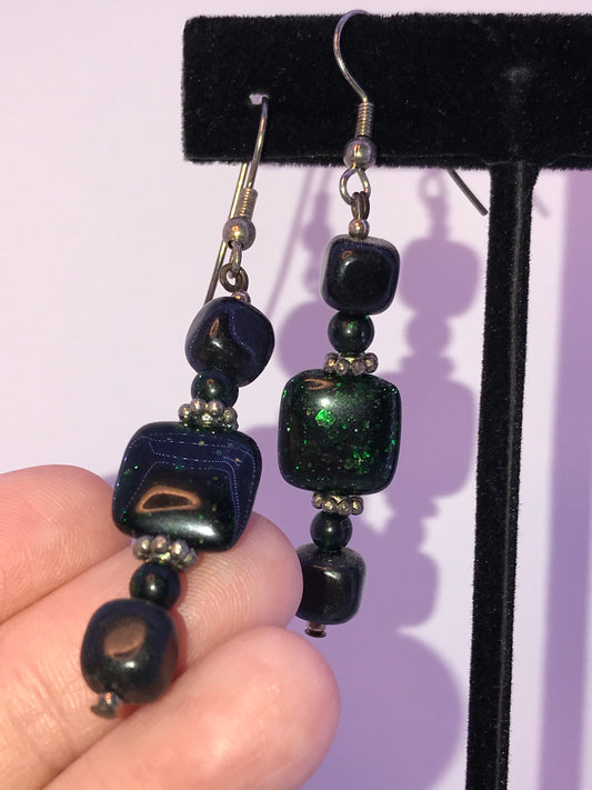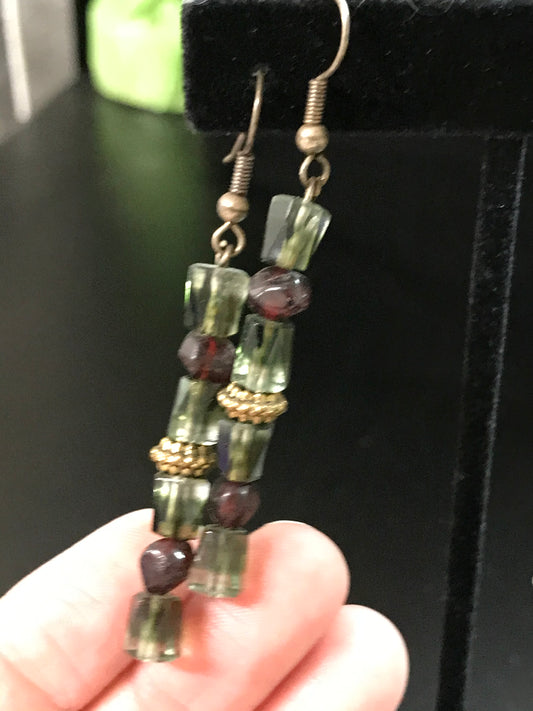 Green and Purple Czech Glass Dangle Earrings
