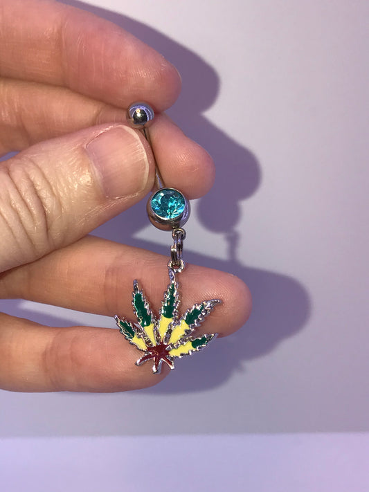 Aqua Blue Gem Dark Rasta Pot Leaf Dangle Belly Ring