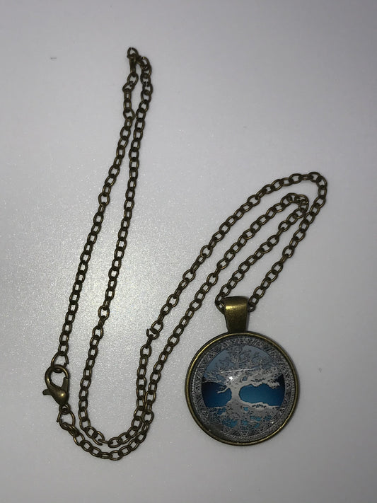 18" Blue Tree and Reflection Brass Necklace