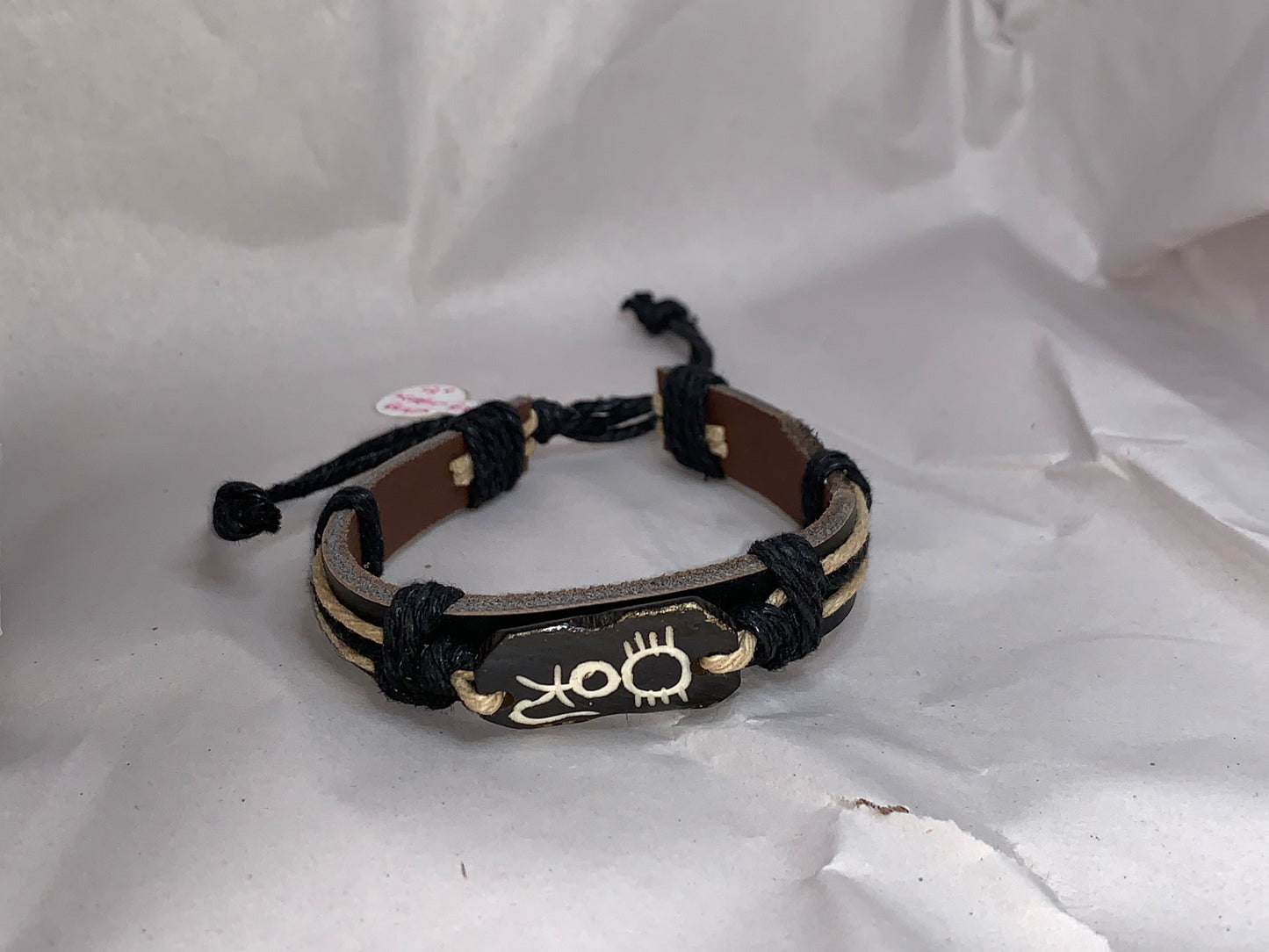 12" Long adjustable bracelet or anklet. Leather that is two shades of beige against black with a coconut shell focal with a cat carved into it. It also has Hemp on it to help attach the focal bead. Only the top of the leather has been dyed black.