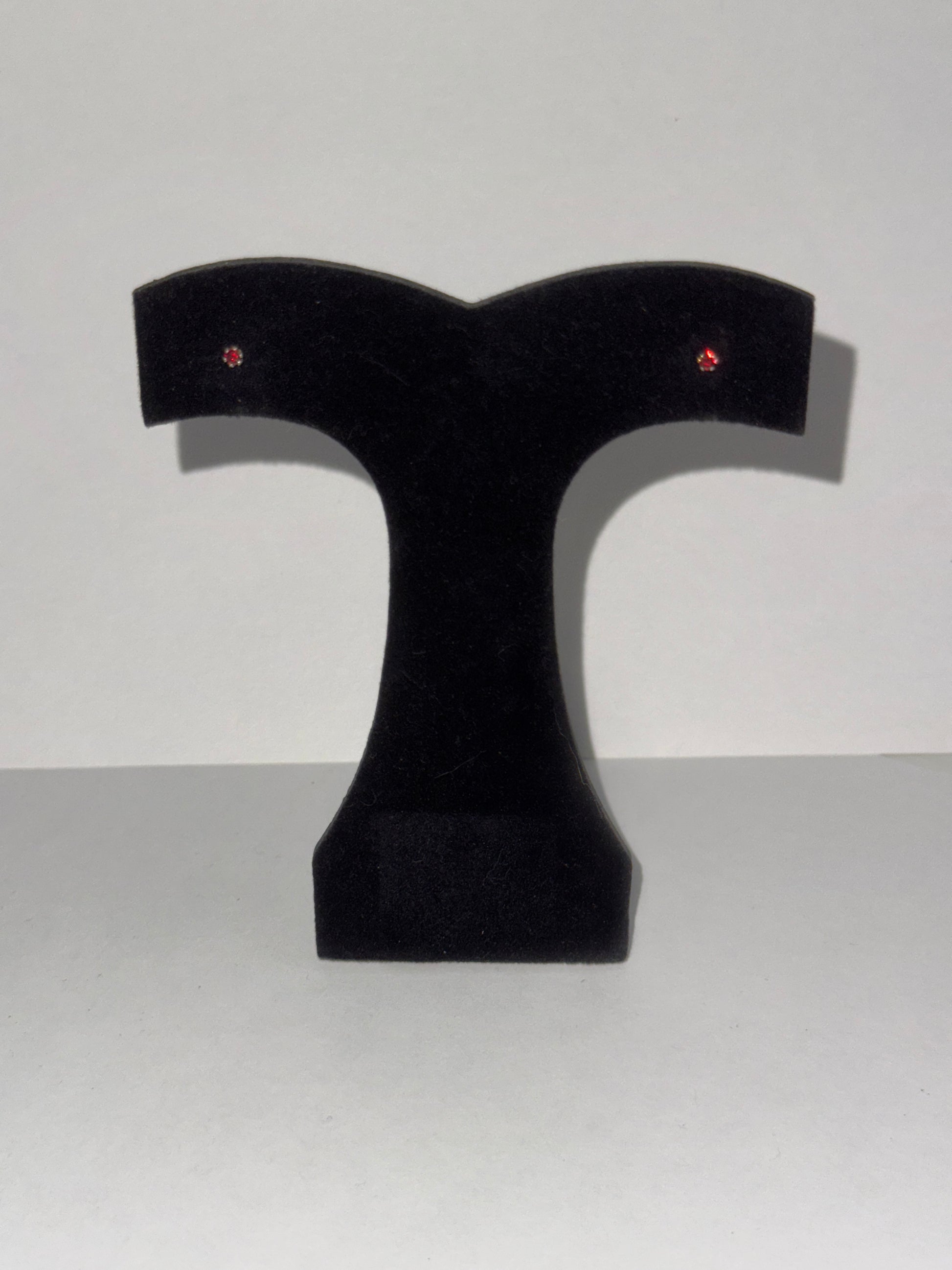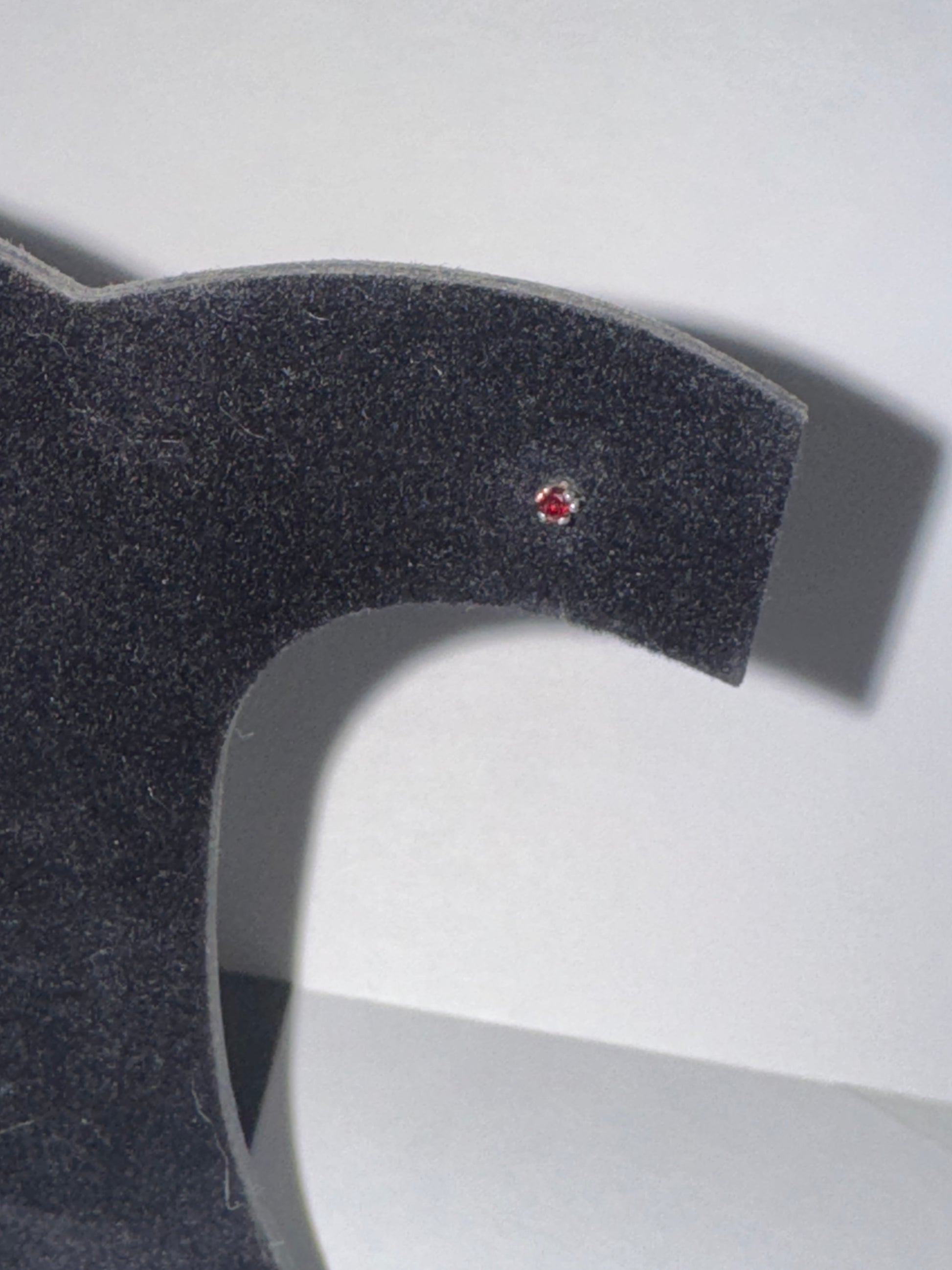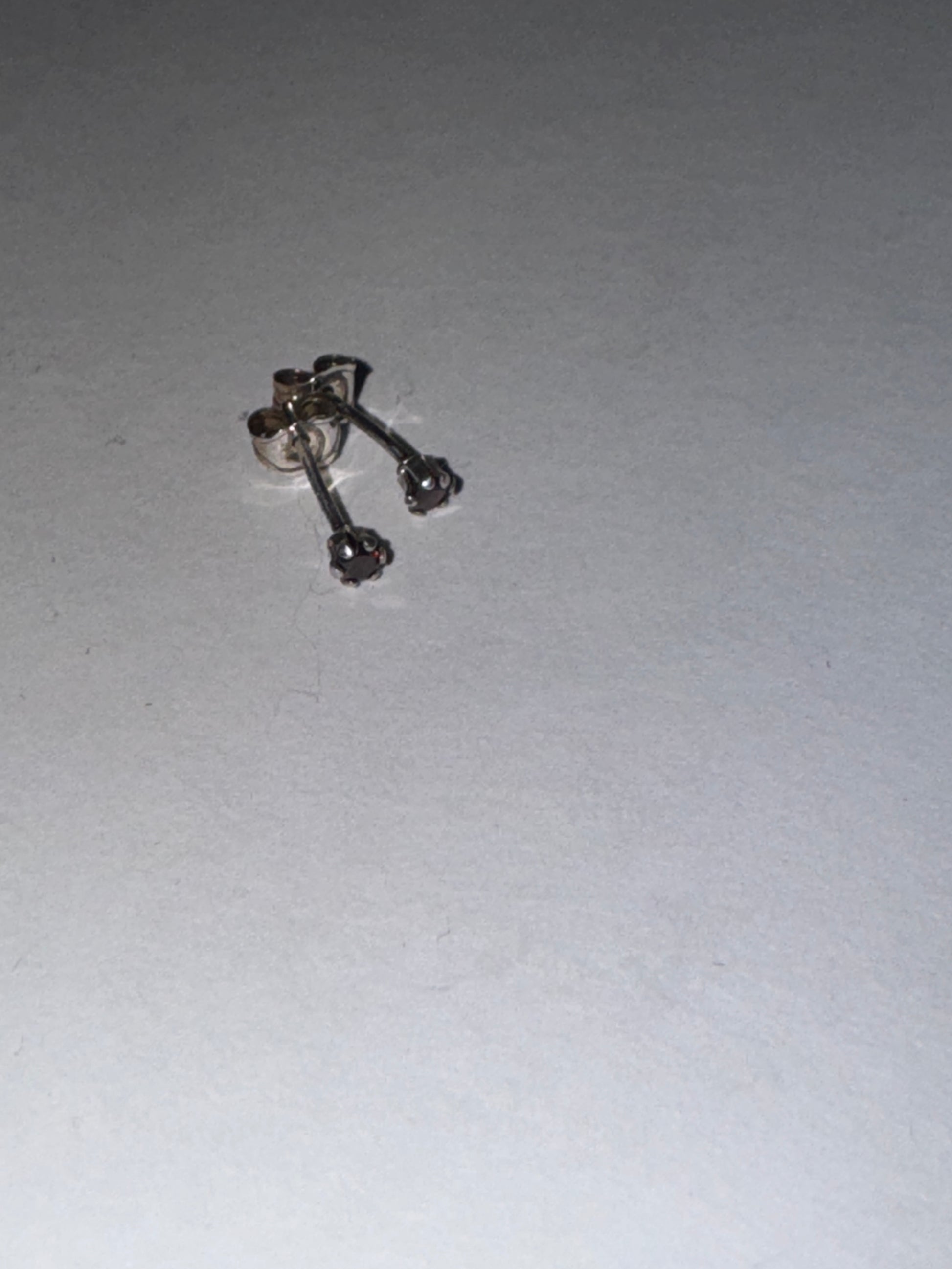 2 mm round cubic Zirconia set in solid sterling silver post/stud earrings. This pair happens to have a pair of red cubic zirconia's in them most know them as CZ's. They are a really dark red shade and look nearly black until hit with light. These measure 2.55mm in diameter and they weigh 0.25 grams. These earrings have been polished and will ship in a jewelers baggie with an anti-tarnish paper.