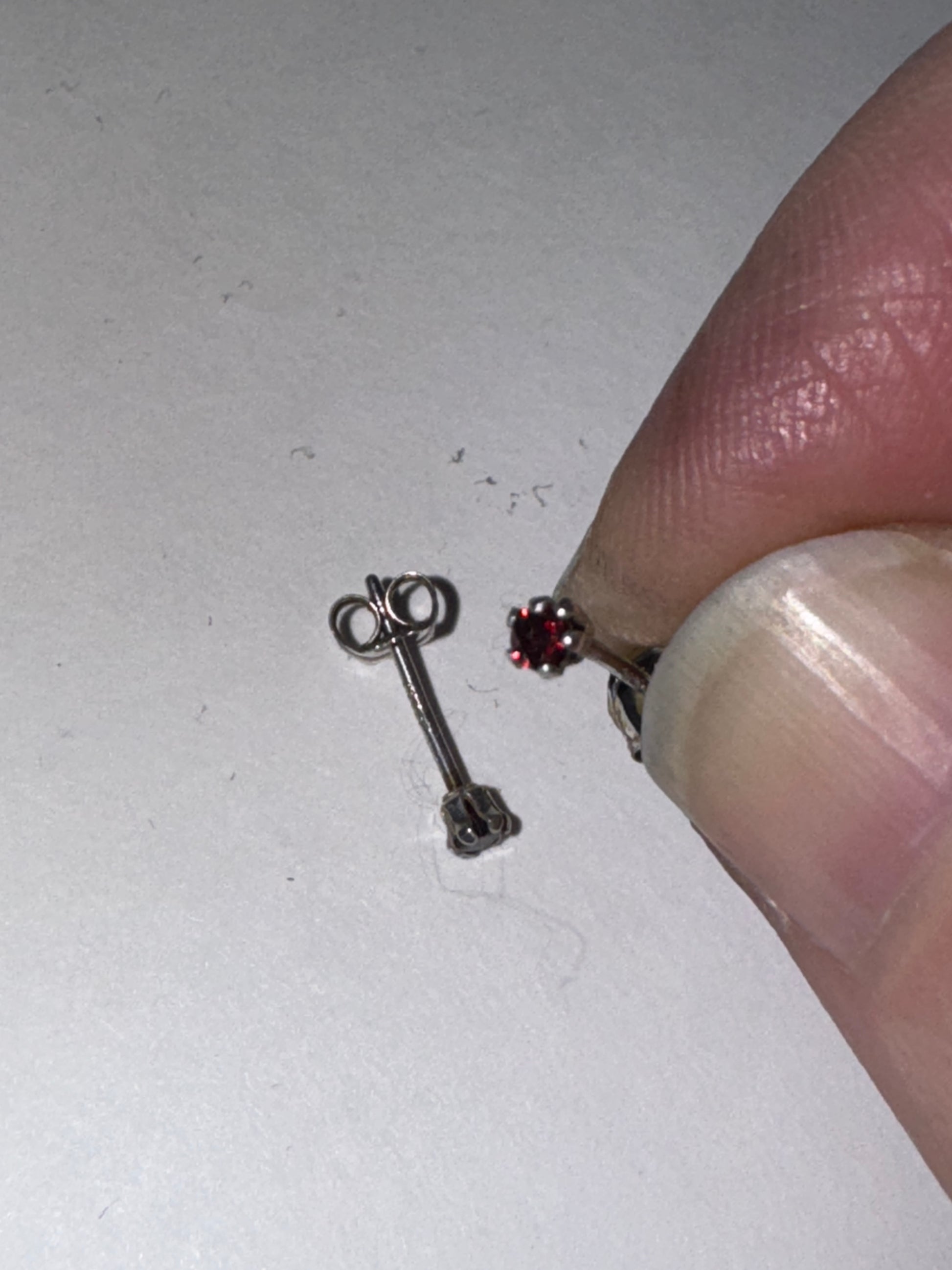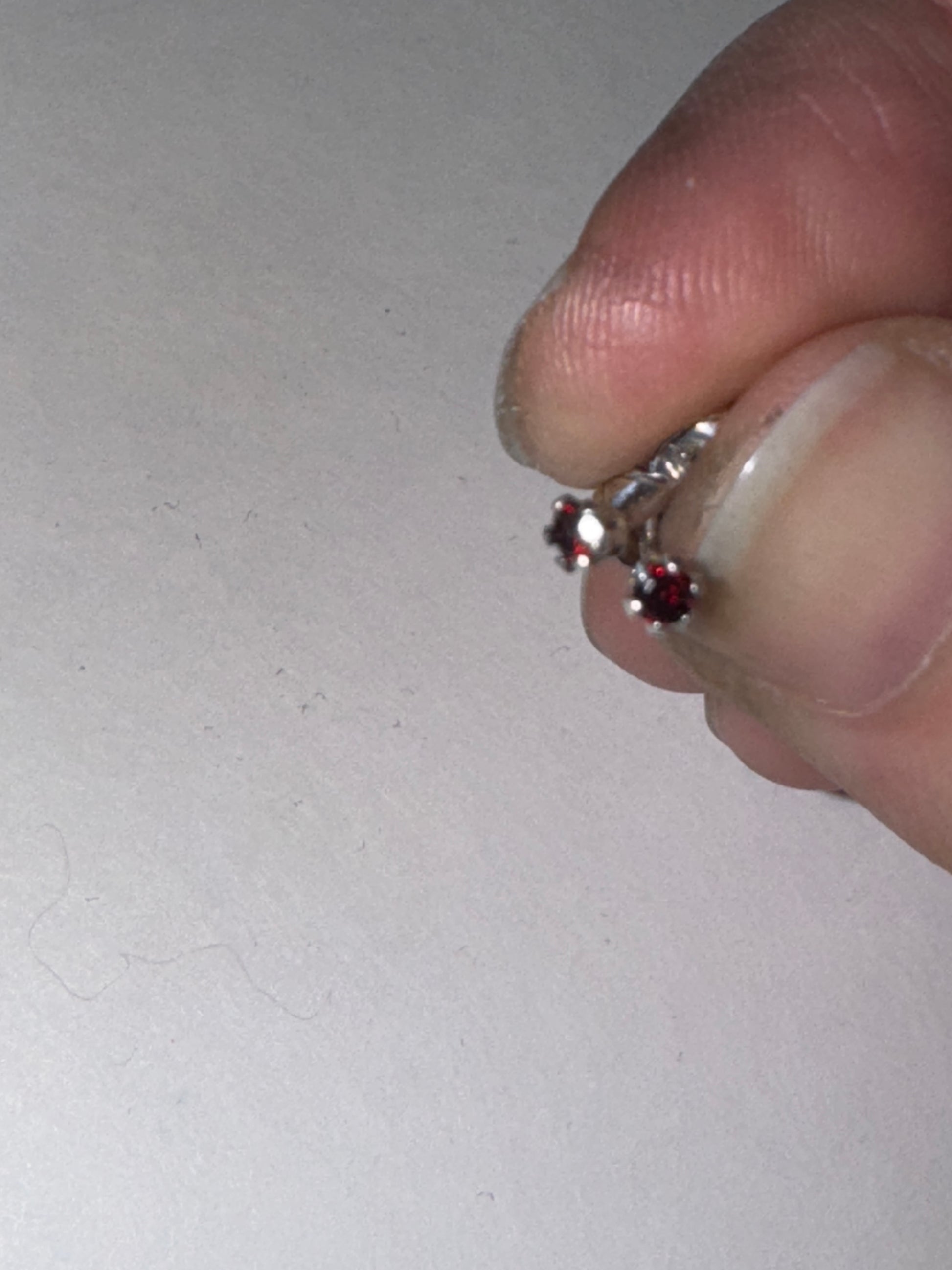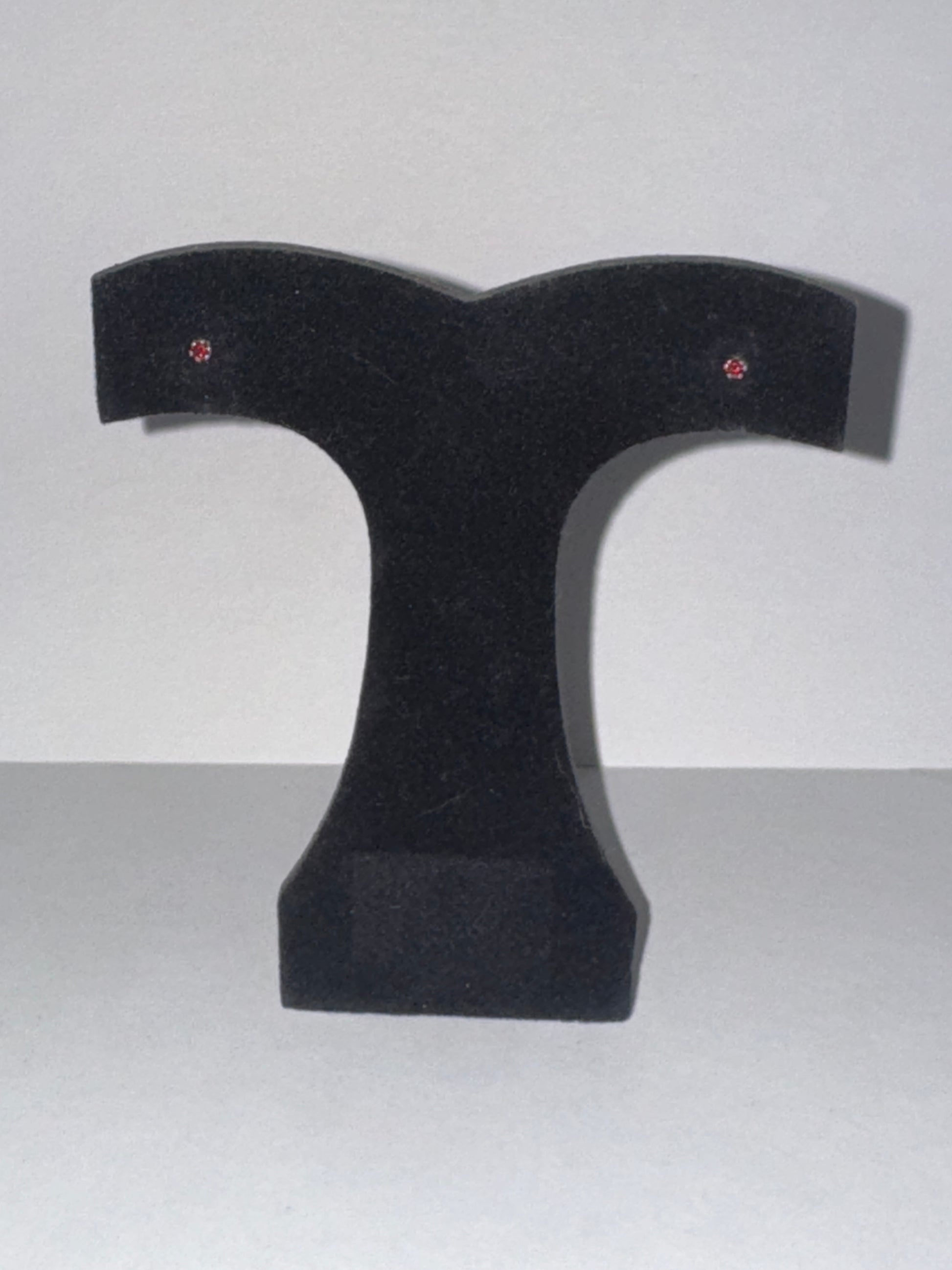 2 mm round cubic Zirconia set in solid sterling silver post/stud earrings. This pair happens to have a pair of red cubic zirconia's in them most know them as CZ's. They are a really dark red shade and look nearly black until hit with light. These measure 2.55mm in diameter and they weigh 0.25 grams. These earrings have been polished and will ship in a jewelers baggie with an anti-tarnish paper.