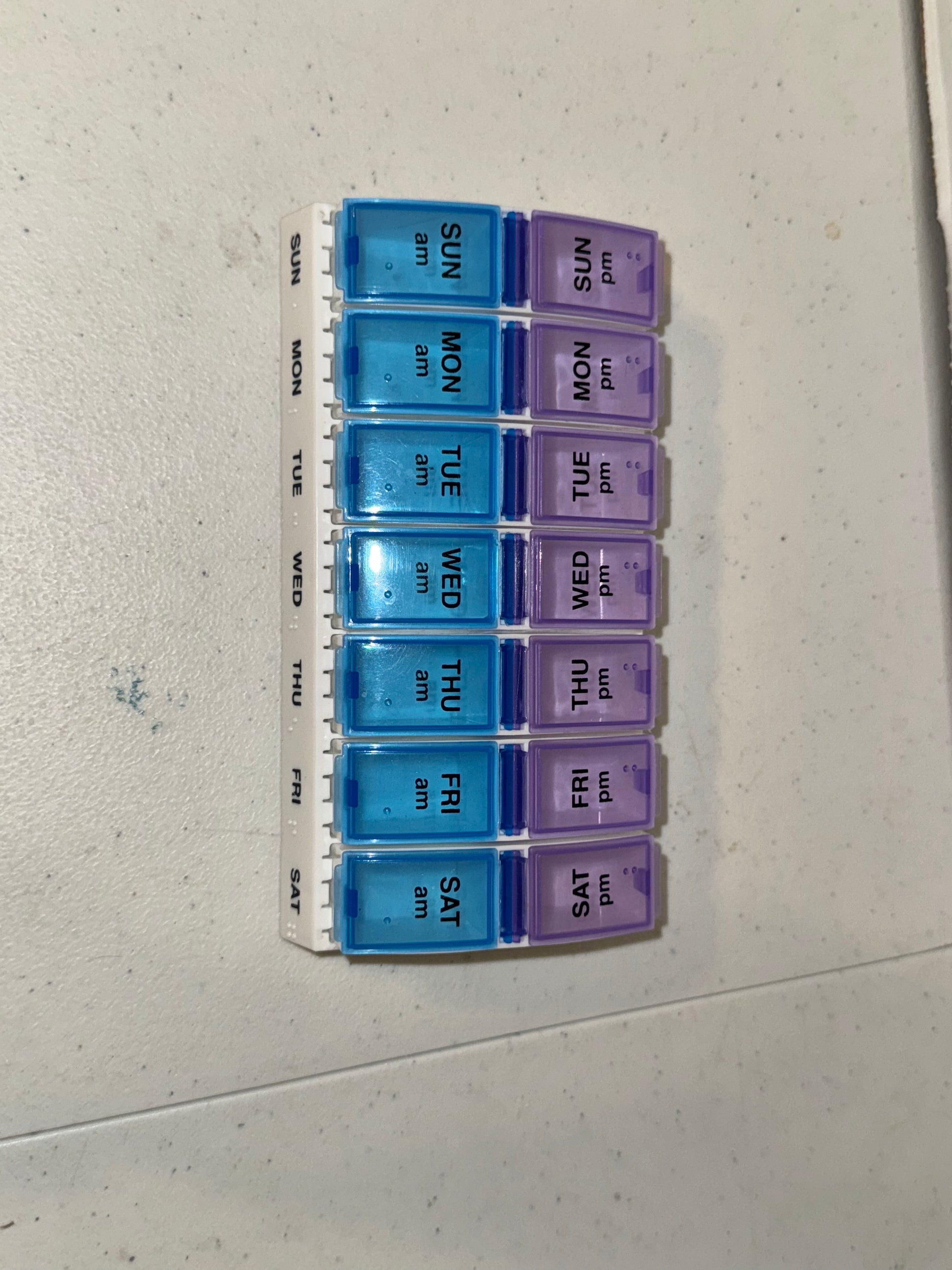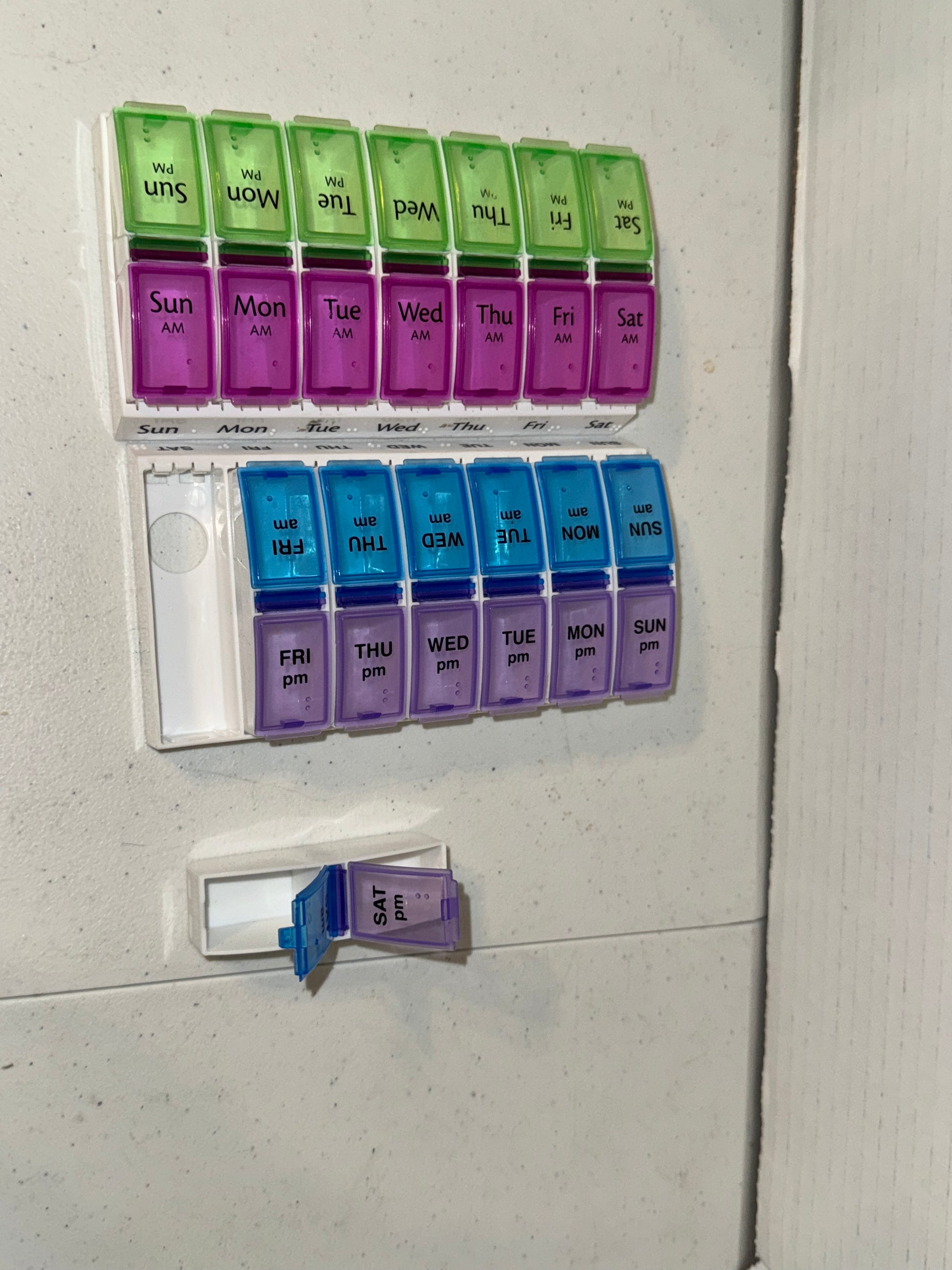 These are two pill boxes that bought to sort out two weeks of meds for me to stay in line and never forget my meds. I now have a large box that has am, noon, afternoon and night where I can split 2 weeks of meds up into one box, and not have to refill them as often and I can let these two individual boxes go.