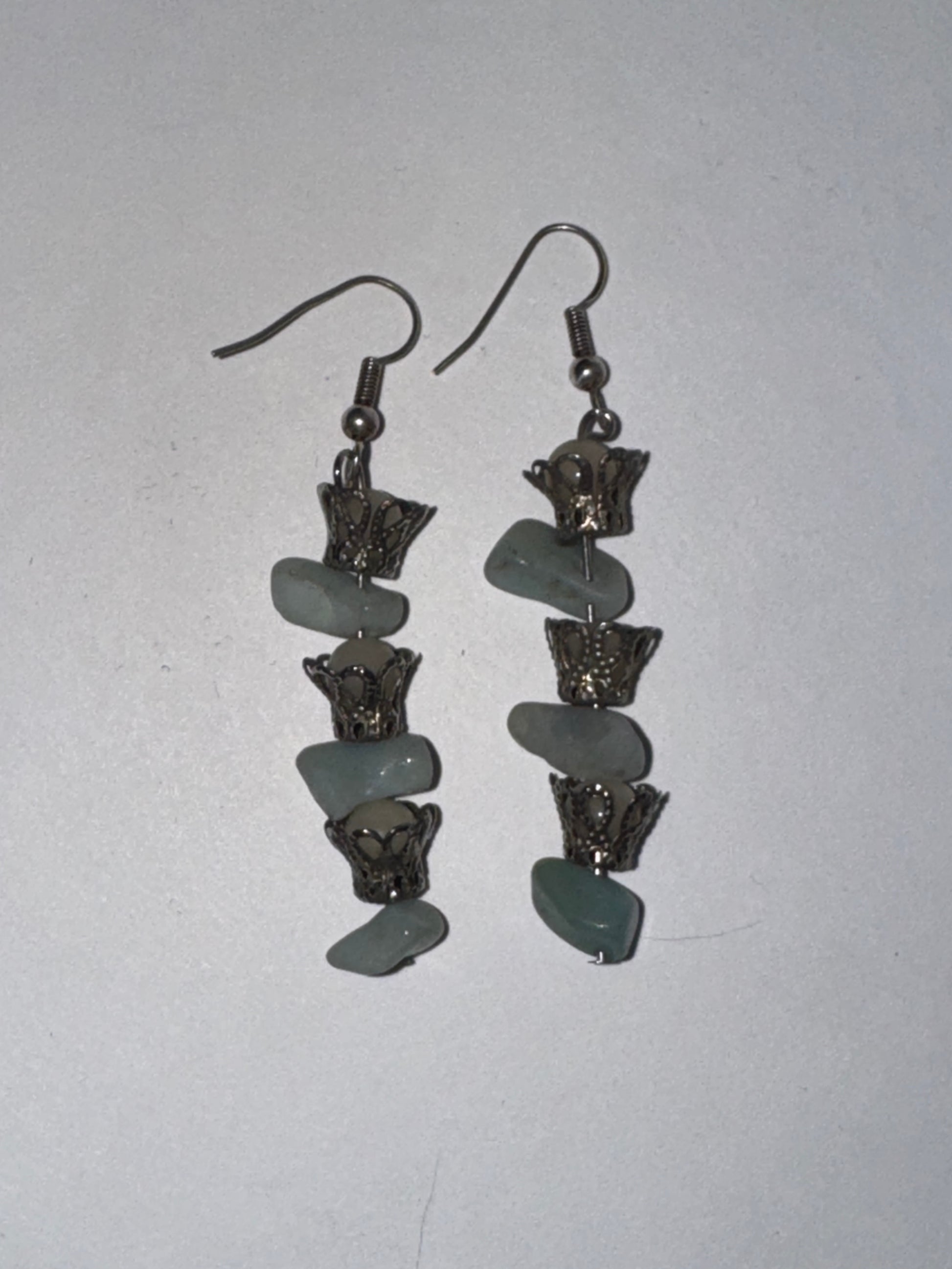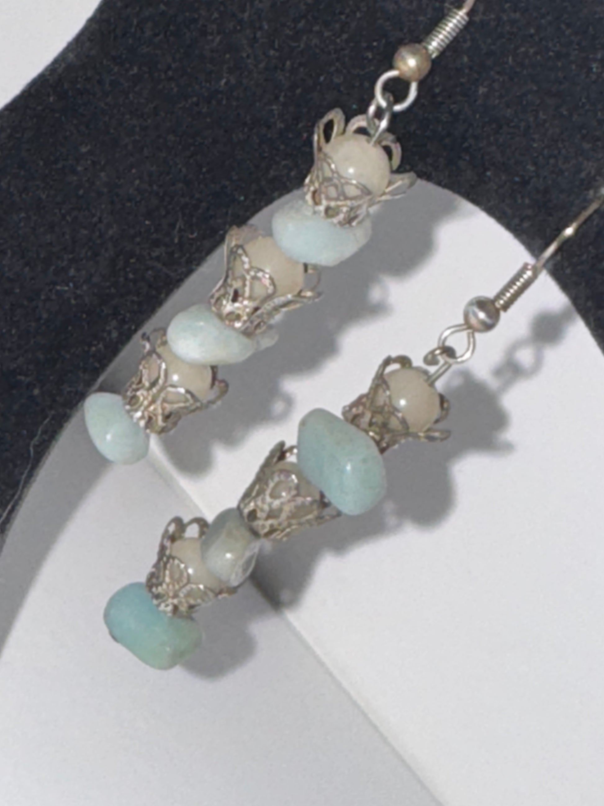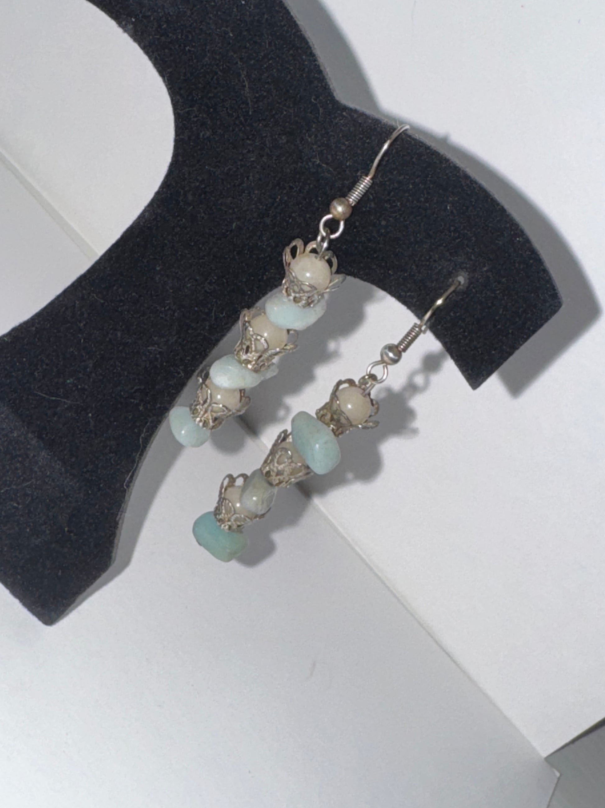 These Amazonite and Jade Dangle Earrings feature Amazonite chip beads and 6mm round Jade beads in sterling silver cups. I put these on sterling silver T-wires with Sterling silver Fish hook ear wires with a Spring and coil feature. These are handmade earrings. I can ship them with a silicone ear stopper if you prefer, just add a note to the order when buying if you want that. If not they wills hip without it.