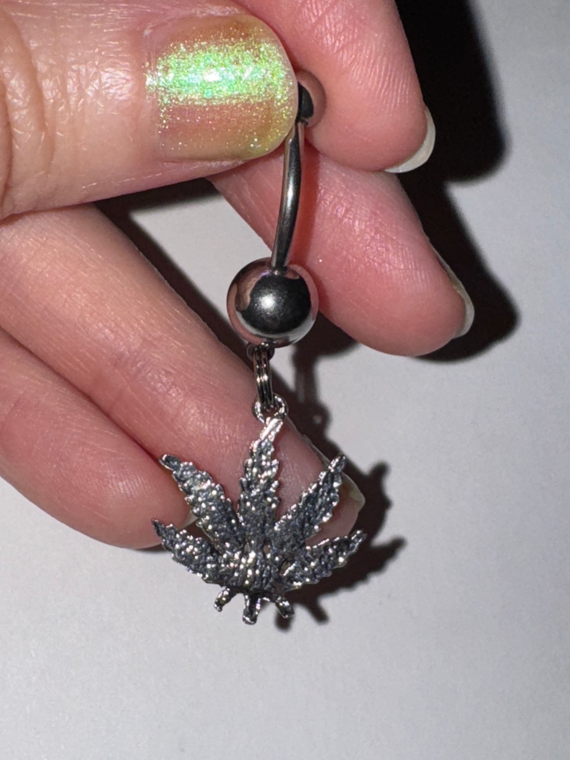 This is a 316-l stainless steel belly ring with a dangle of a pot leaf design. The ring in the middle is a split or spring ring. It's designed this way so your charm stays on your belly ring. If you want a different color belly ring let me know I can change them out.