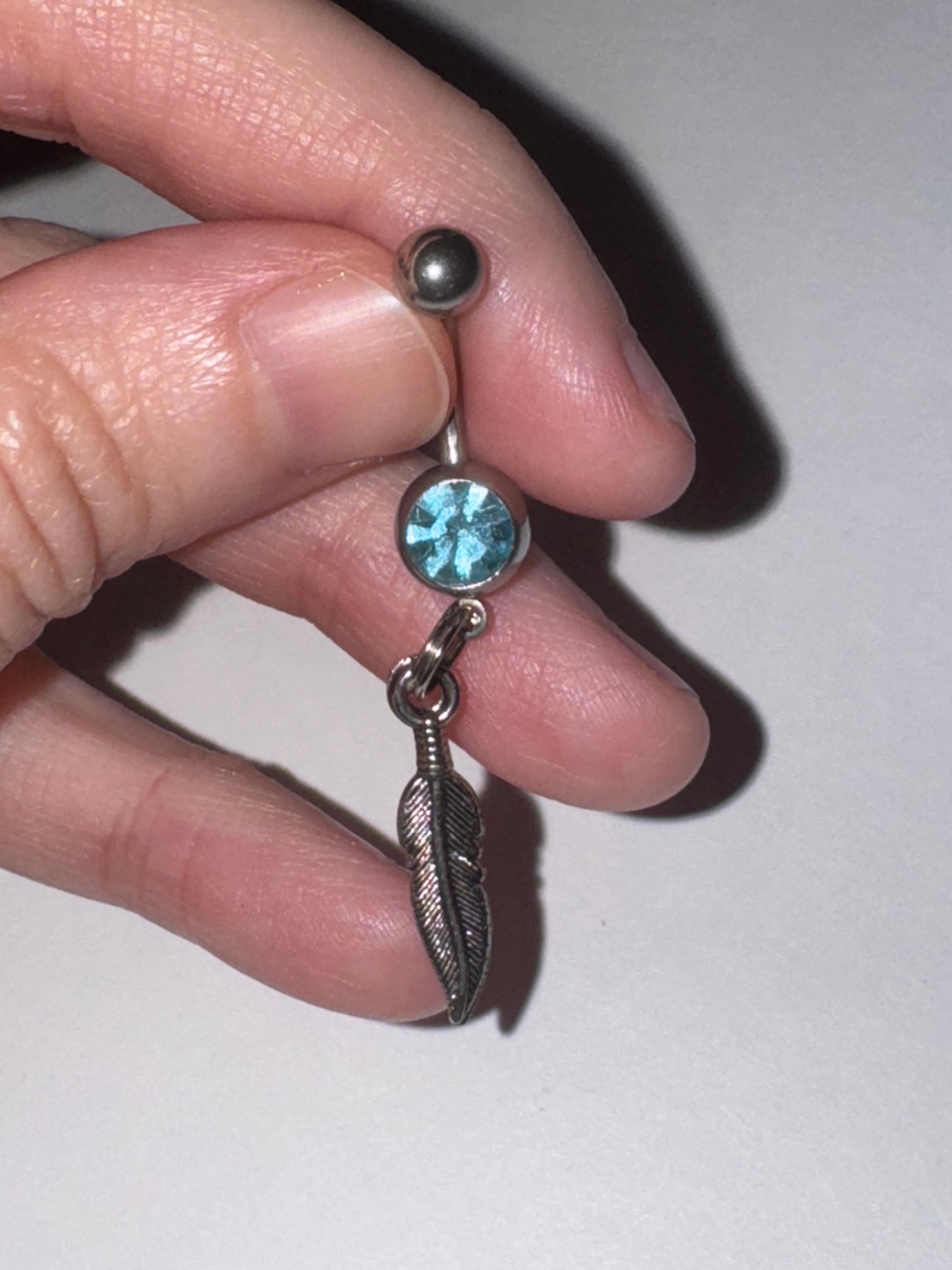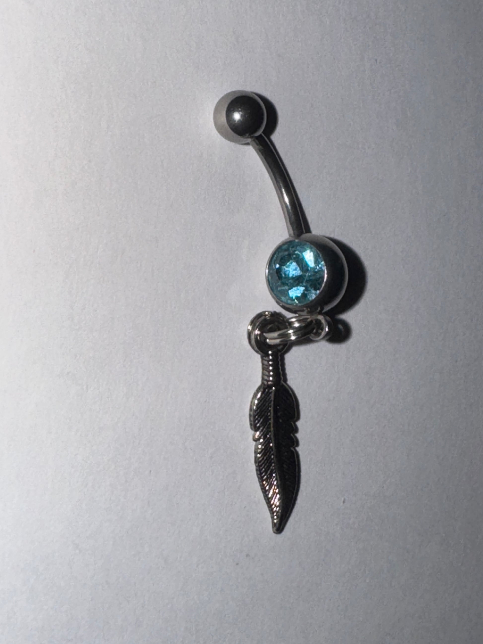 This belly ring has a plastic Feather and a Aqua blue gem on the belly ring.