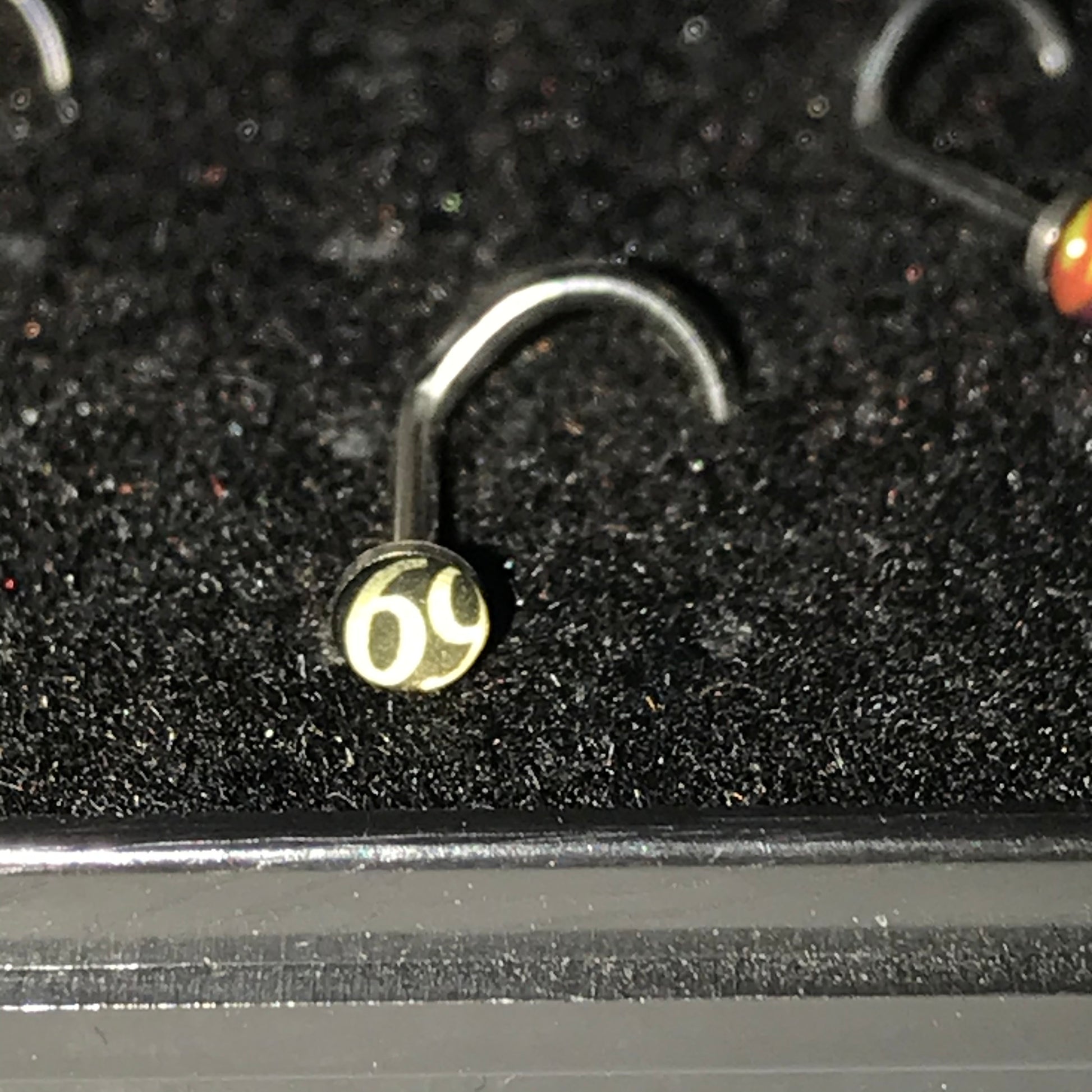 These are 18 gauge C-shaped nose rings. They each have a Design on them that is 3mm round. The nose ring design is Black and white 69. This nose rings is 316-L surgical steel.