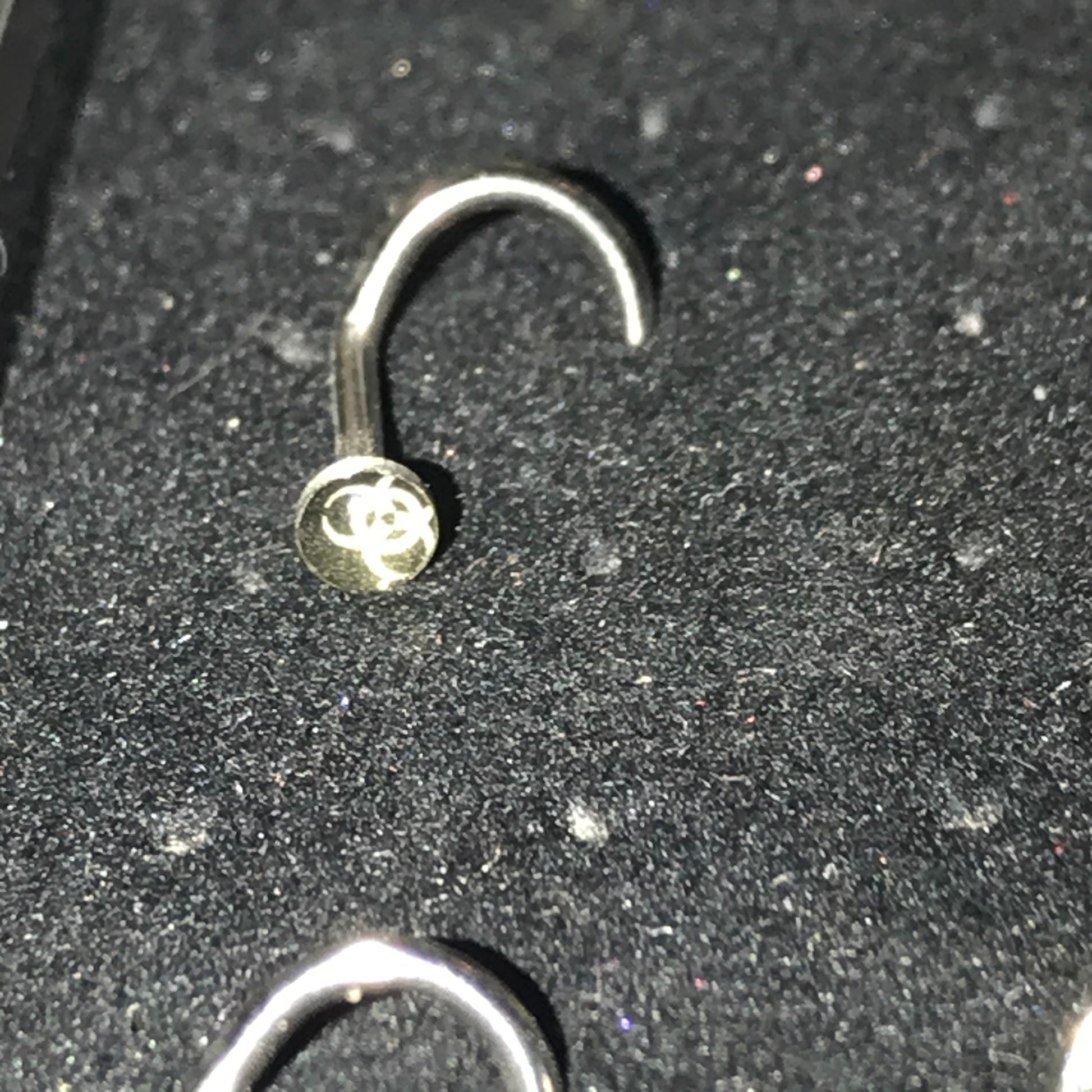 These are 18 gauge C-shaped nose rings. They each have a Design on them that is 3mm round. The nose ring design is Black and White Biohazard. This nose rings is 316-L surgical steel.
