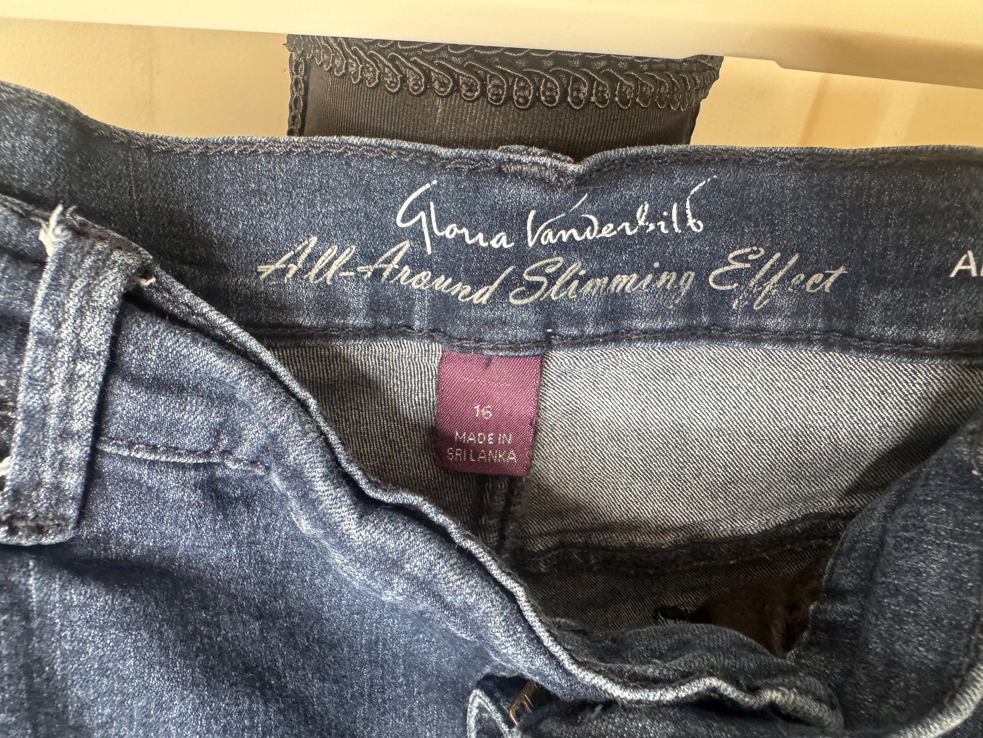 Blue Gloria Vanderbilt Long Shorts, Style Amanda, Size 16. These are super stretchy and super comfy to wear. These are a dark blue color and they are long like down to my knees. They say "All Around Slimming Effect" on the waistband along with the word Amanda and these are a size 16. They are made in SRi Lanka made out of 79% Cotton, 20% polyester, 1%elastane. There are 5 pockets on these shorts, 4 normal size and one coin pocket.