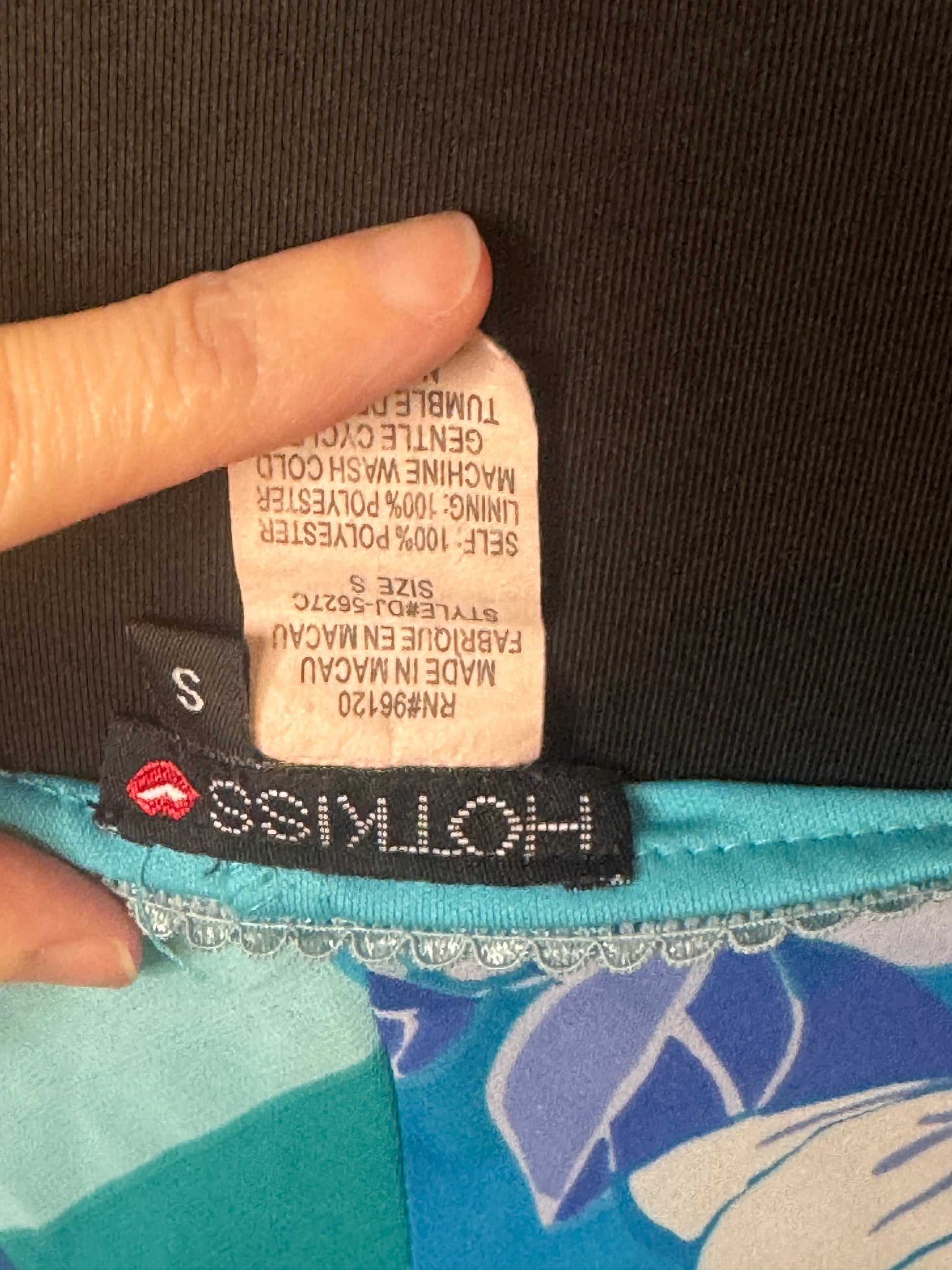 This is a cute y2K dress. This spaghetti Strap Blue floral dress has a sideways slant. There is a tie on the side but in my last move the string that went there got lost in a box and I have yet to find it. If I do find it, it will go with the dress when I ship it out. There are 6 tie holes on the side ties. I used to wear this dress all the time but since I am now moving again I need to sell off half my closet. This dress is made in Macau. This is 100% polyester. RN #96120.