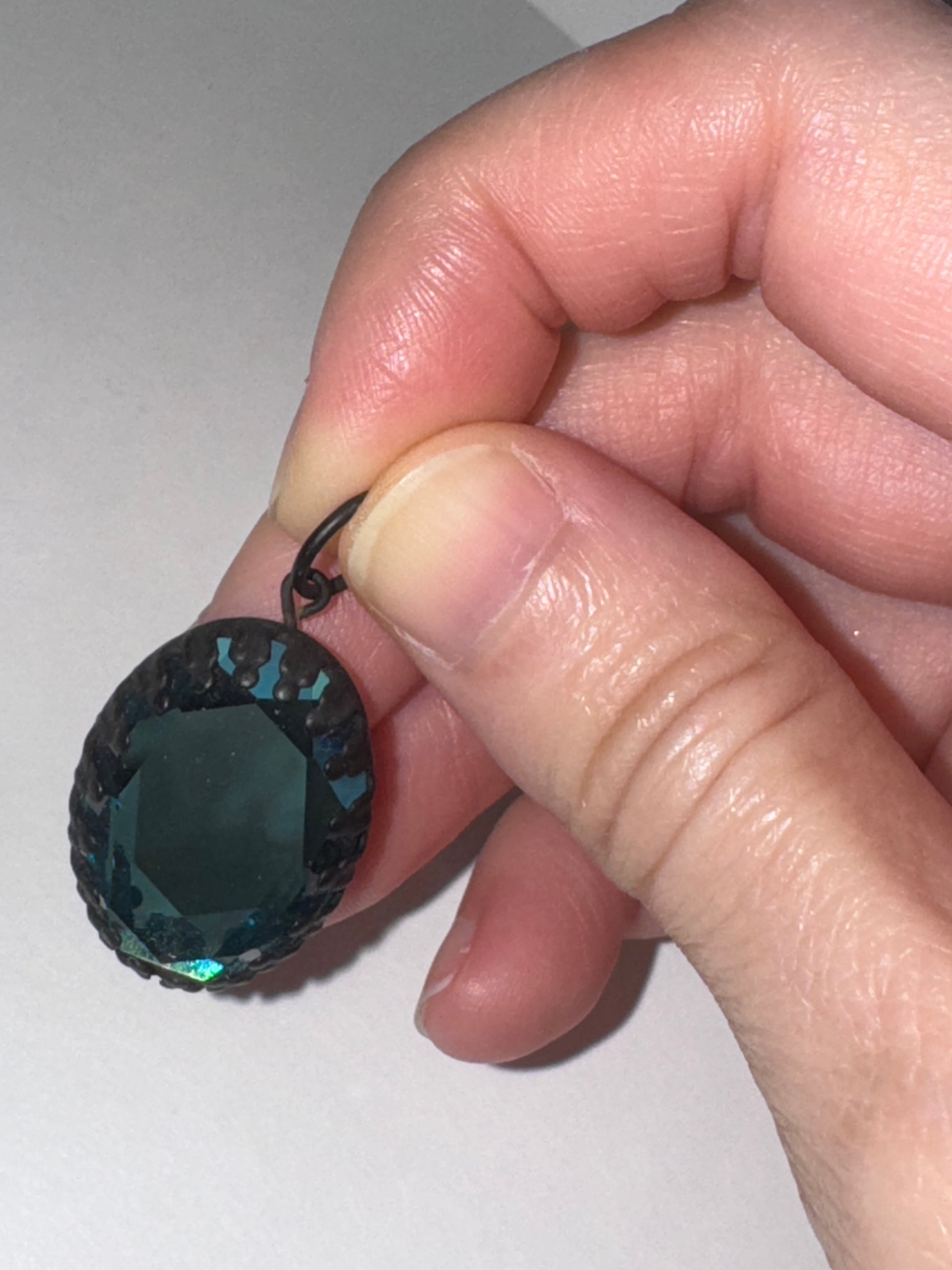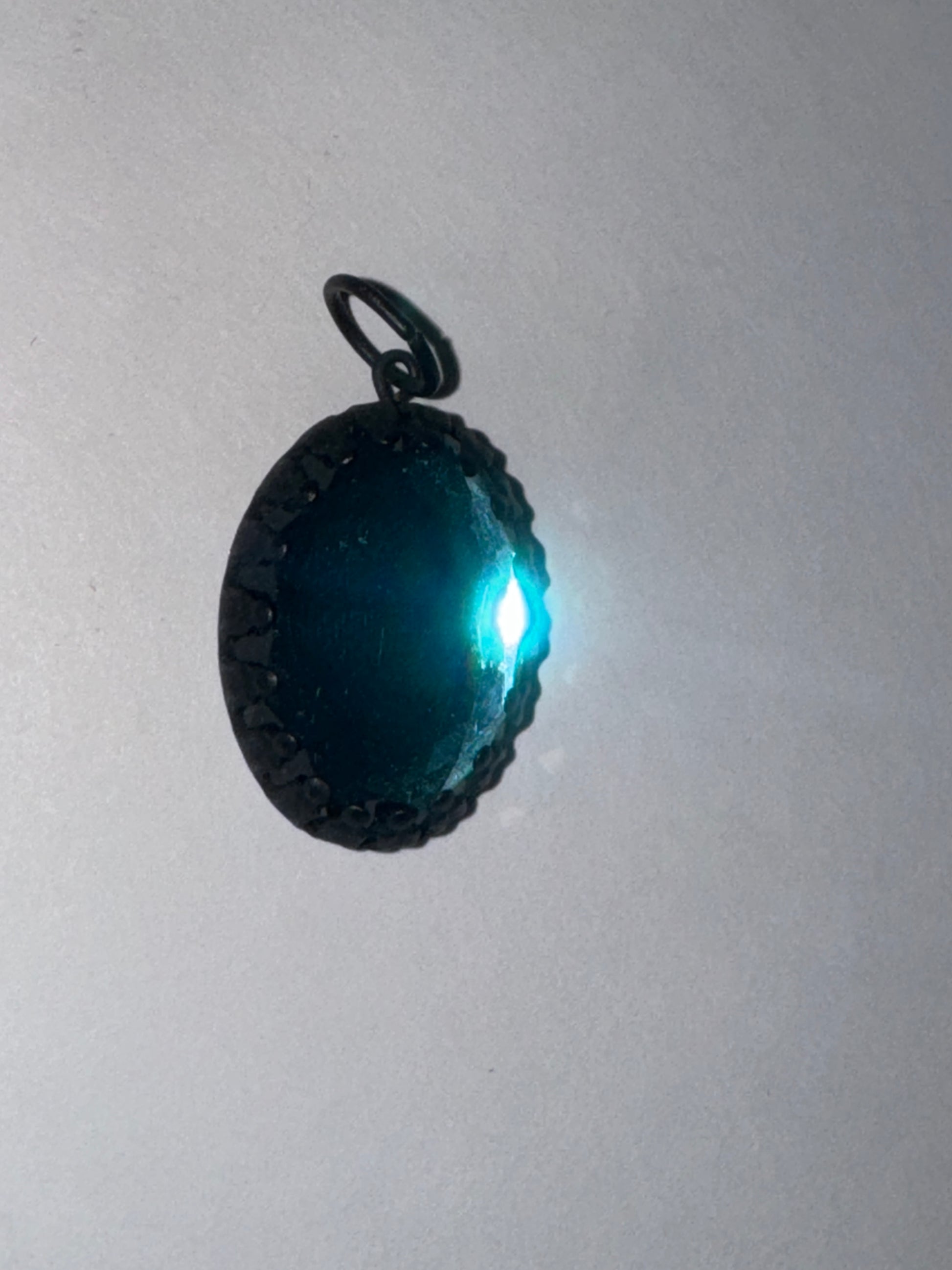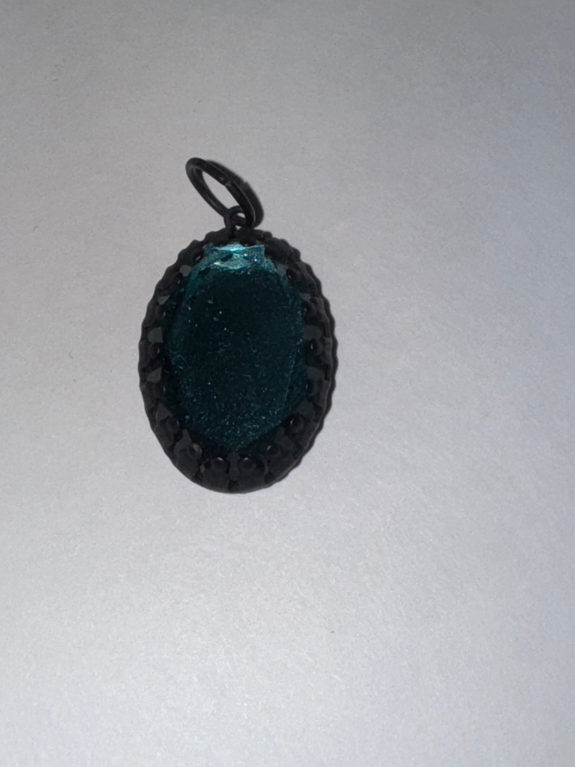 This matte black pendant measure 26x19mm and is made out of pewter. The blue stone in the center is actually glass.