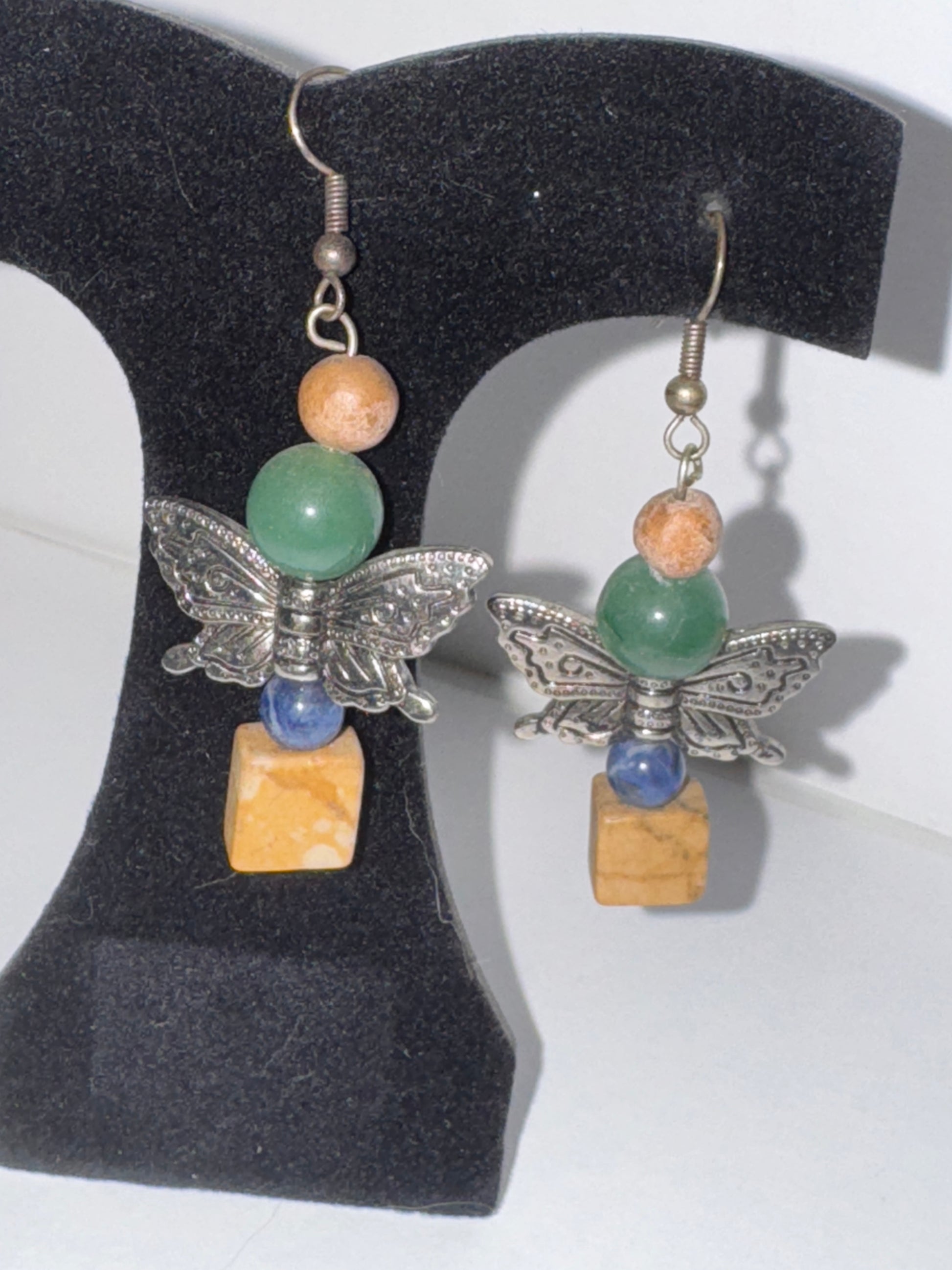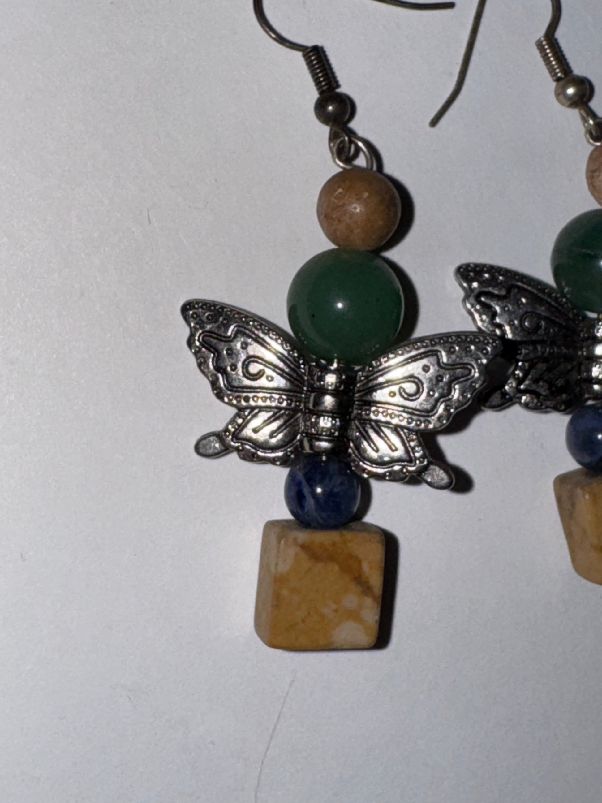 These Butterfly dangle earrings feature a natural brown silkstone bead, a green aventurine bead, a denim lapis bead, and a brown desert marble bead. In the center is a pewter butterfly. The earring wires are made out is .925 Sterling Silver. These earrings weigh 15.09 grams.
