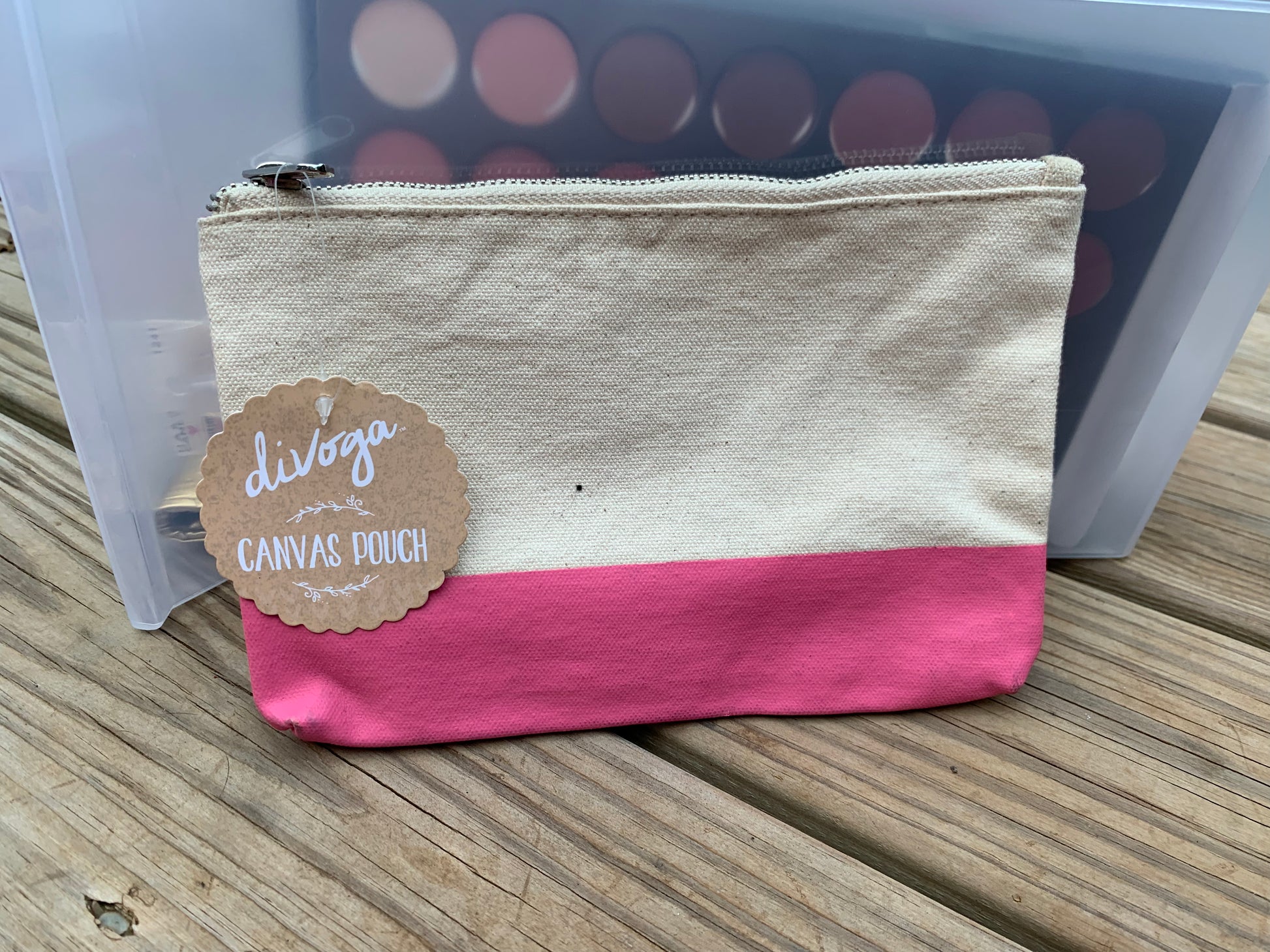 This is a bag that is made out of a cream colored canvas with a 2" pink protective stripe at the bottom which makes it more resistant to spills. This canvas pouch is made by Divoga. You can use this for makeup, pencils, office/school supplies, a clutch, or so much more.