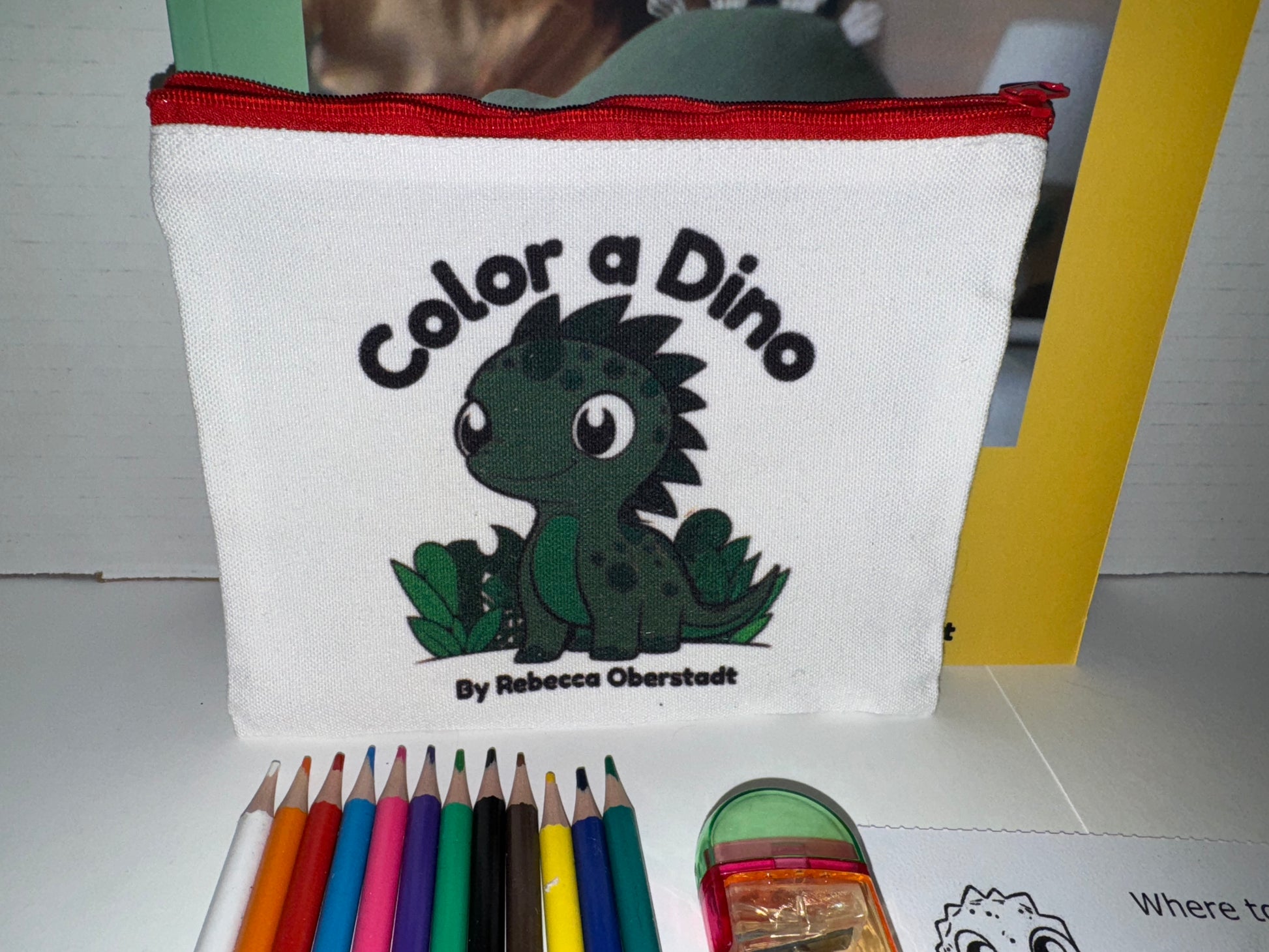 This is a 8" by 6" canvas zipper pouch that I made into a colored pencil/pencil pouch to go with my Color a Dino Coloring and Activity Book I published in March of 2025. The image is pulled right from the coloring book, and colored by me Rebecca.