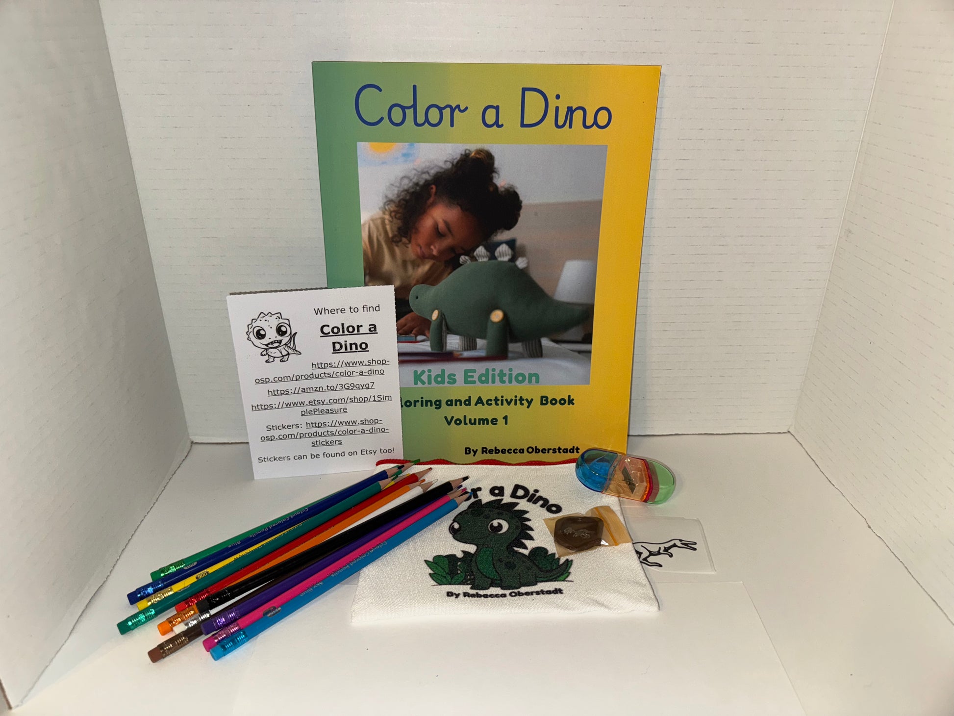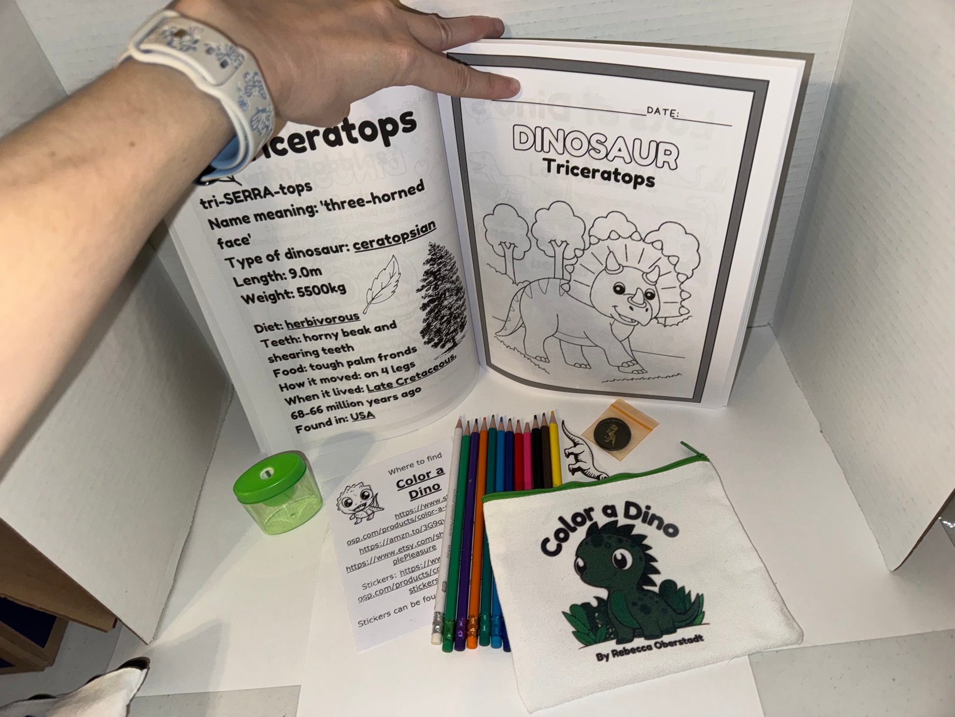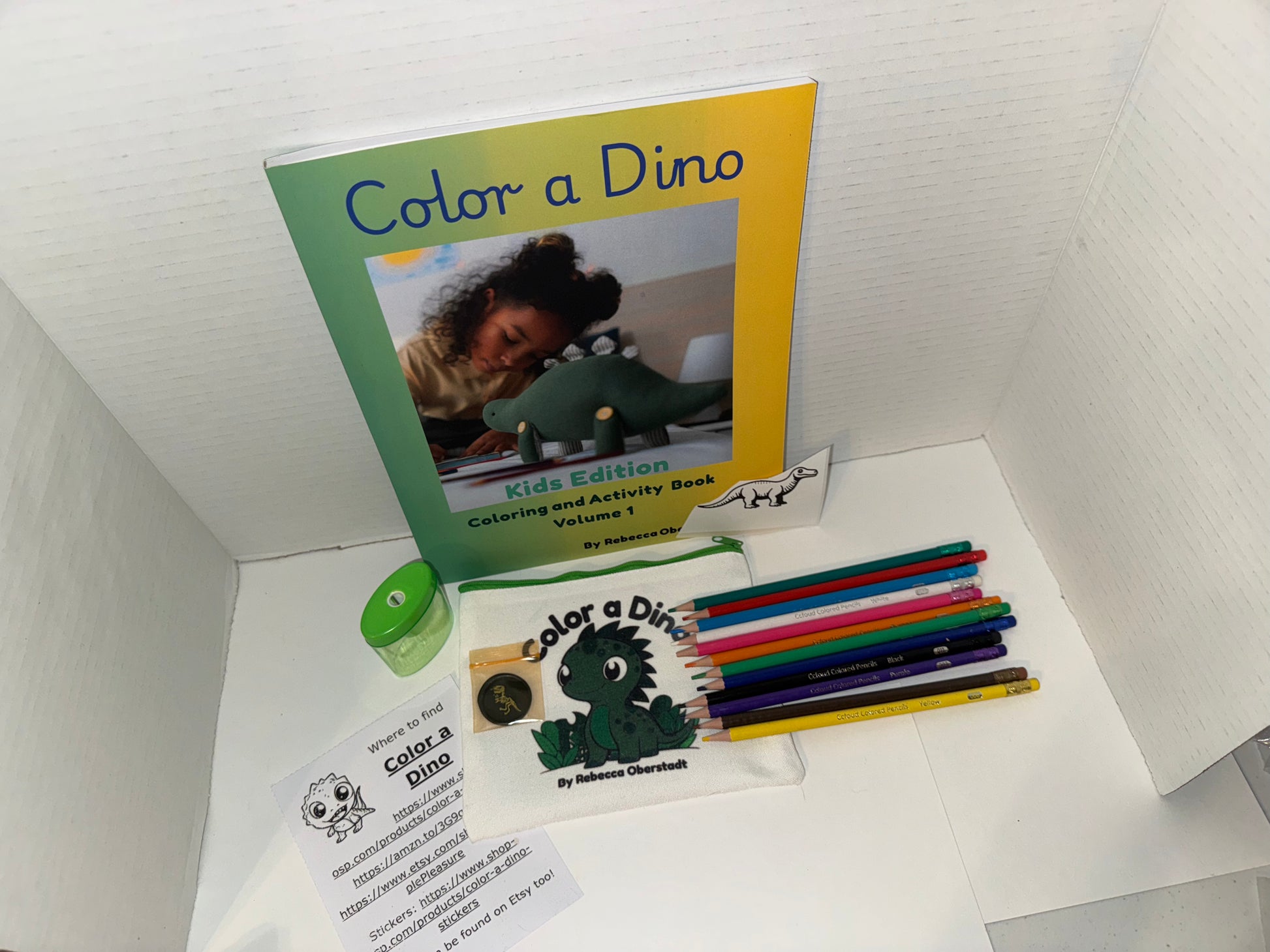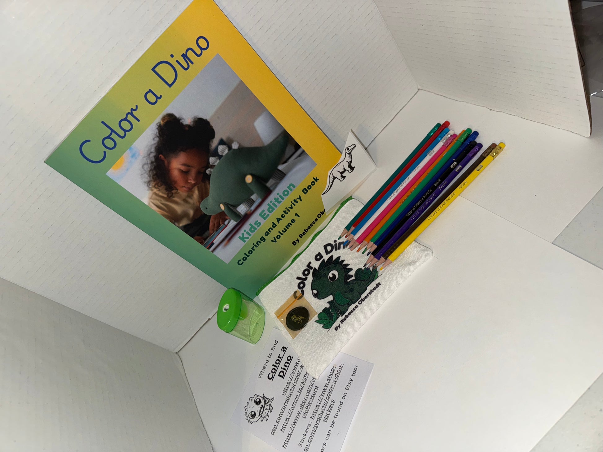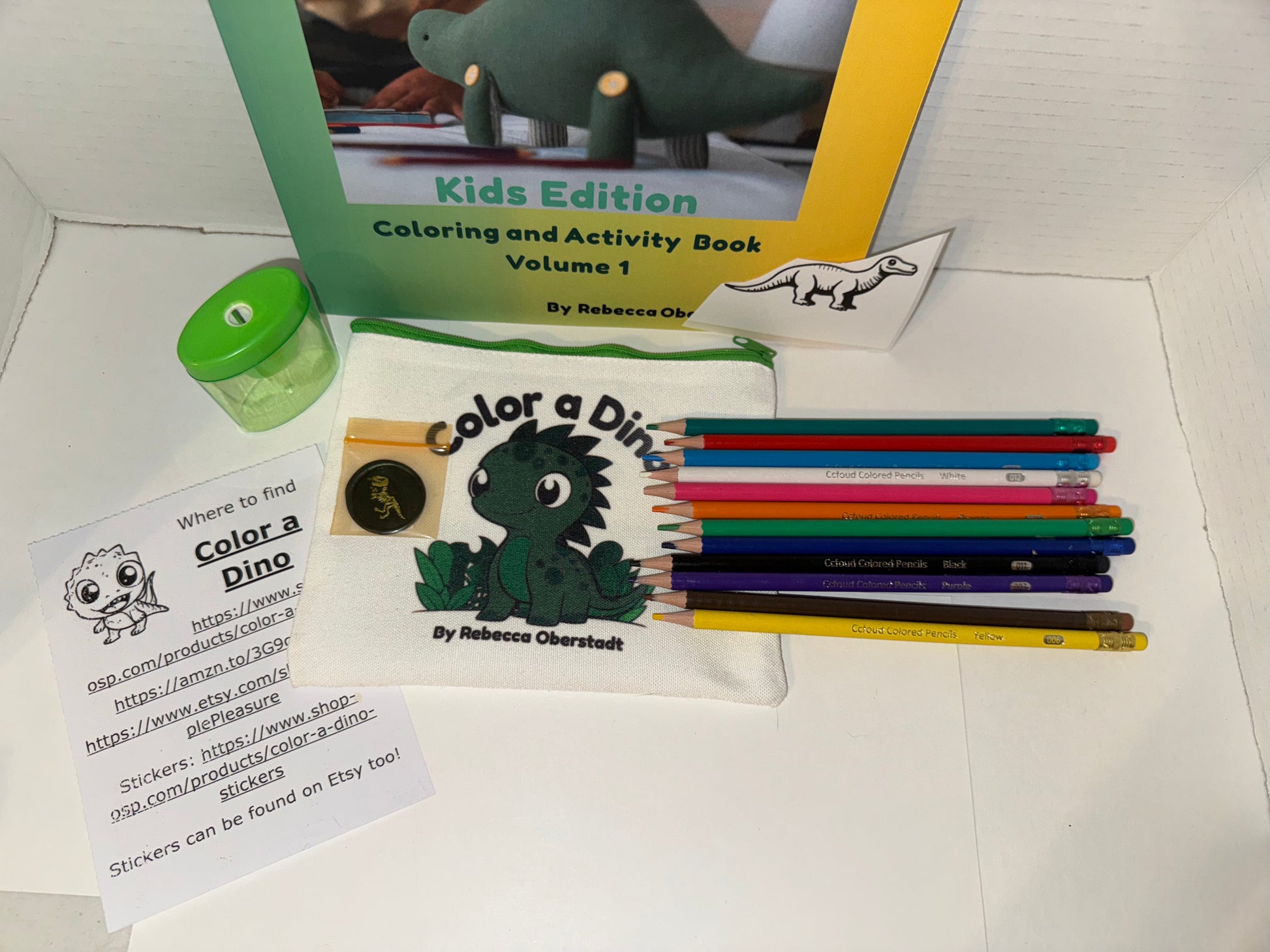 Inside the pouch you get 12 colored pencils with erasers built in. You get a Color a Dino Sticker to color, a Dinosaur T-Rex wax seal in various colors, with a sticker back so you can use it to seal an envelope or put it in your favorite book. I did not attach the sticker to the Wax seal in case you don't want to use it yet. You also get a Pencil sharpener, and a card that details information about the coloring book and info about it.