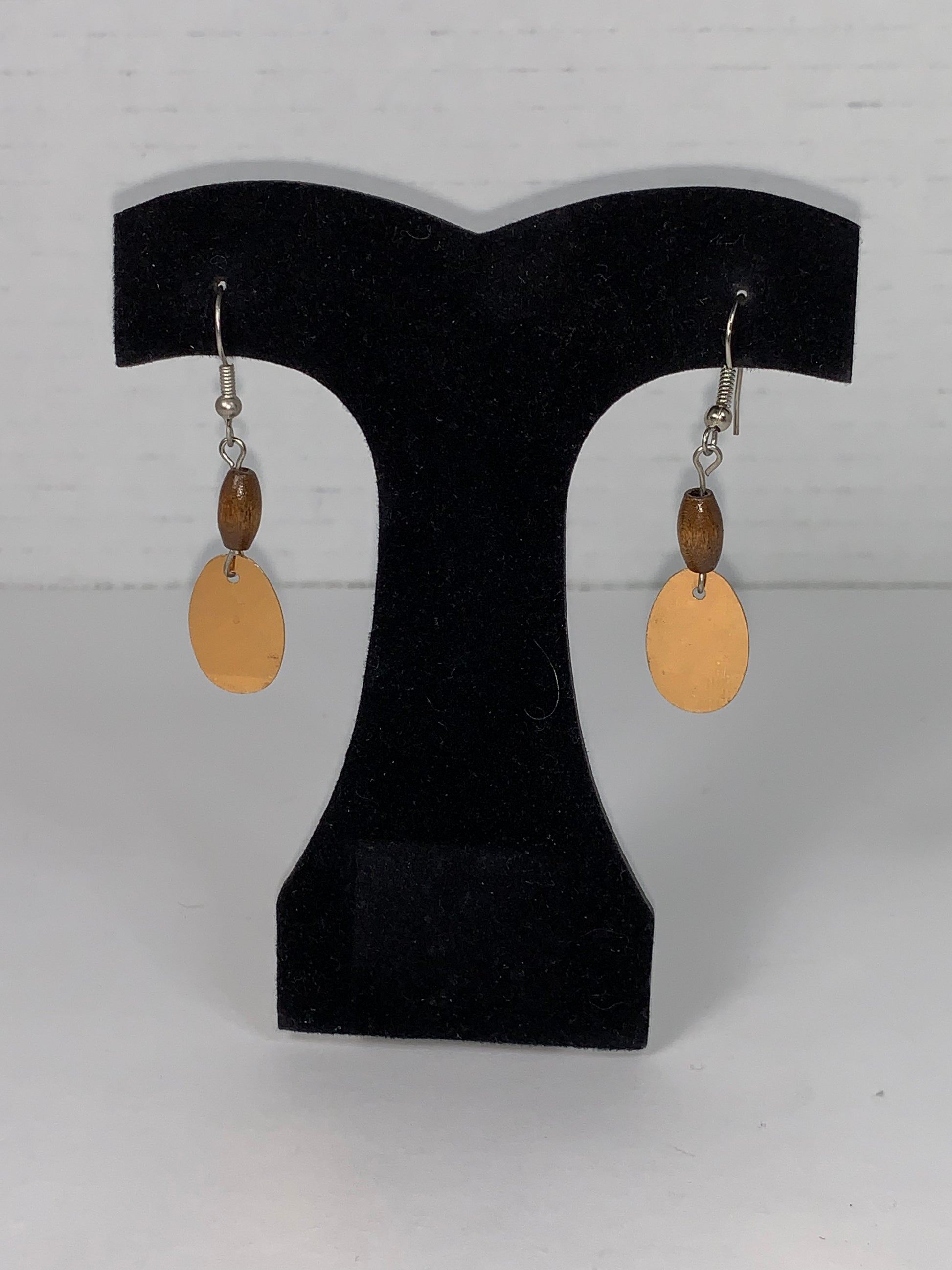 These Cute Wooden Dangle Earrings have a darker wood colored rice shaped bead. The ear wires are surgical steel fish hook design with a 3mm round bead and spring. The bottom part is a piece of metallic plastic in an oval shape that is a copper bronze color.