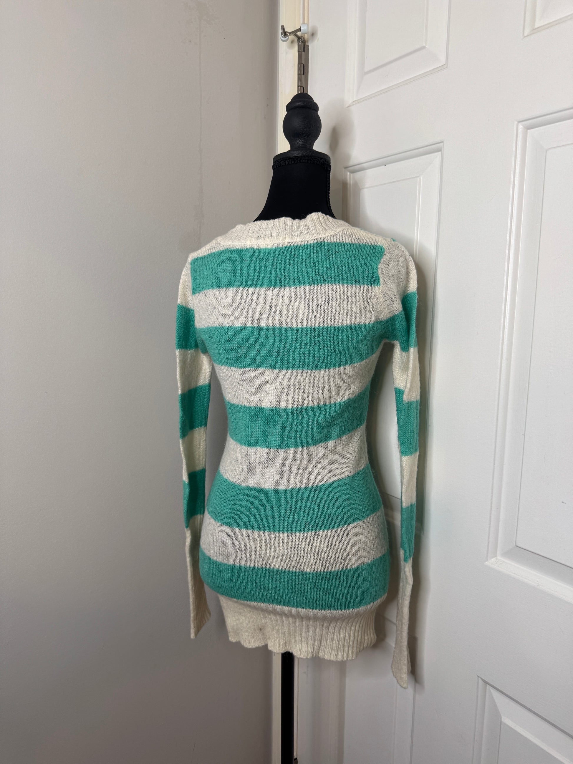 This is a minty green and white Forever 21 sweater with really long sleeves. This is a size small. This is also a v-neck sweater. I've had this for a long time and it is time for me to let it go since I am moving. This is a very long sweater, It covers the butt. I'm tall with a long torso so it covers my butt if you like long sweaters, these are also great over leggings.