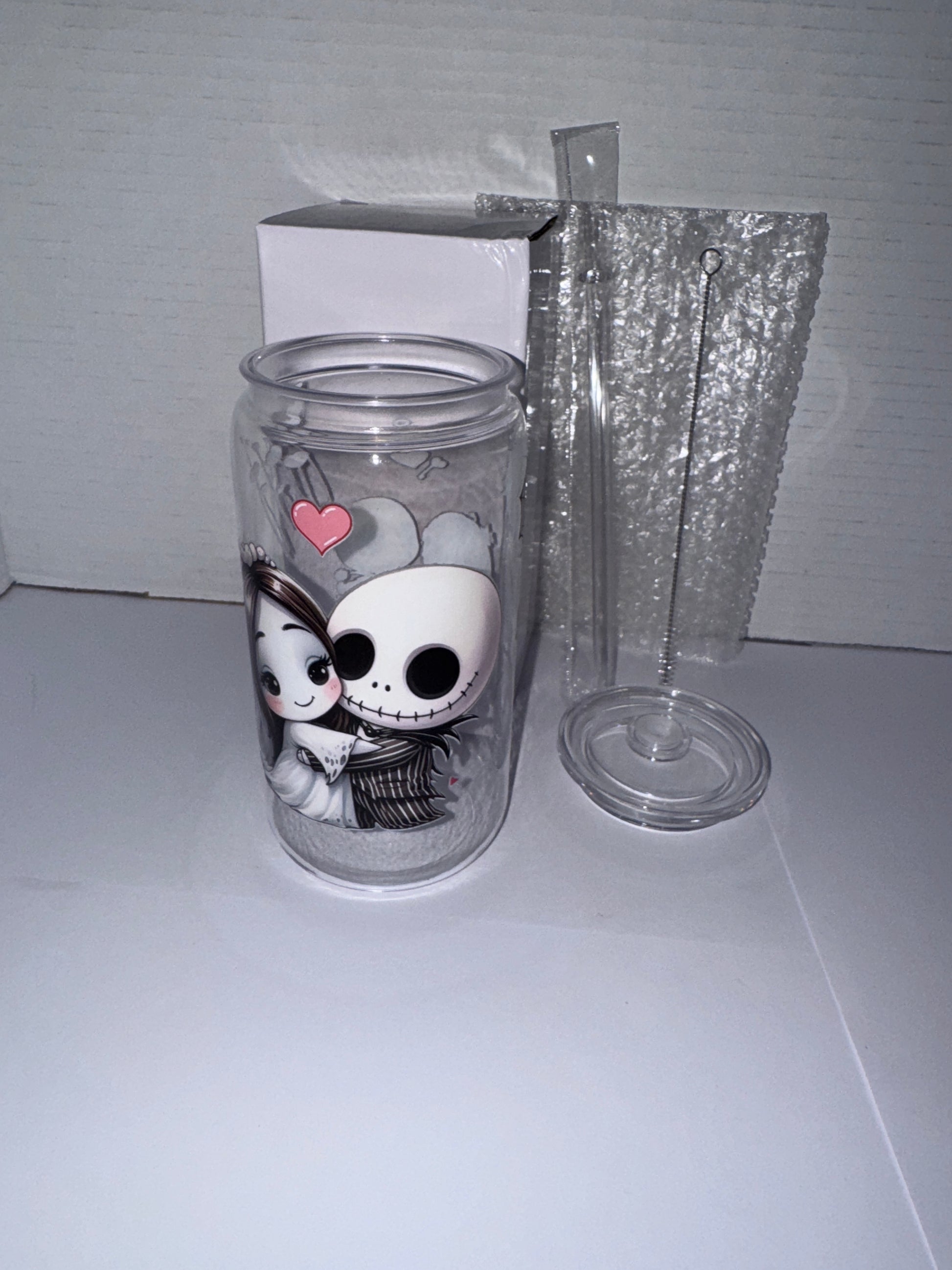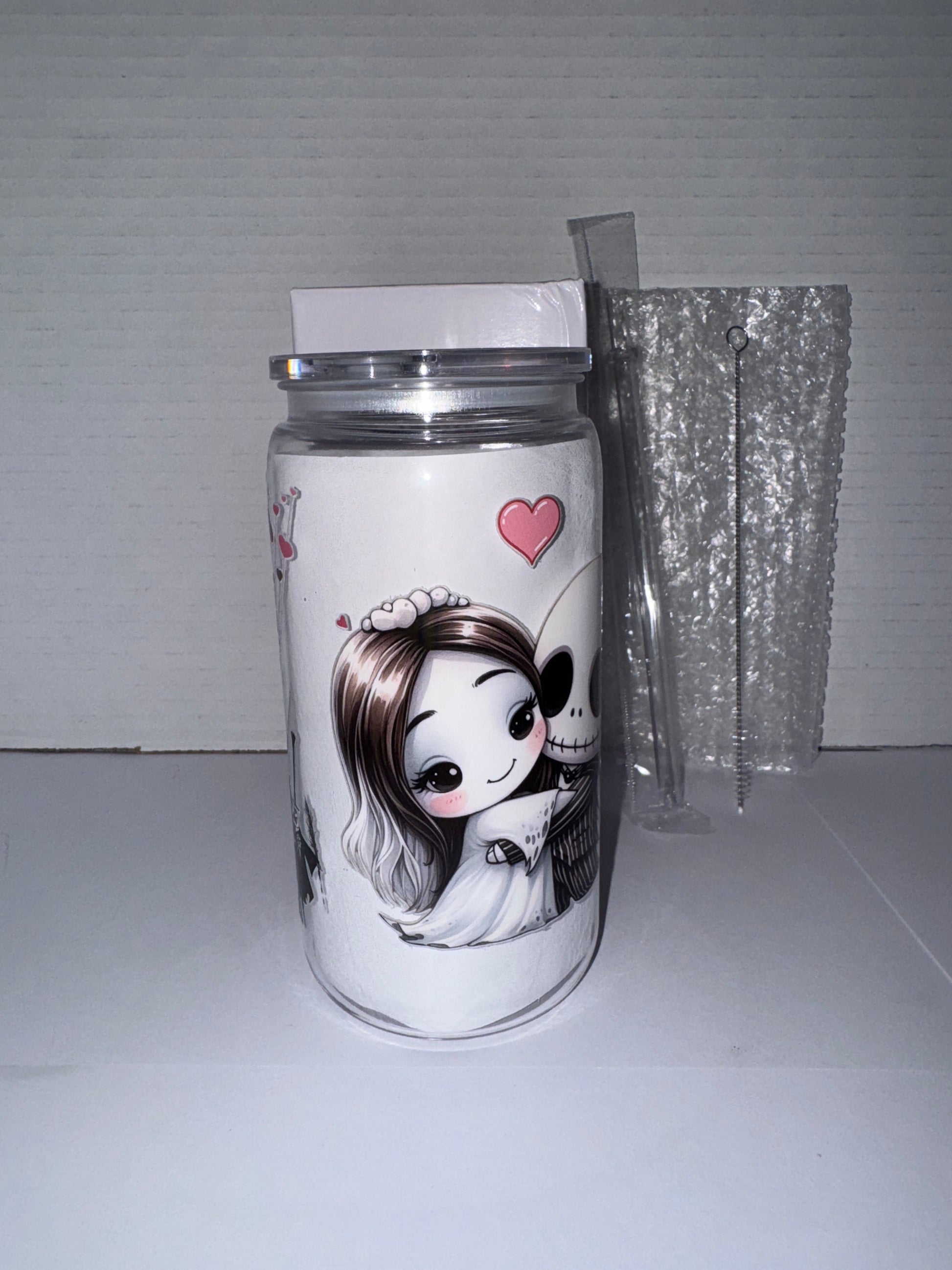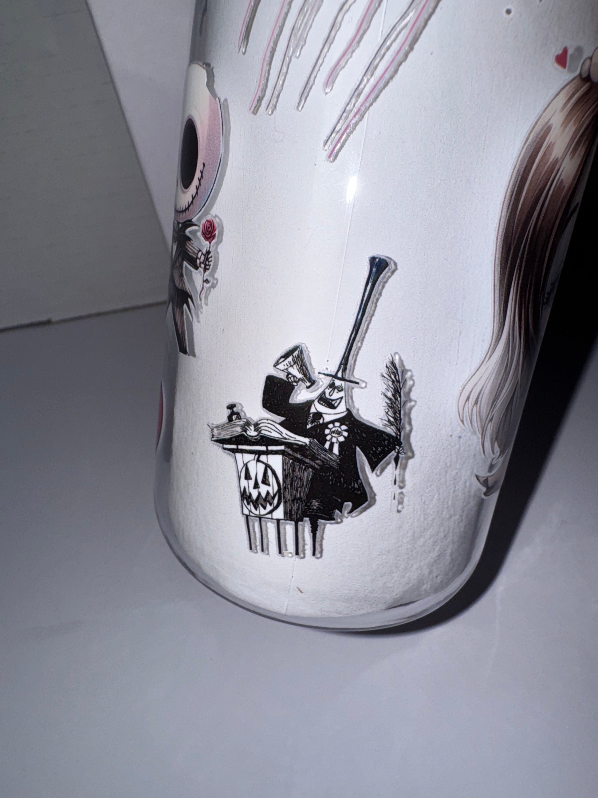 This is a Halloween themed 16 ounce plastic cup. This cup features Jack and Sally as kids in wedding garb on one side and them as kids where Sally is giving a love heart to Jack on the other side. There are red love hearts all over this tumbler. I also included the Mayor.