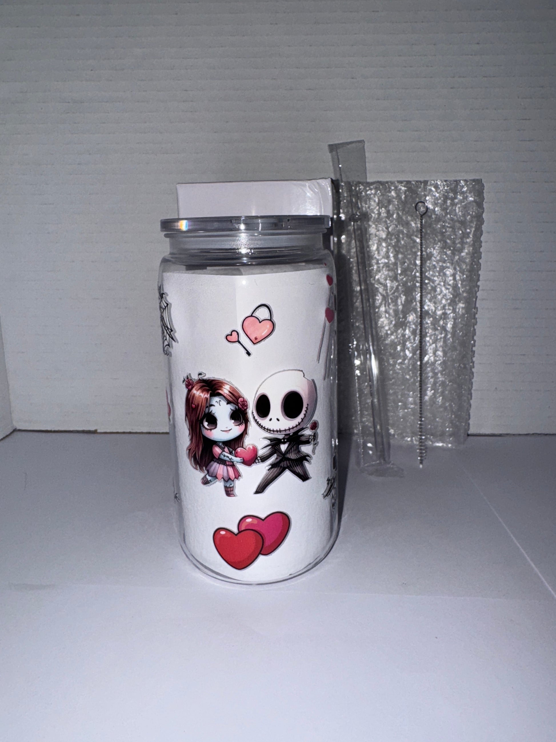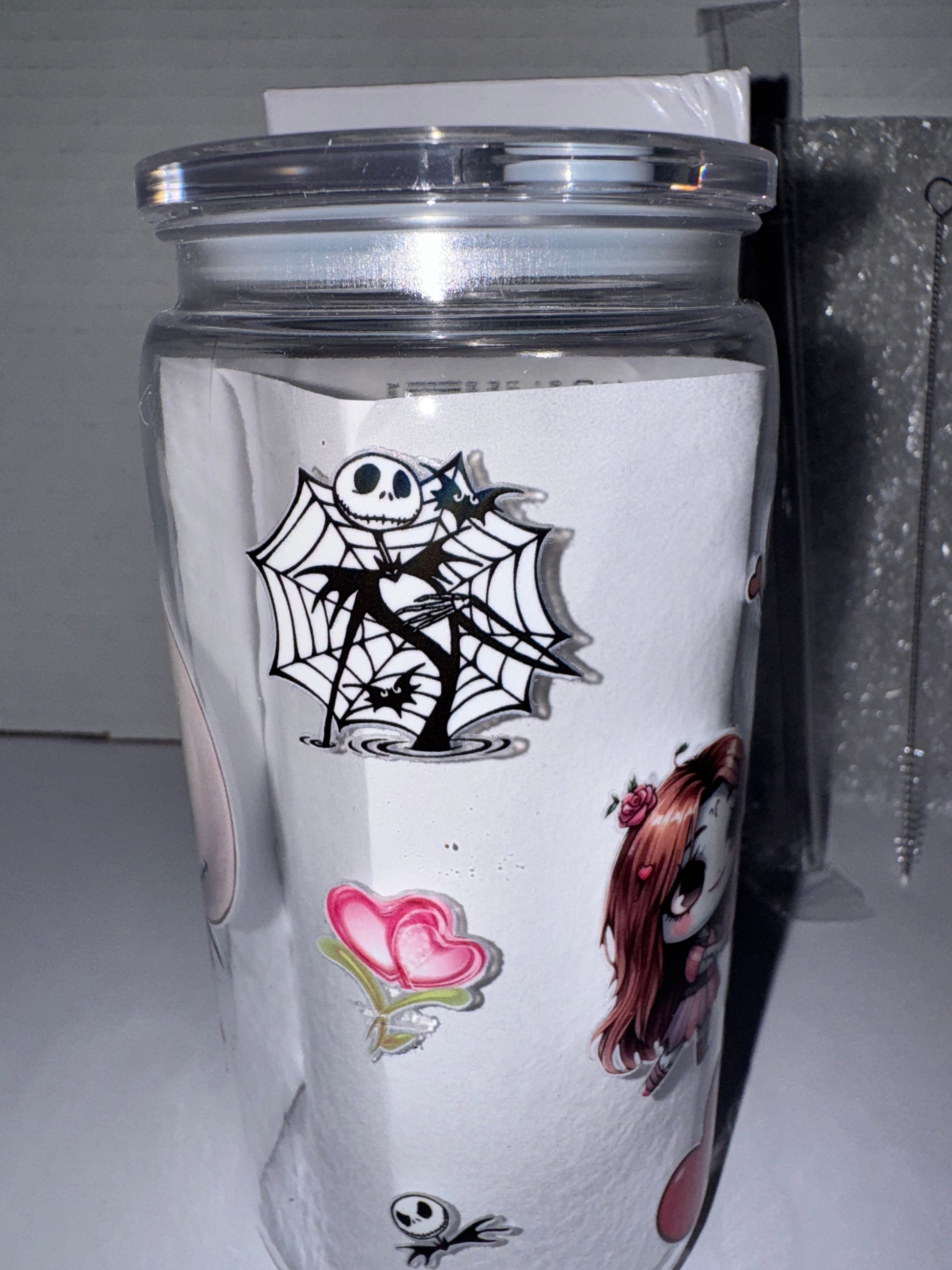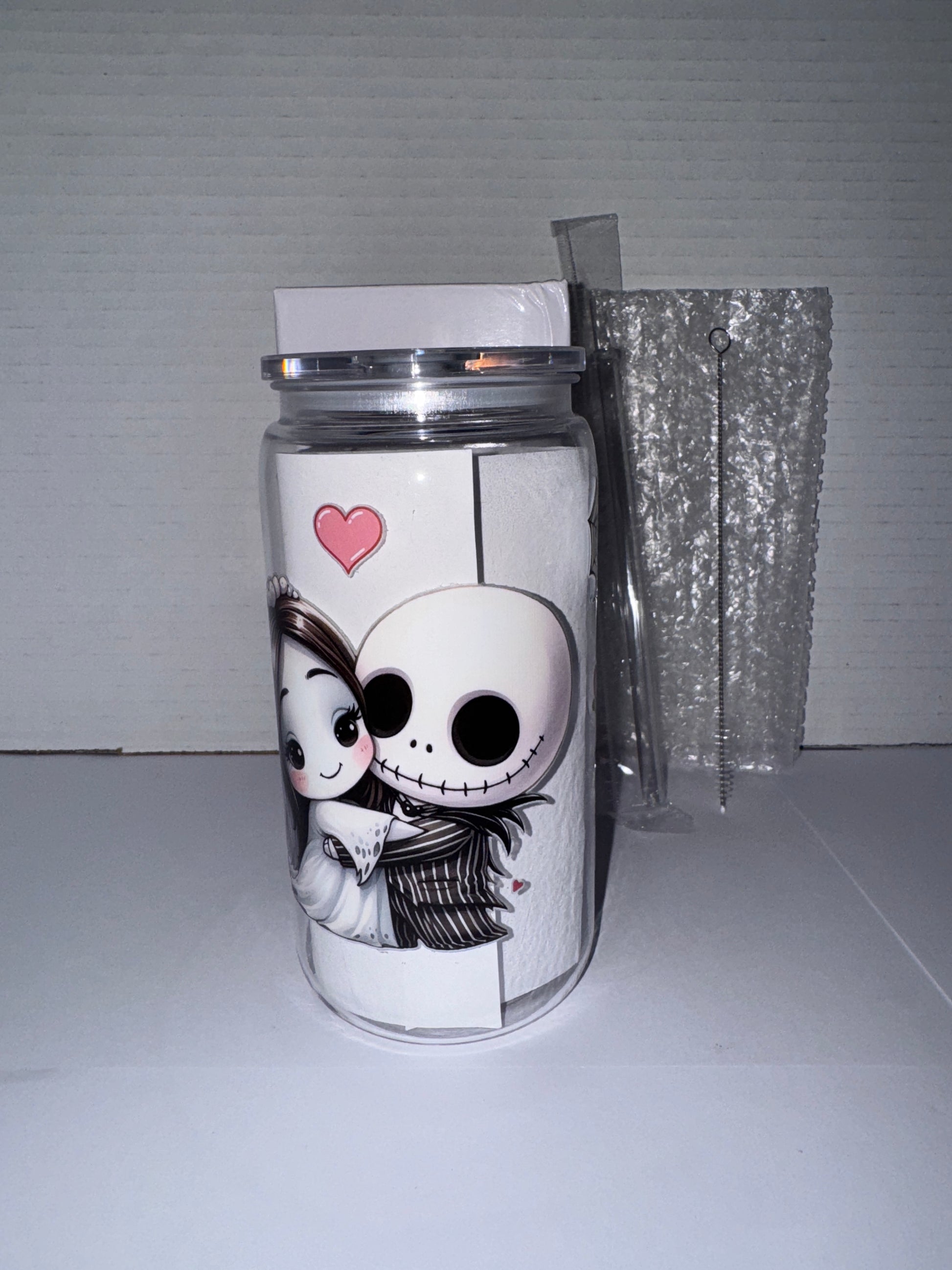 This is a Halloween themed 16 ounce plastic cup. This cup features Jack and Sally as kids in wedding garb on one side and them as kids where Sally is giving a love heart to Jack on the other side. There are red love hearts all over this tumbler. I also included the Mayor.