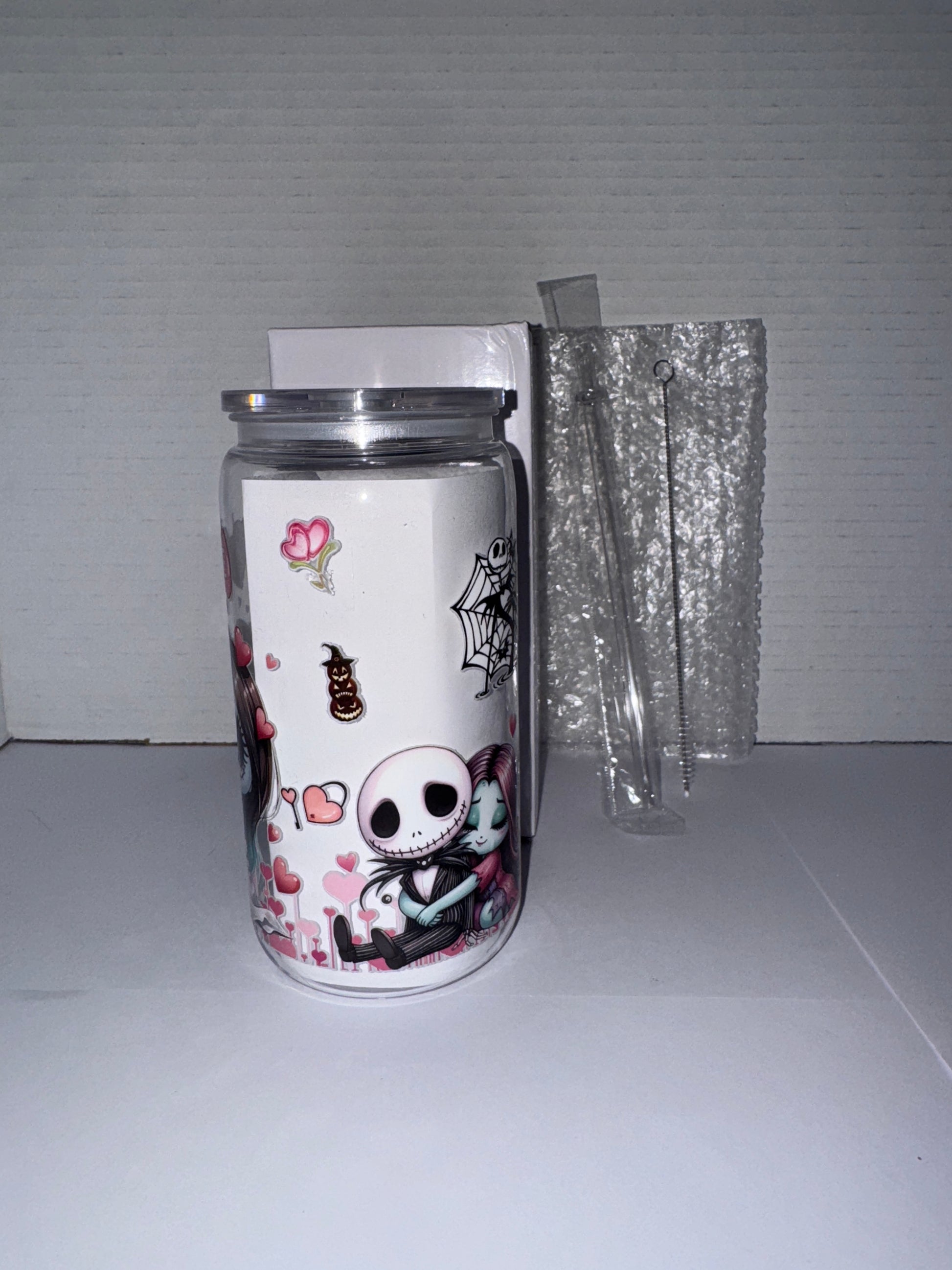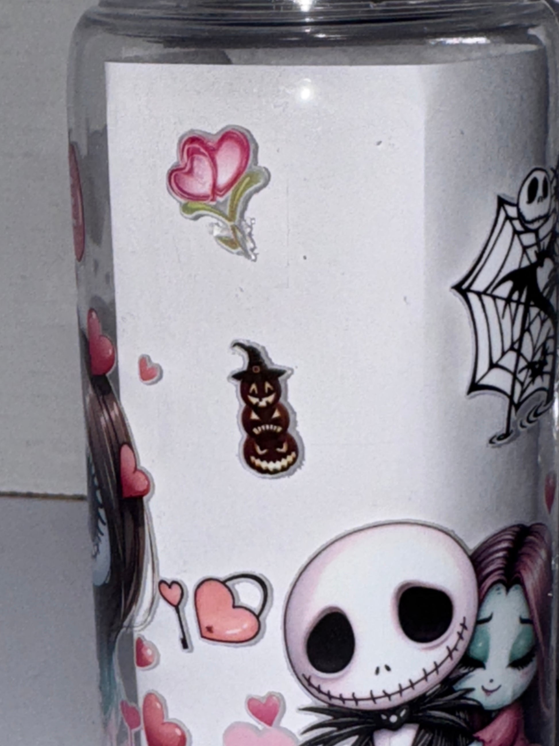 This is a Halloween themed 16 ounce plastic cup. This cup features Jack and Sally as patchwork dolls on one side and them as kids where Sally is giving a hug to Jack on the other side. There are pink love hearts all over this tumbler.