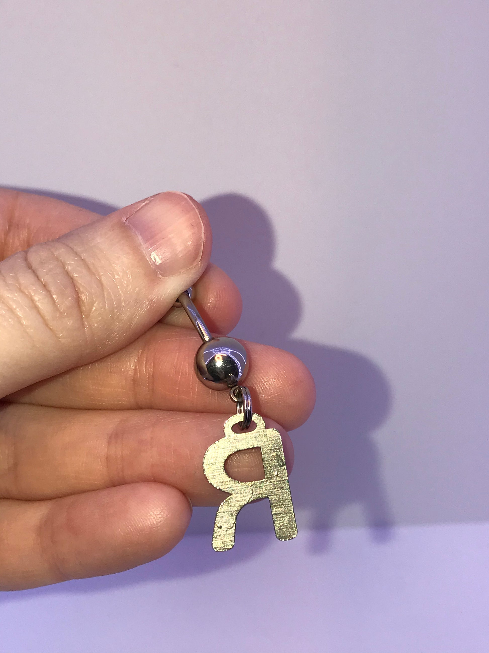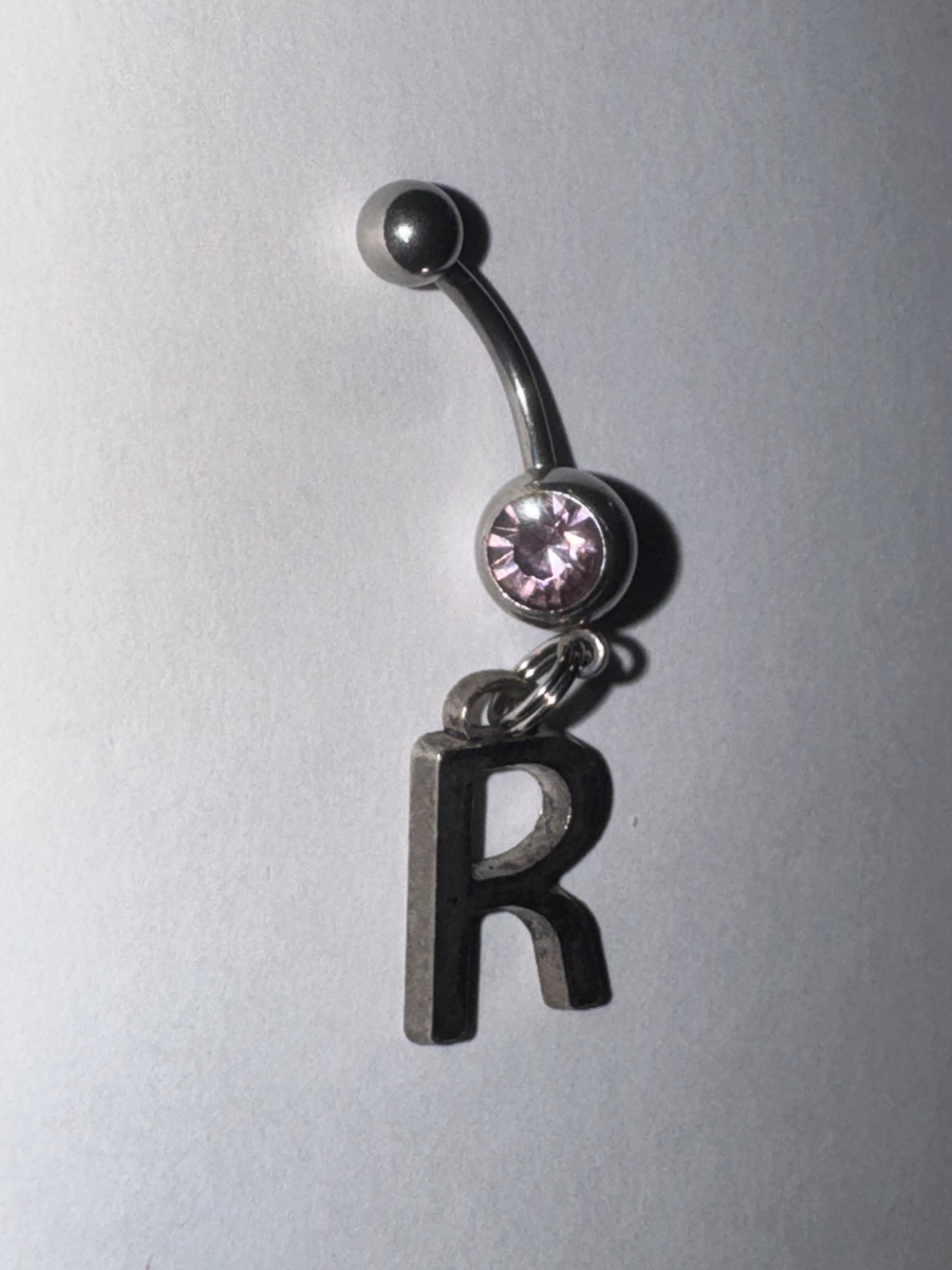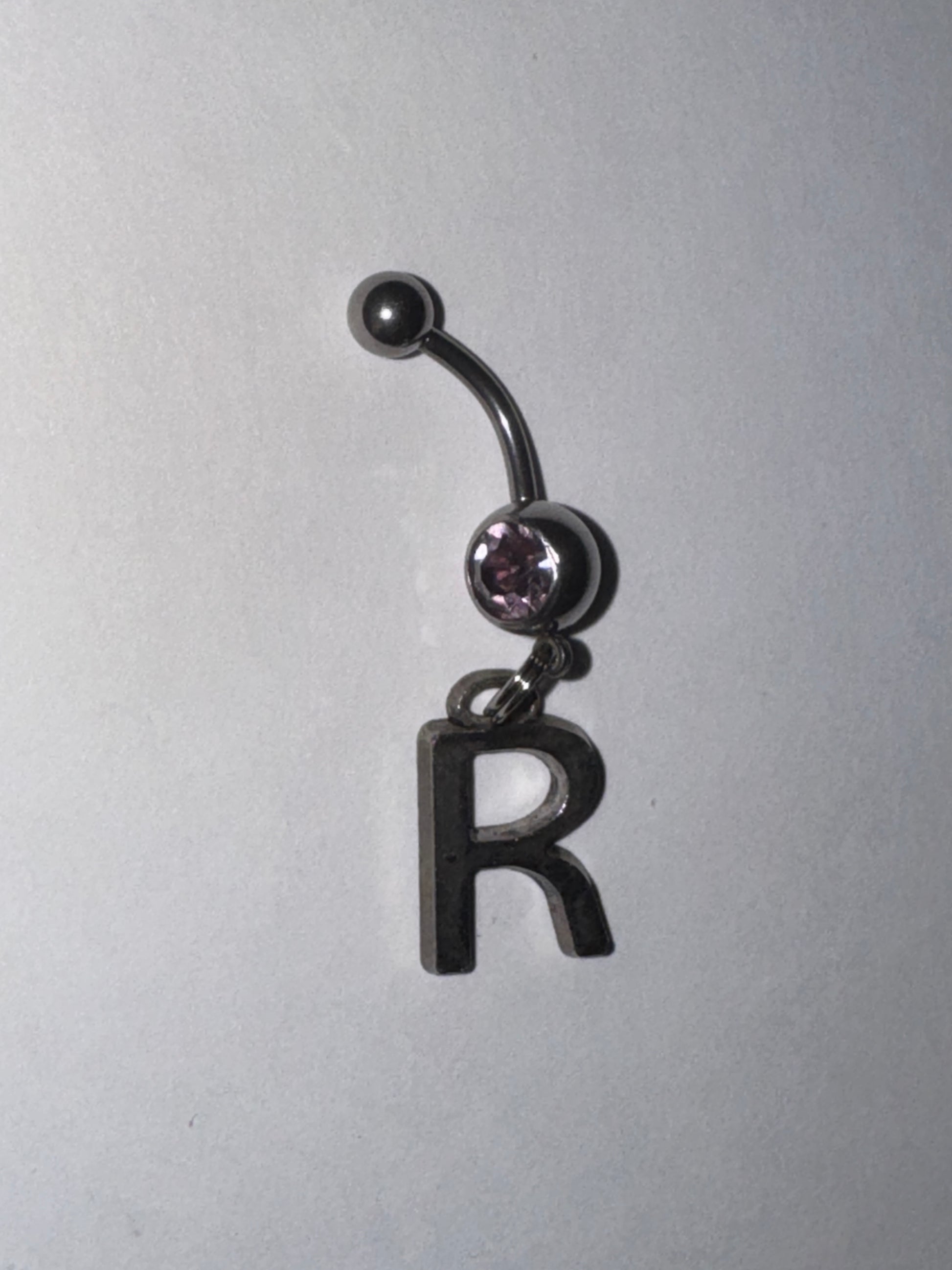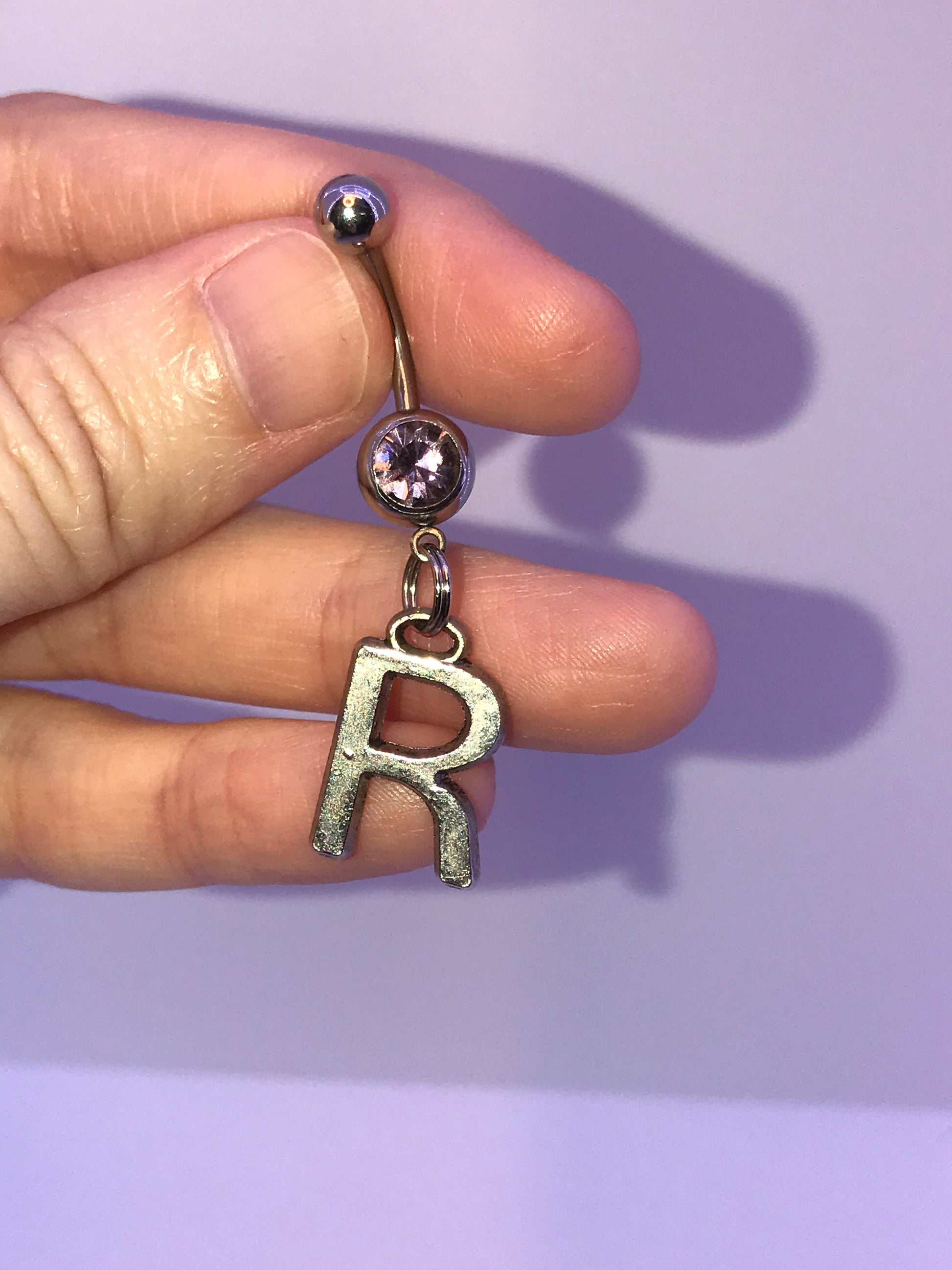 This belly ring has a Letter R and a Lavender gem on the belly ring.