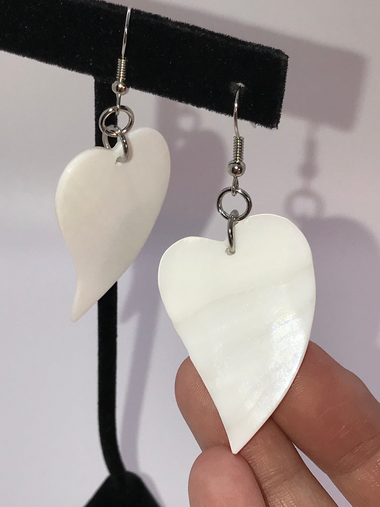 These fabulous mother-of-pearl shell (natural/bleached) and sterling silver plated pewter fish hook ear wire dangle earrings feature a beautiful white, 2-1/2 inches with curved heart.