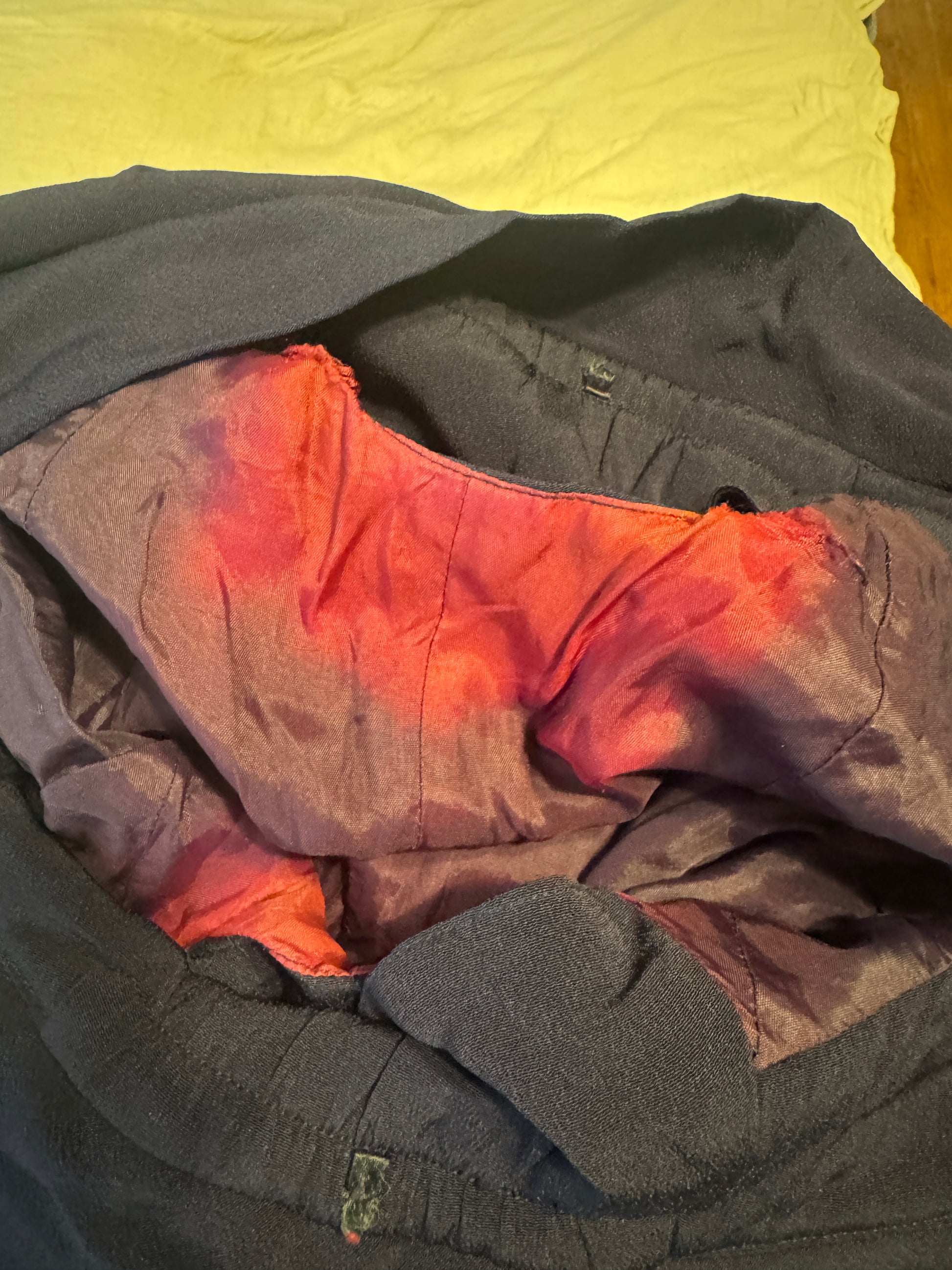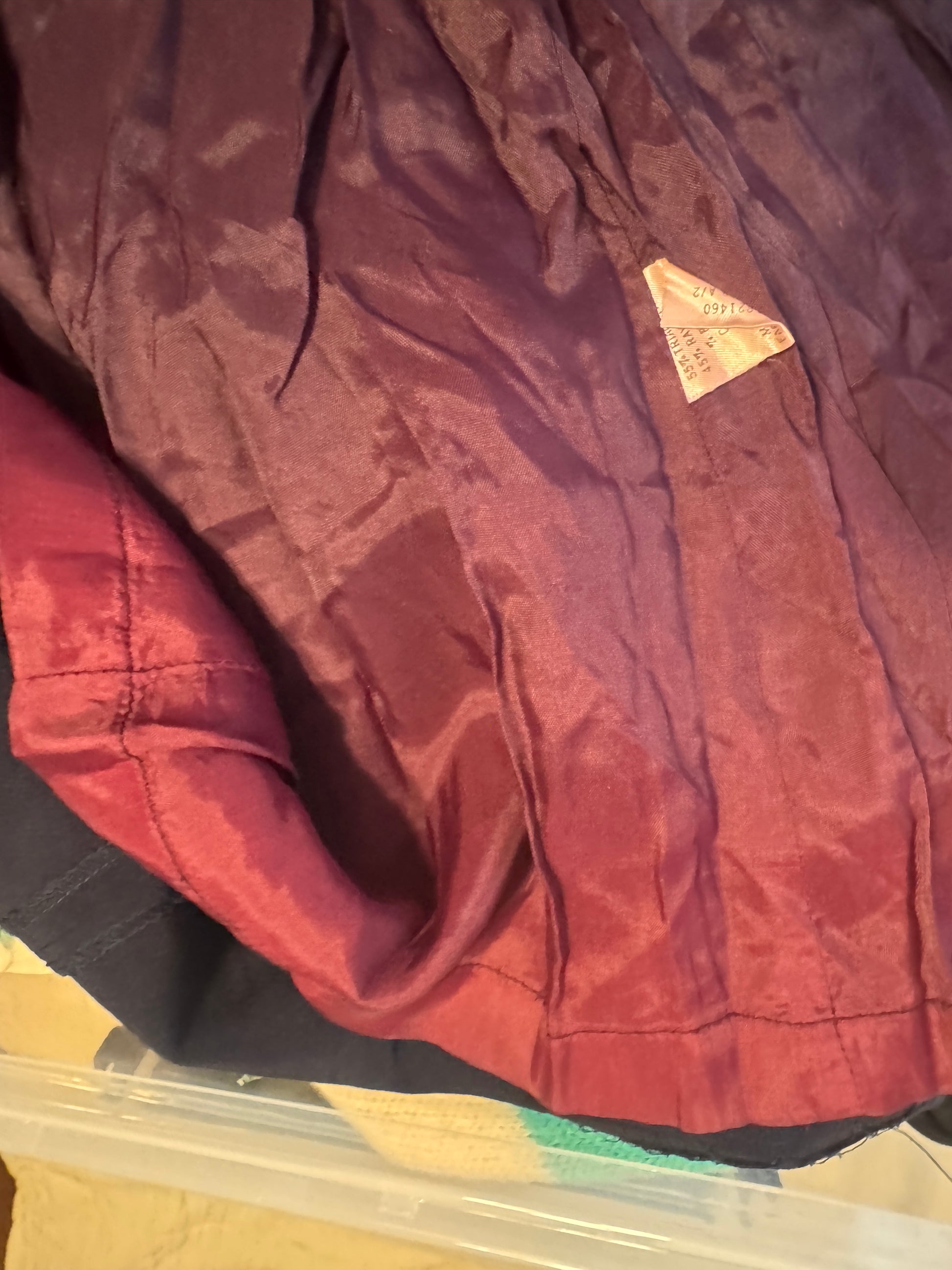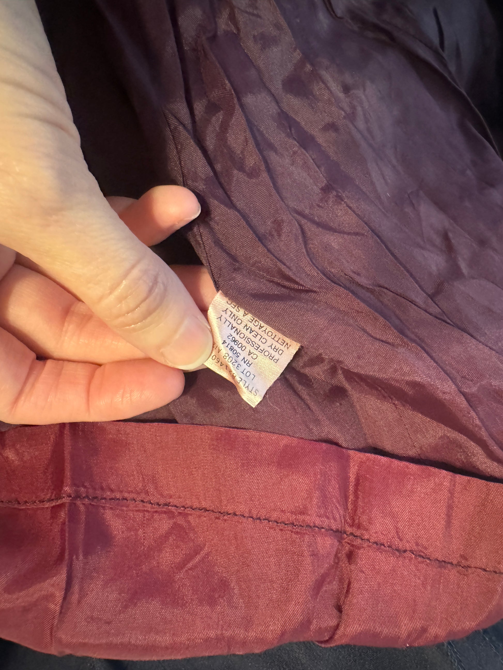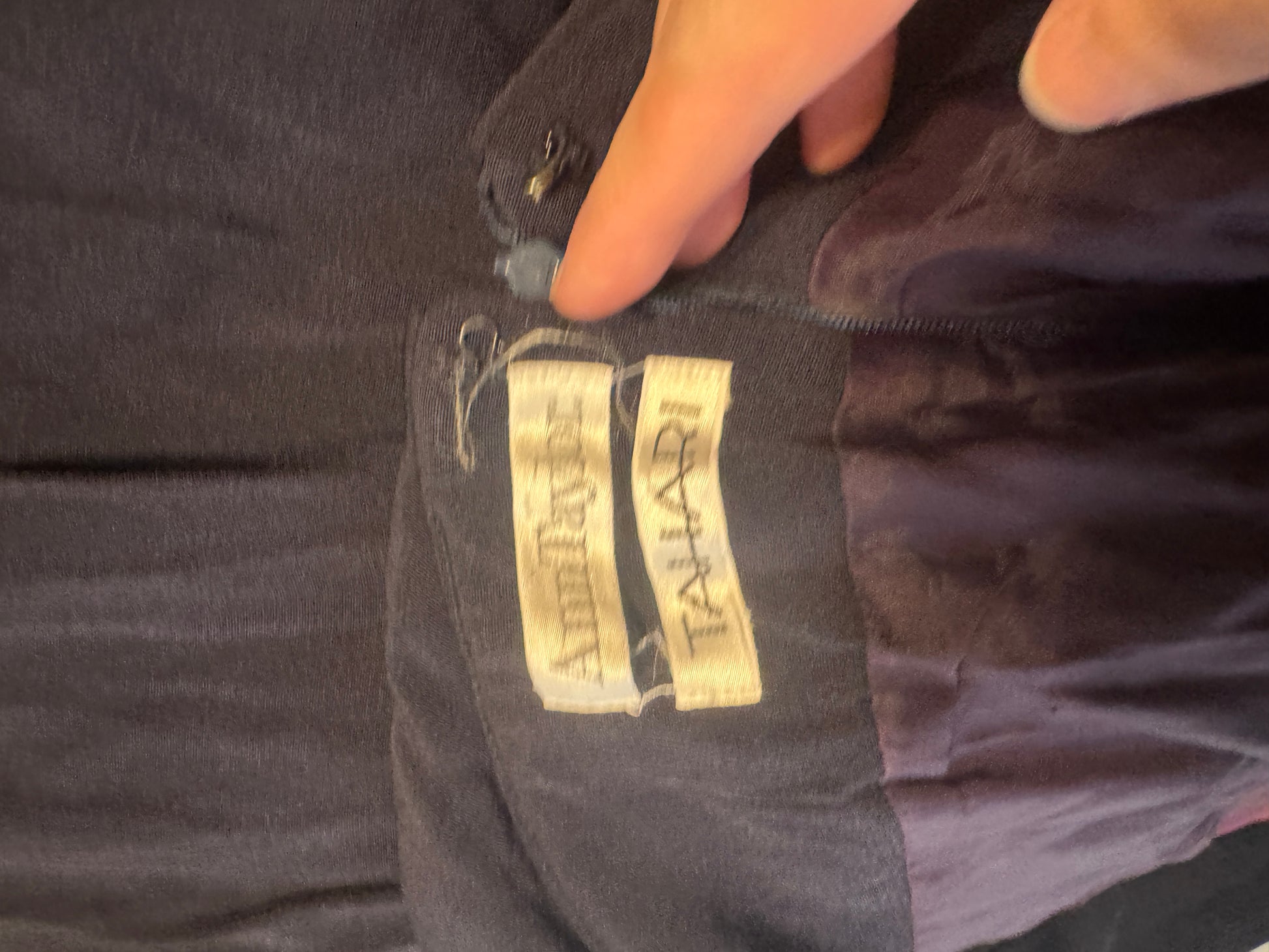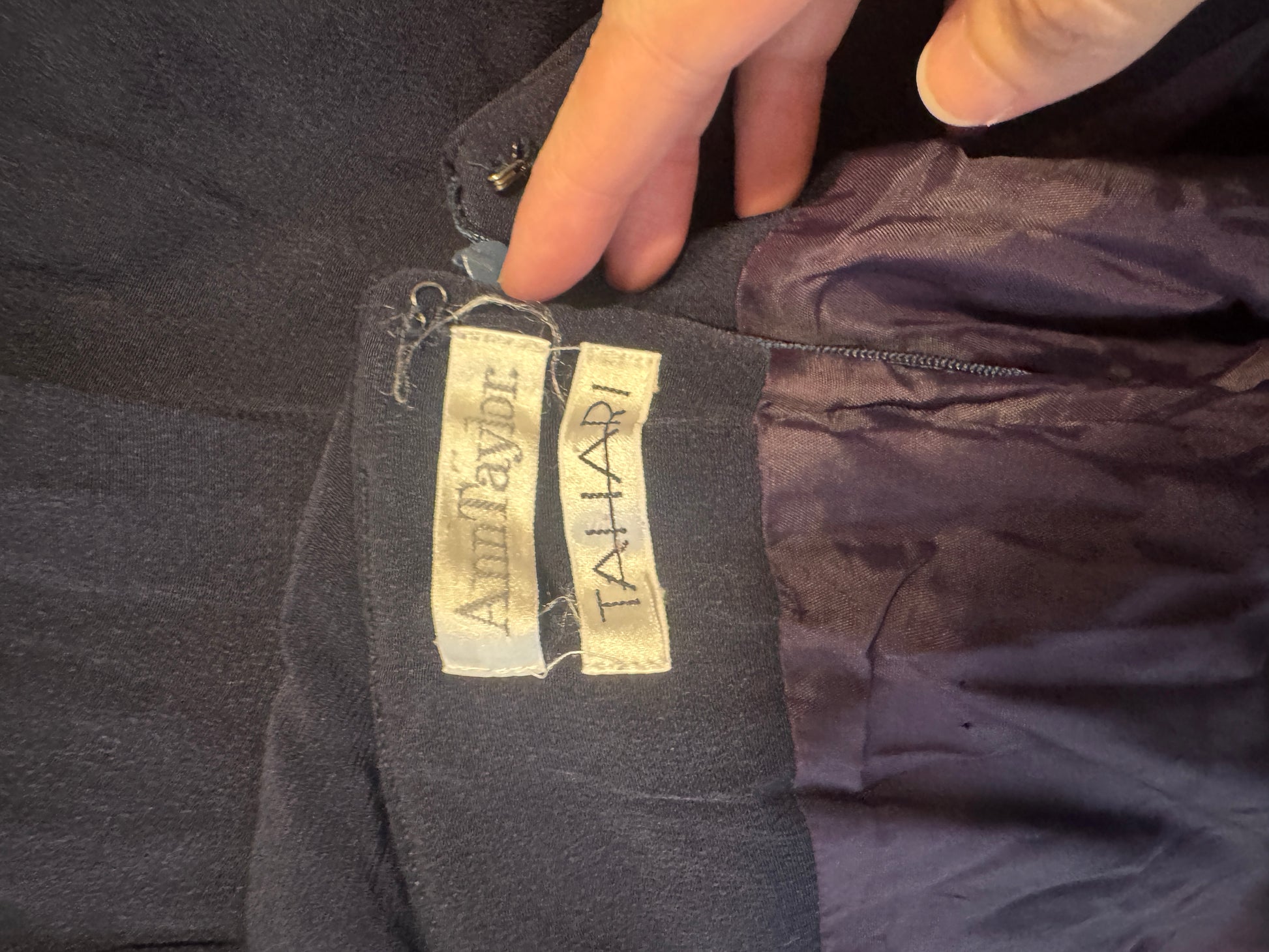 This is a dress that was given to me but it never fit right and I hated the fact it kept falling off my shoulders, it drive me insane. This is a navy blue dress. The person who owned it before me had it dry cleaned but she ruined it with her body sweat so the inner lining is a weird color because of it. This is a size 4 dress from Anne Taylor and Tahari. This is a formal dress with a zipper up the back and a full lining. The outside of this dress looks brand new.