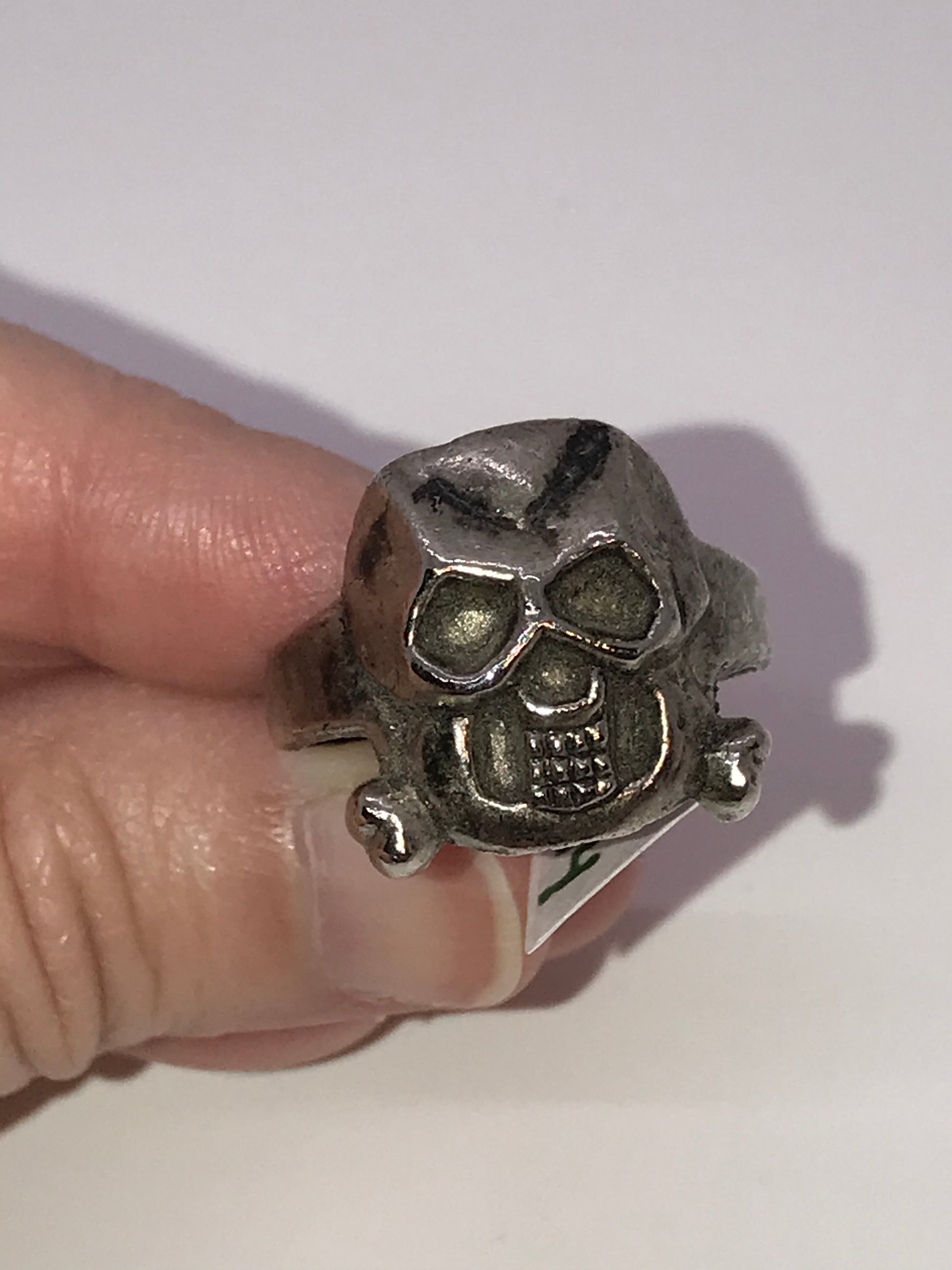 This is a pewter mask ring that looks like a skull and crossbones. This ring is a size 10.