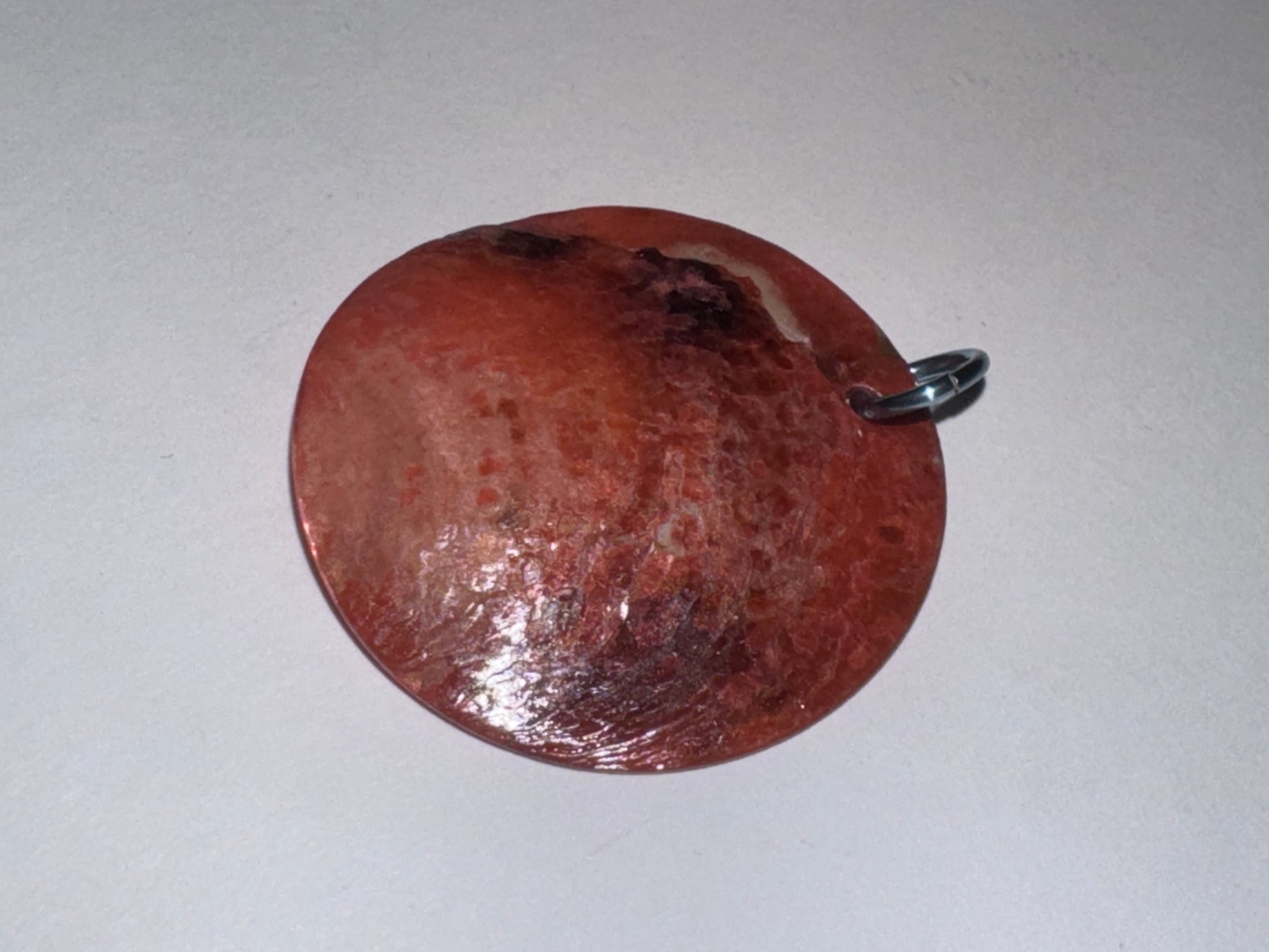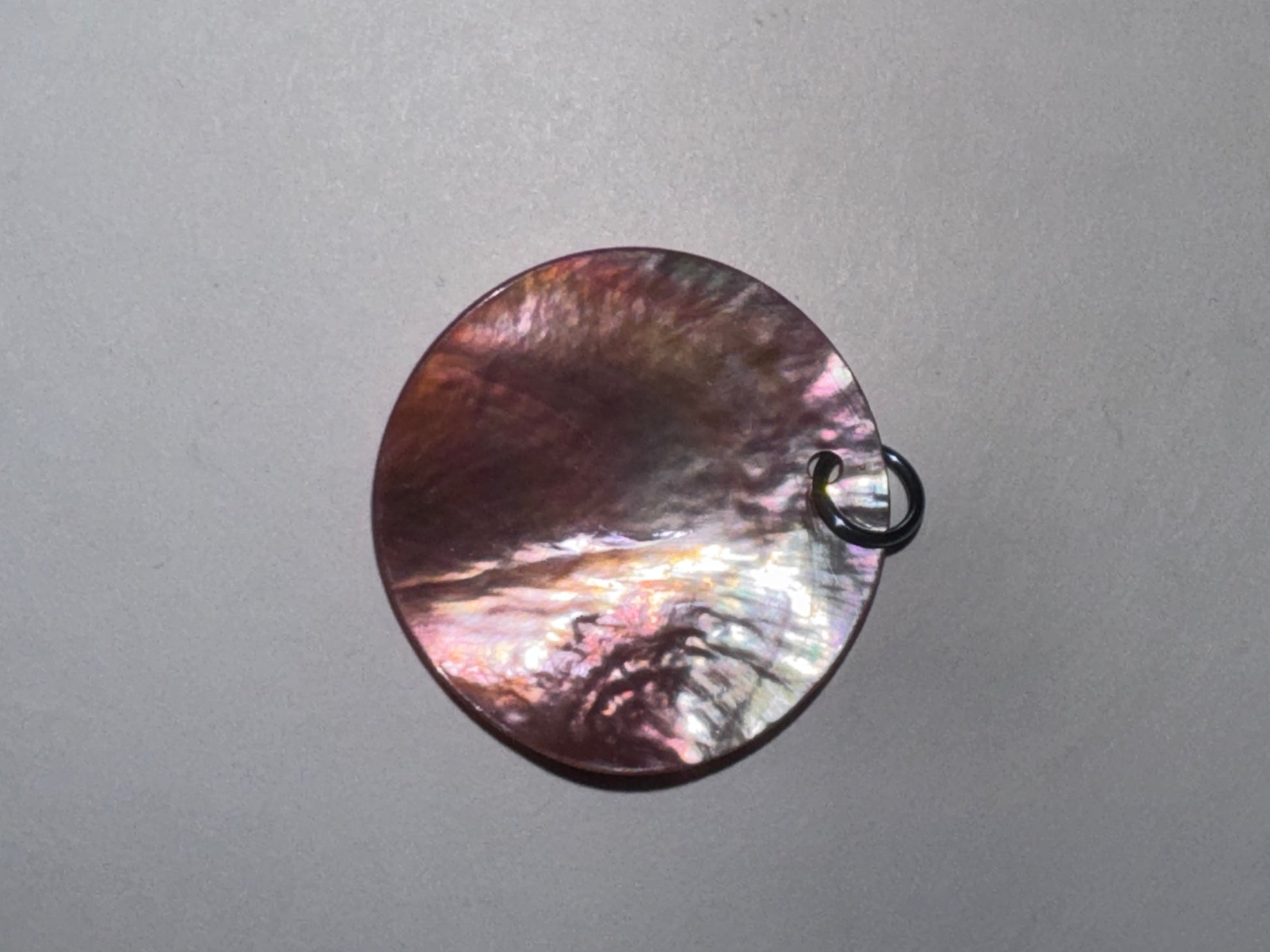 This round disc pendant is made out of Black Lip Shell. It is a Pink/rose color the top is like a light lime green shifting white color and the iridescent nature of it causes it to change color in different light. I used a blue anodized aluminum jump ring as a bail.