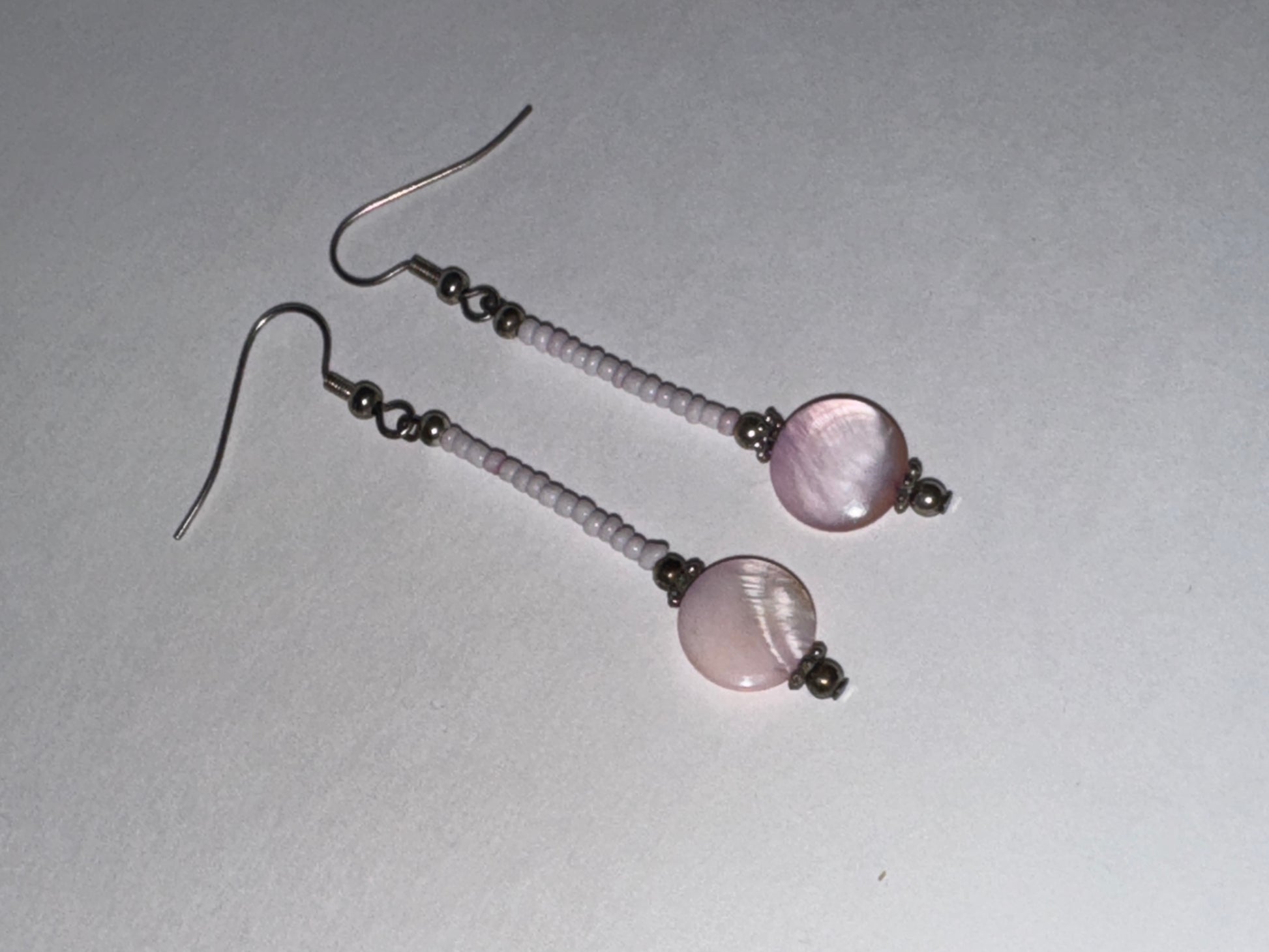 These simple yet elegant coin mother of pearl dangle earrings feature sterling silver findings, and seed beads, as well as a sterling silver French ear wire and t-wire. Each pair of earrings has seed beads the colors that correspond with the color of the mother of pearl coin. These are pink earrings, simple yet elegant.