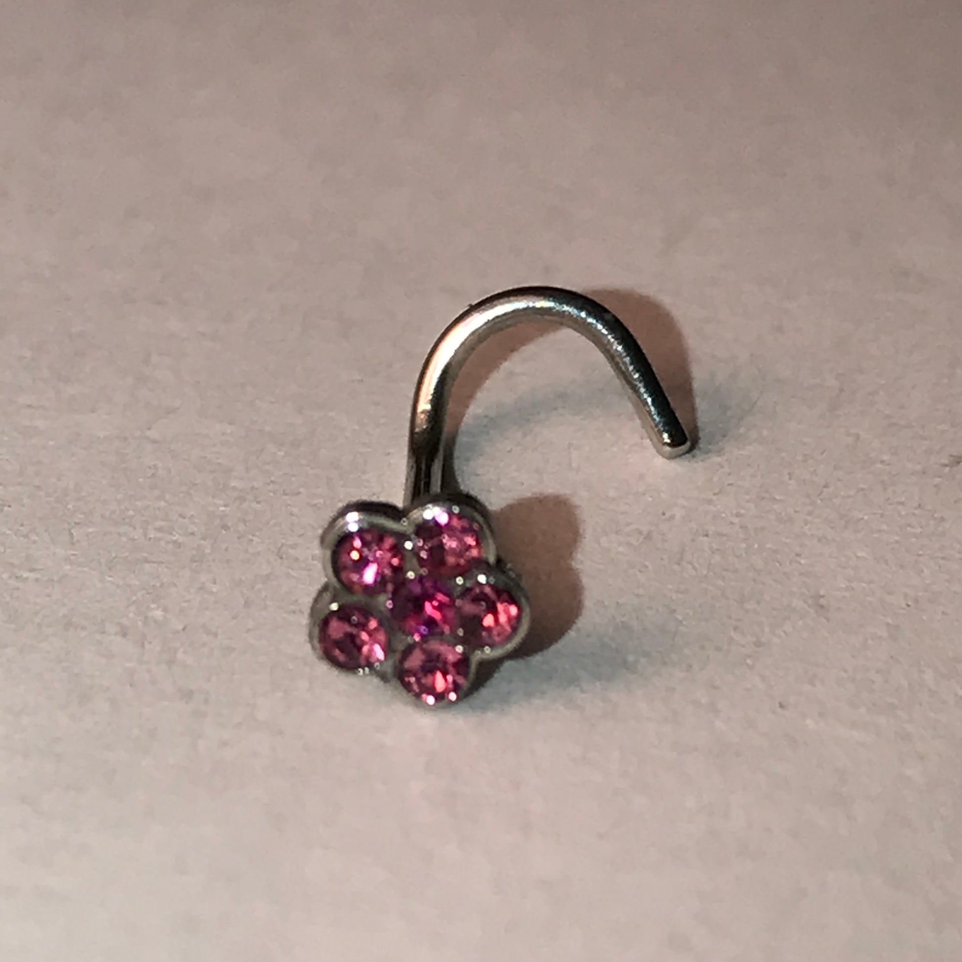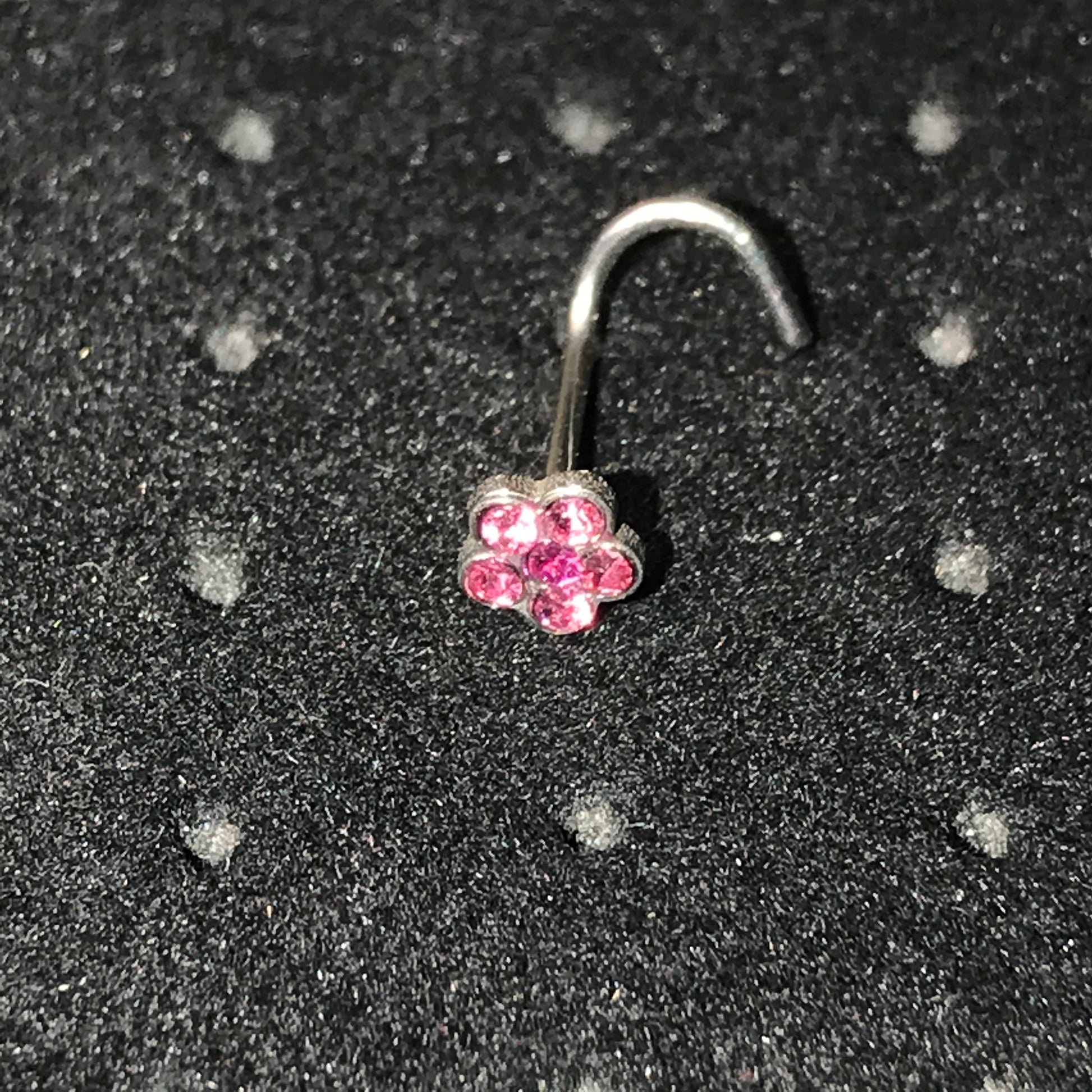 This is a 20 gauge curved nose ring with a Pink colored rhinestone Flower gemstones in it. The nose ring is made out of 316-L Surgical Steel.