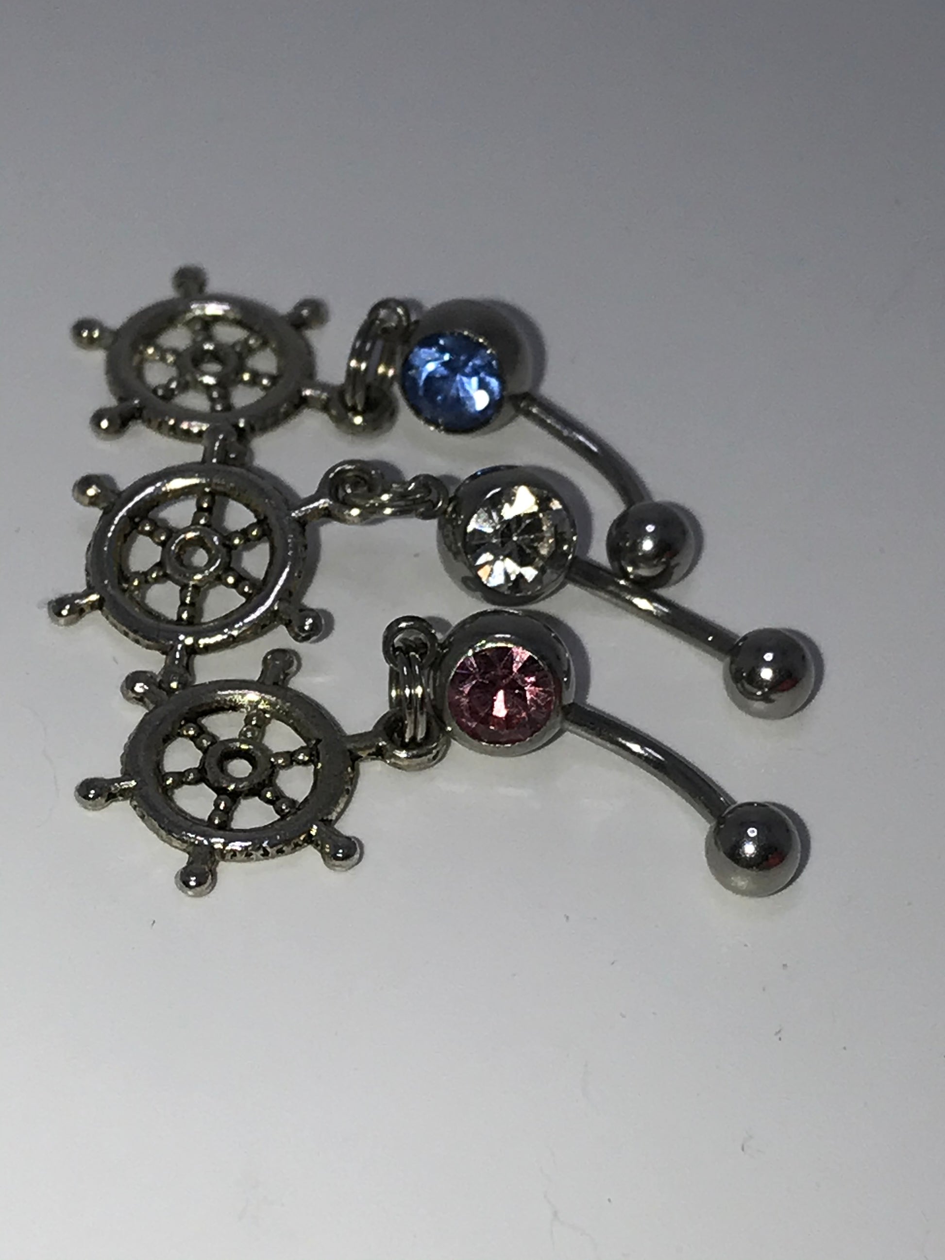 These belly rings have a ships wheel charm that dangle from a 14 gauge belly ring. These are made with a sturdy split ring so your charm does not fall off like other cheap belly rings.
