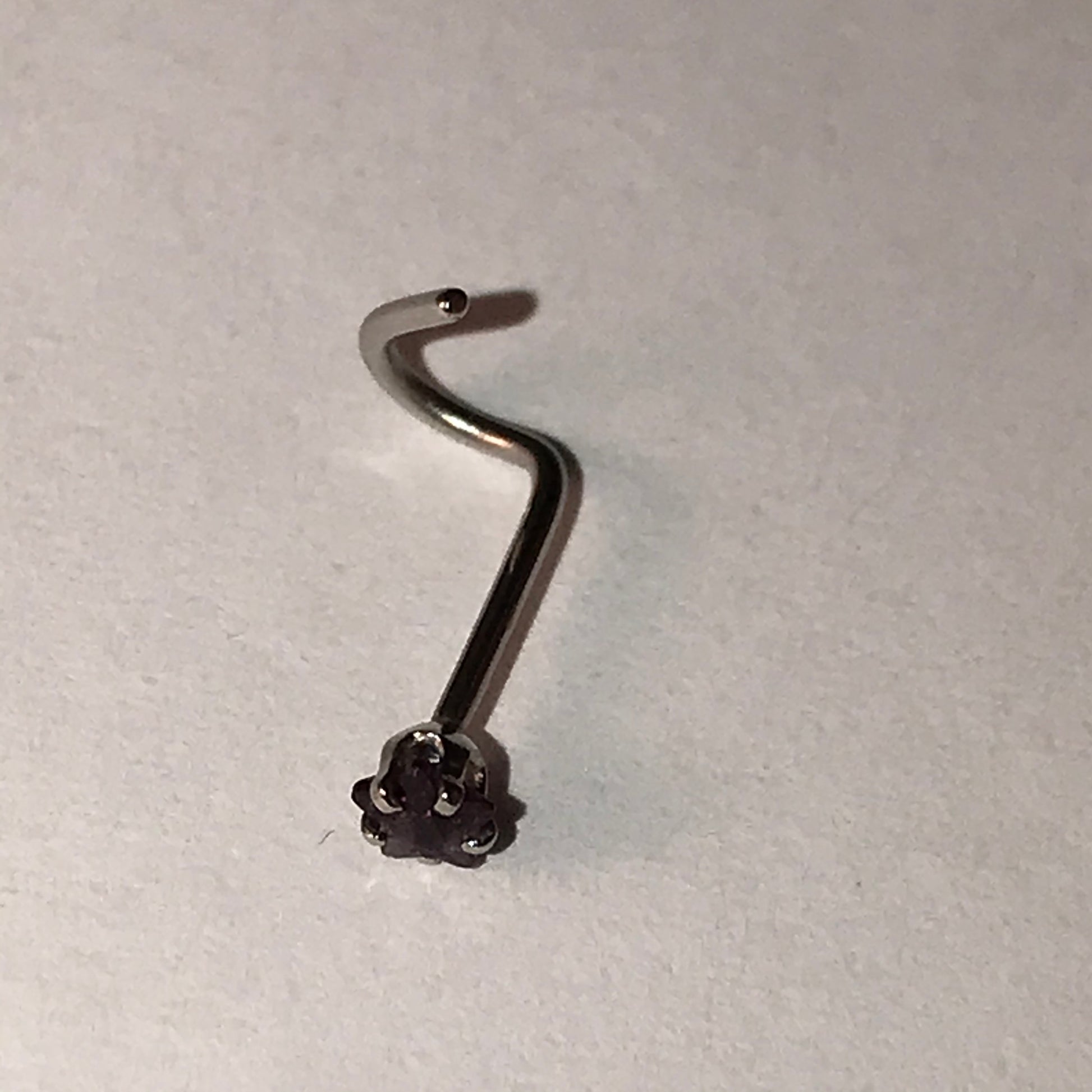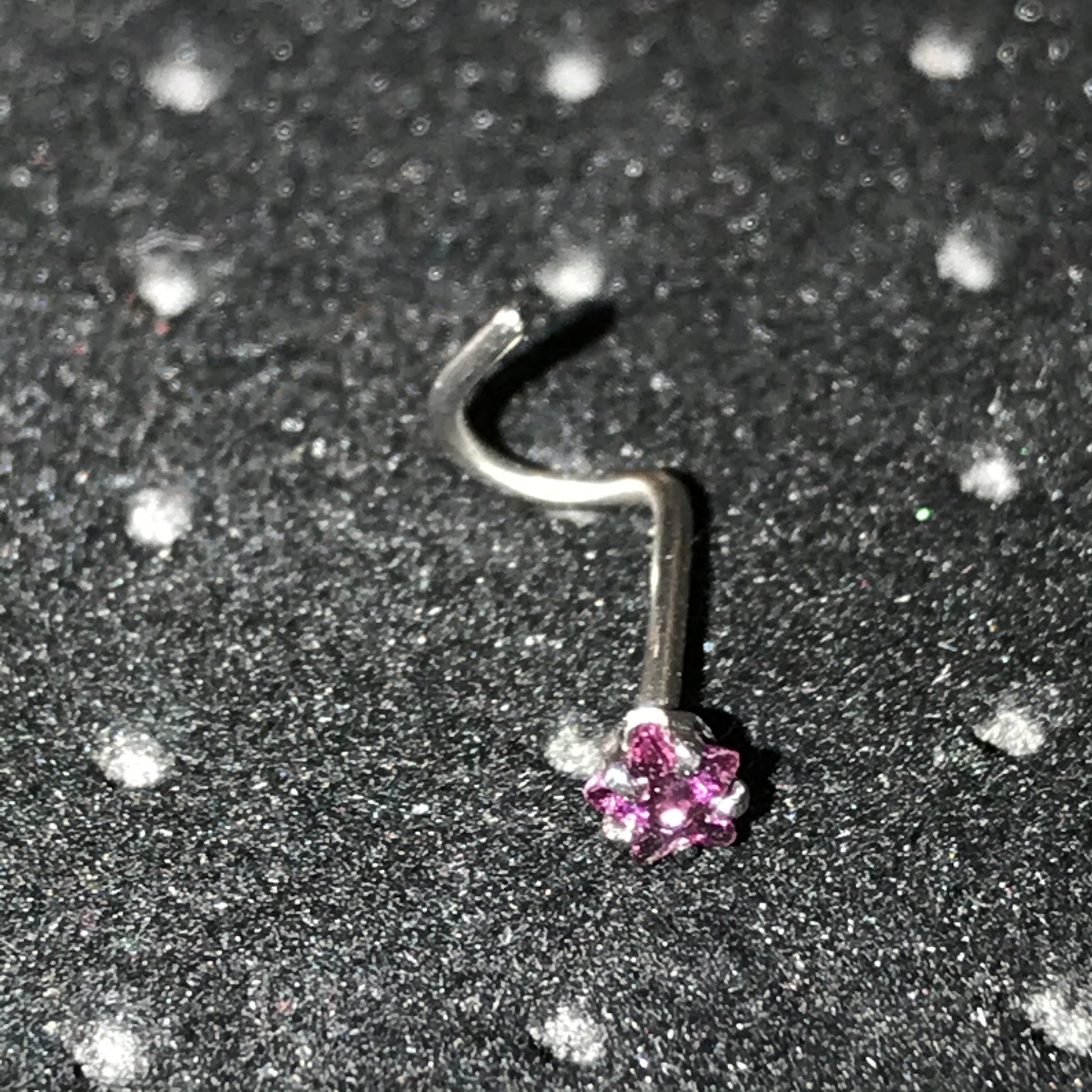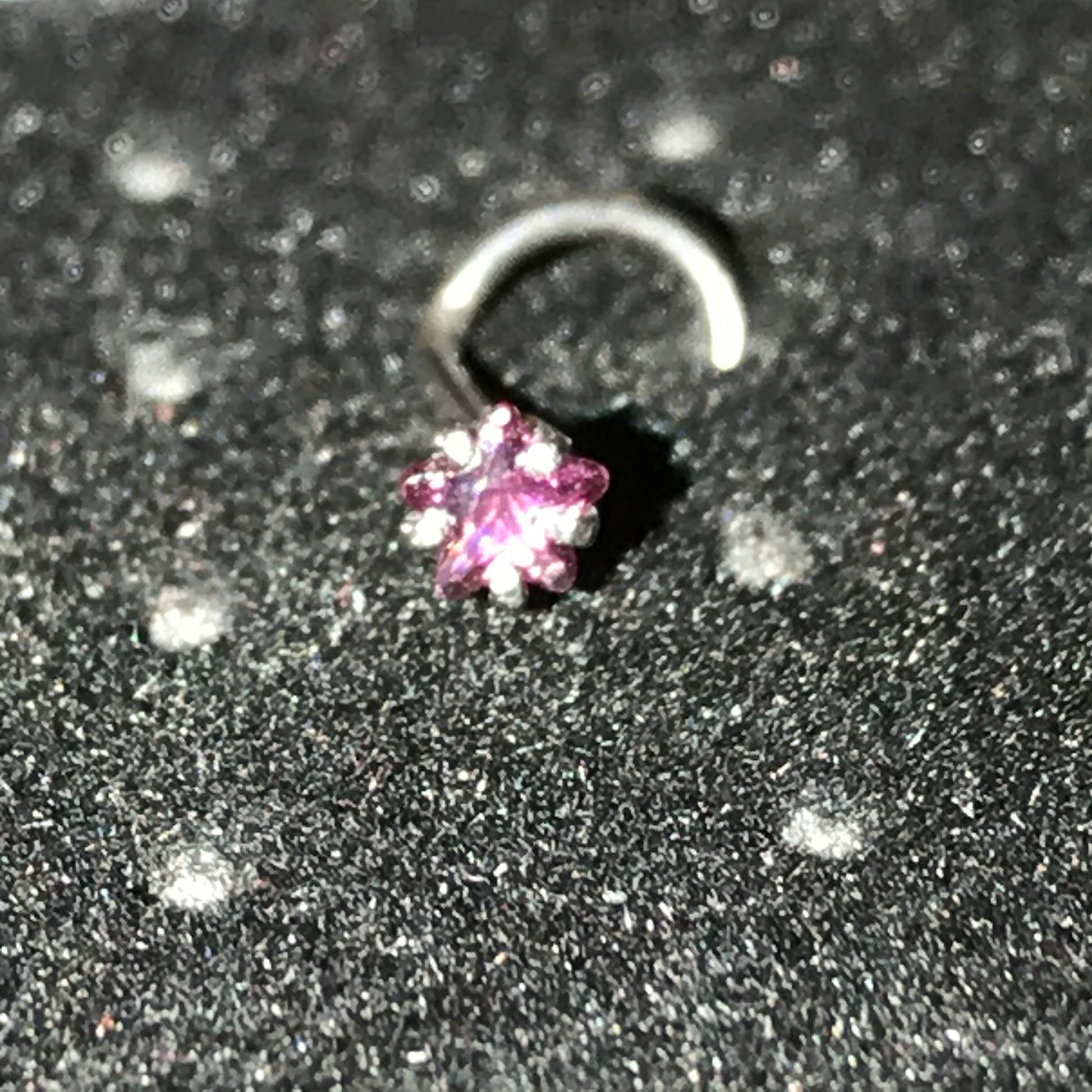 This is a 20 gauge curved nose ring with a amethyst purple colored rhinestone star gemstone in it. The nose ring is made out of 316-L Surgical Steel.