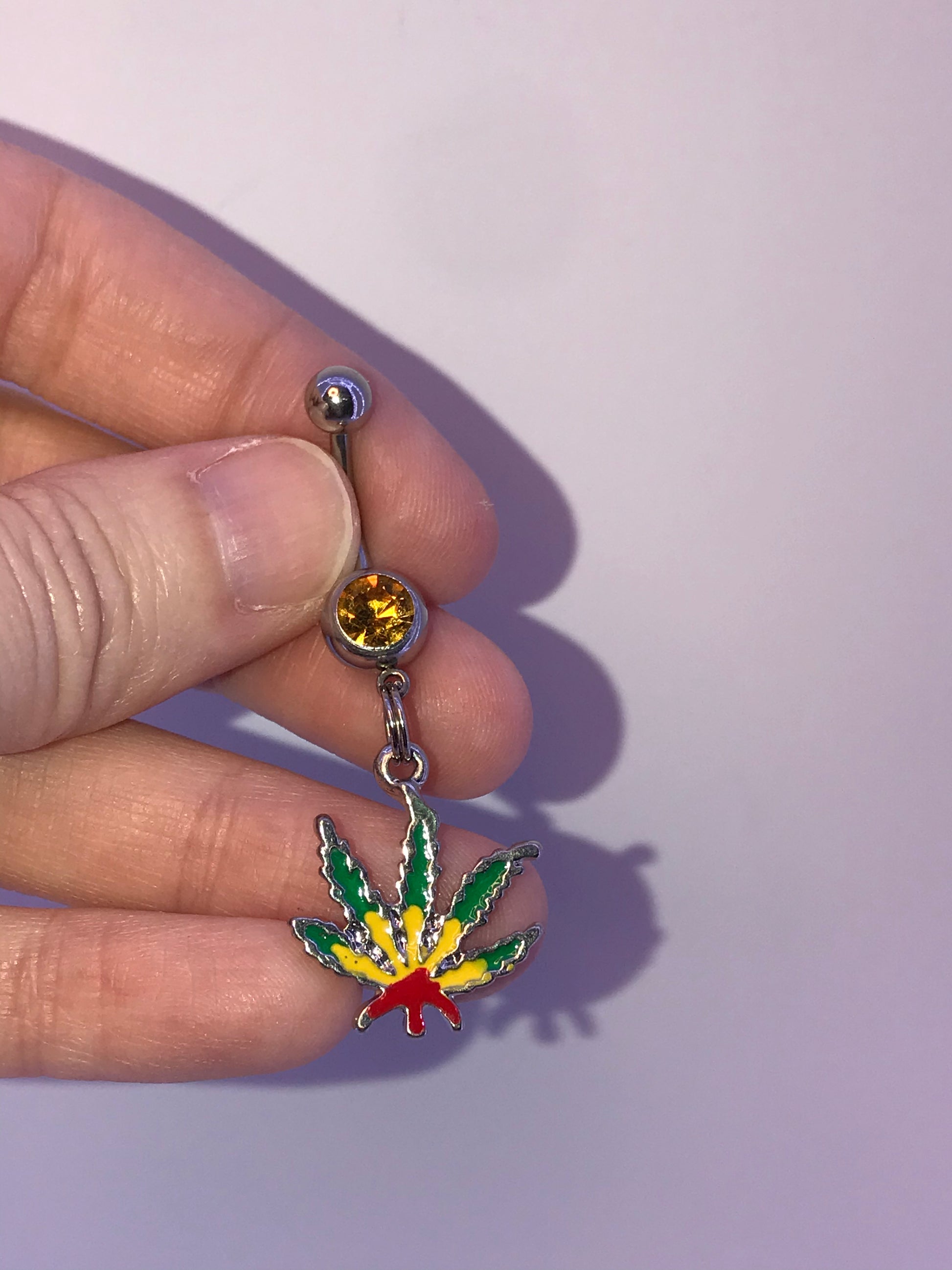 This is a 316-l stainless steel belly ring with a dangle of a Rasta colored pot leaf design. The ring in the middle is a split or spring ring. It's designed this way so your charm stays on your belly ring. The gem on the belly ring is a topaz orange color.