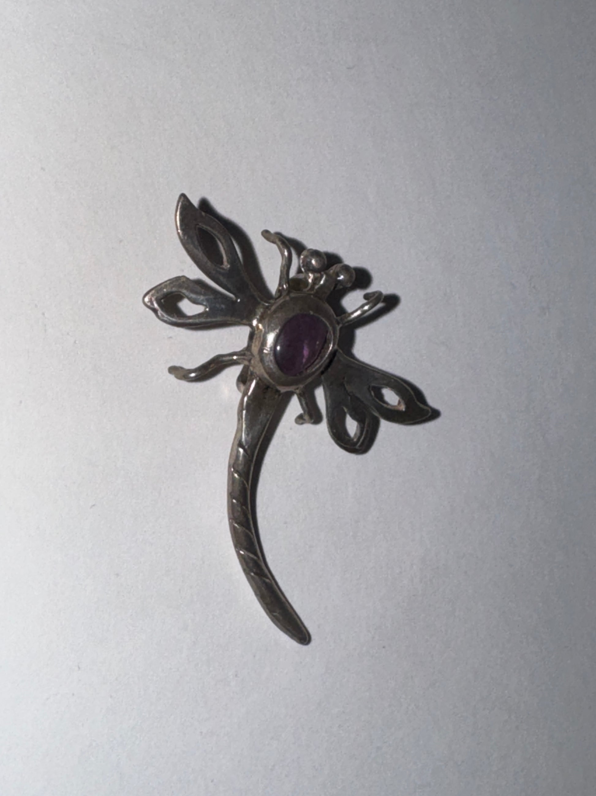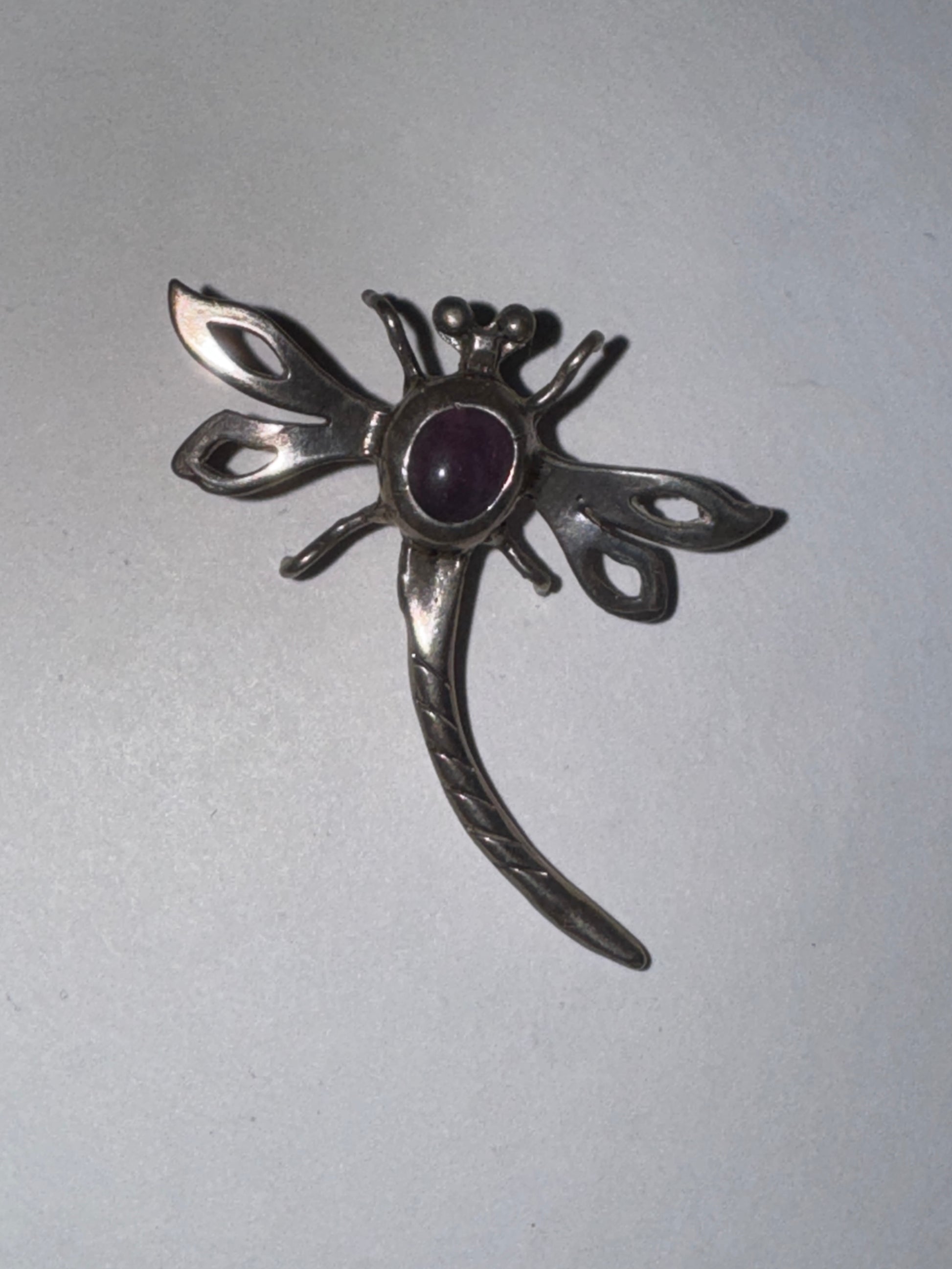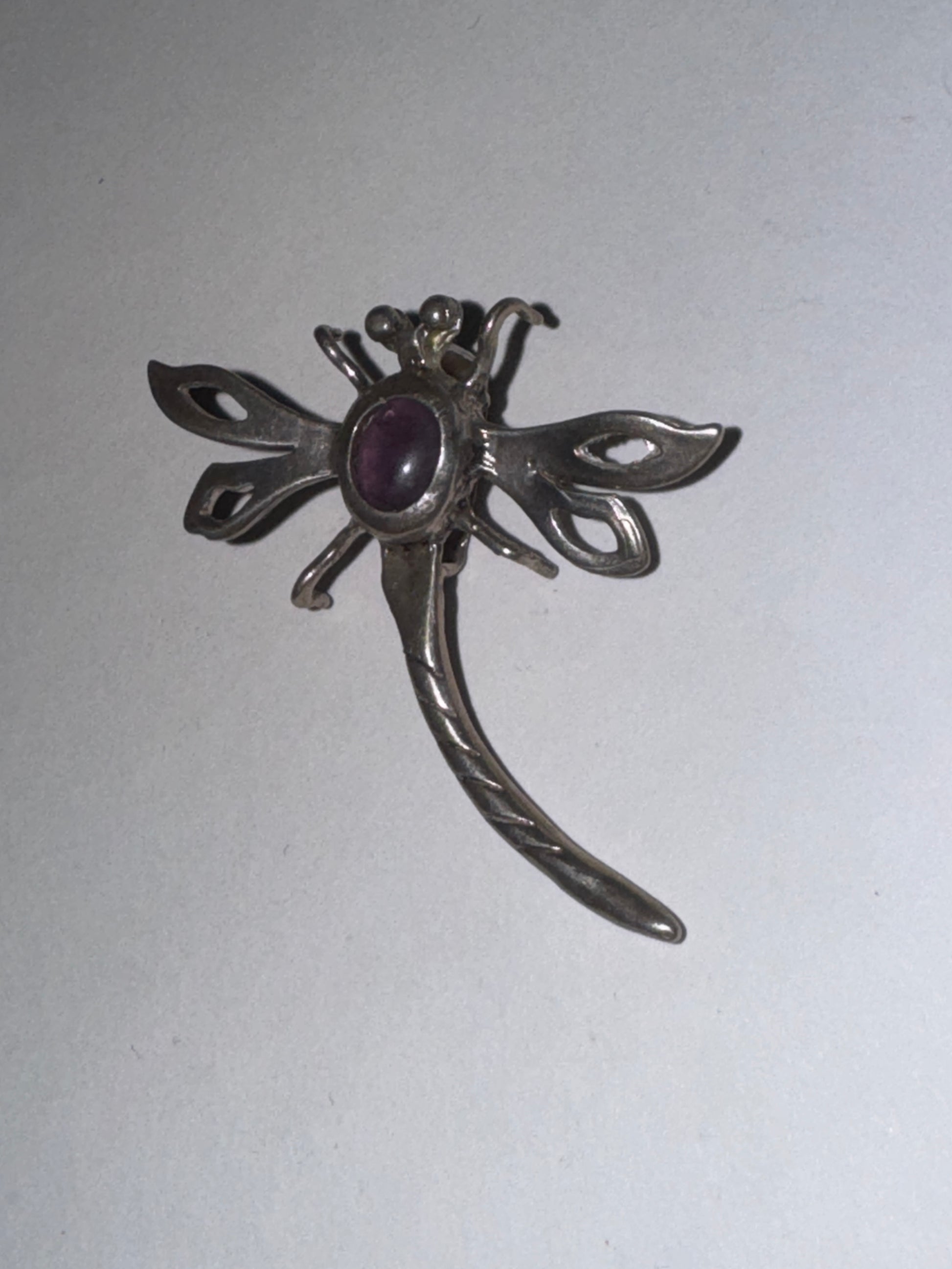 Solid sterling silver dragonfly pendant with a natural amethyst can inset in the center.