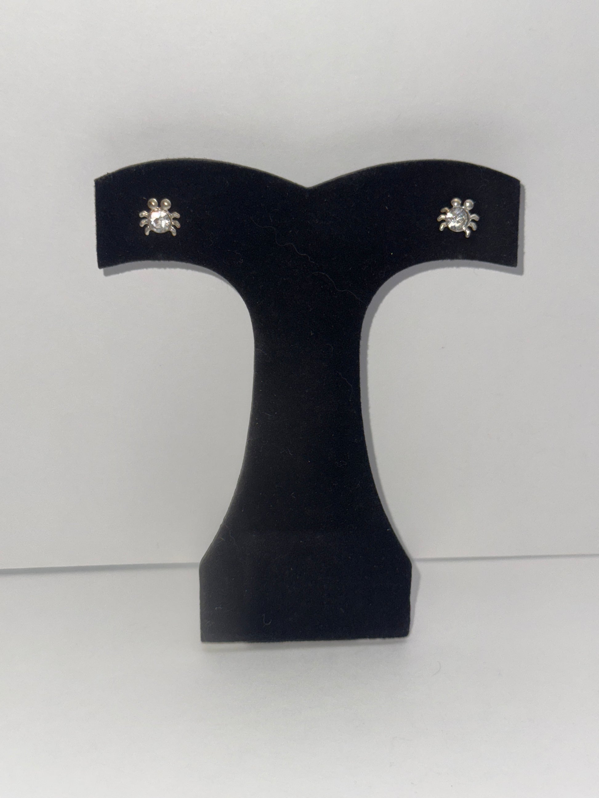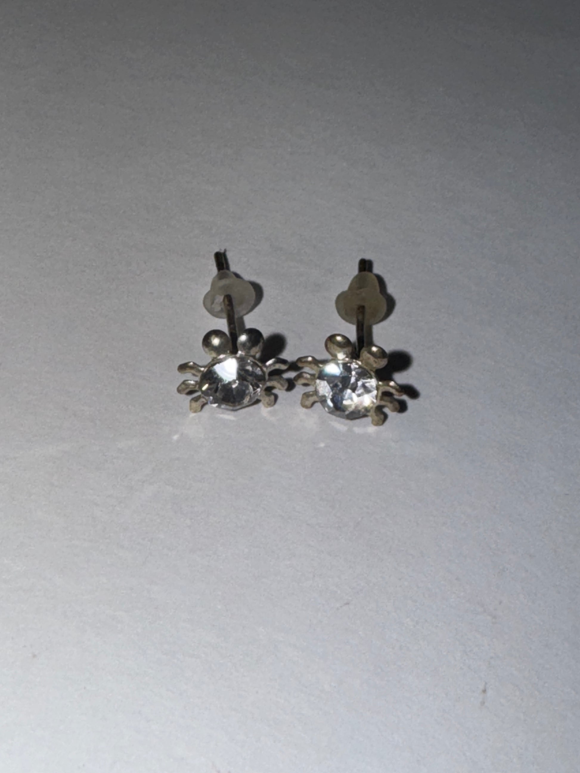 Solid sterling silver earrings shaped like a cute little spider with a rhinestone in the center. 8.25mm Spider Clear Cz and sterling silver post earrings. 4.63mm in size come with a silicone stoppers. The center Cz stone is actually 4.63mm. These will be shipped with an anti-tarnish paper in the baggie with the earrings so they don't tarnish as fast.