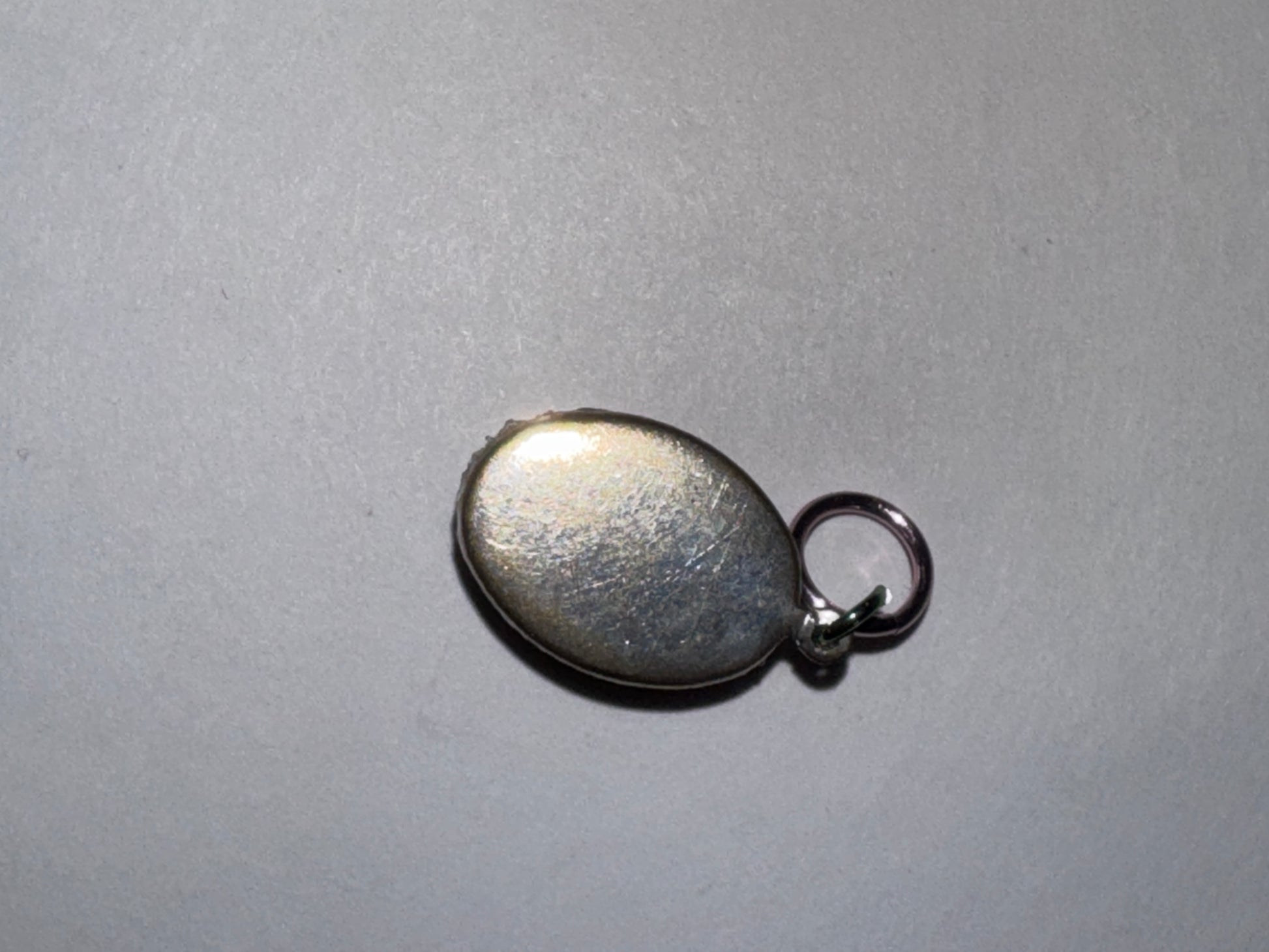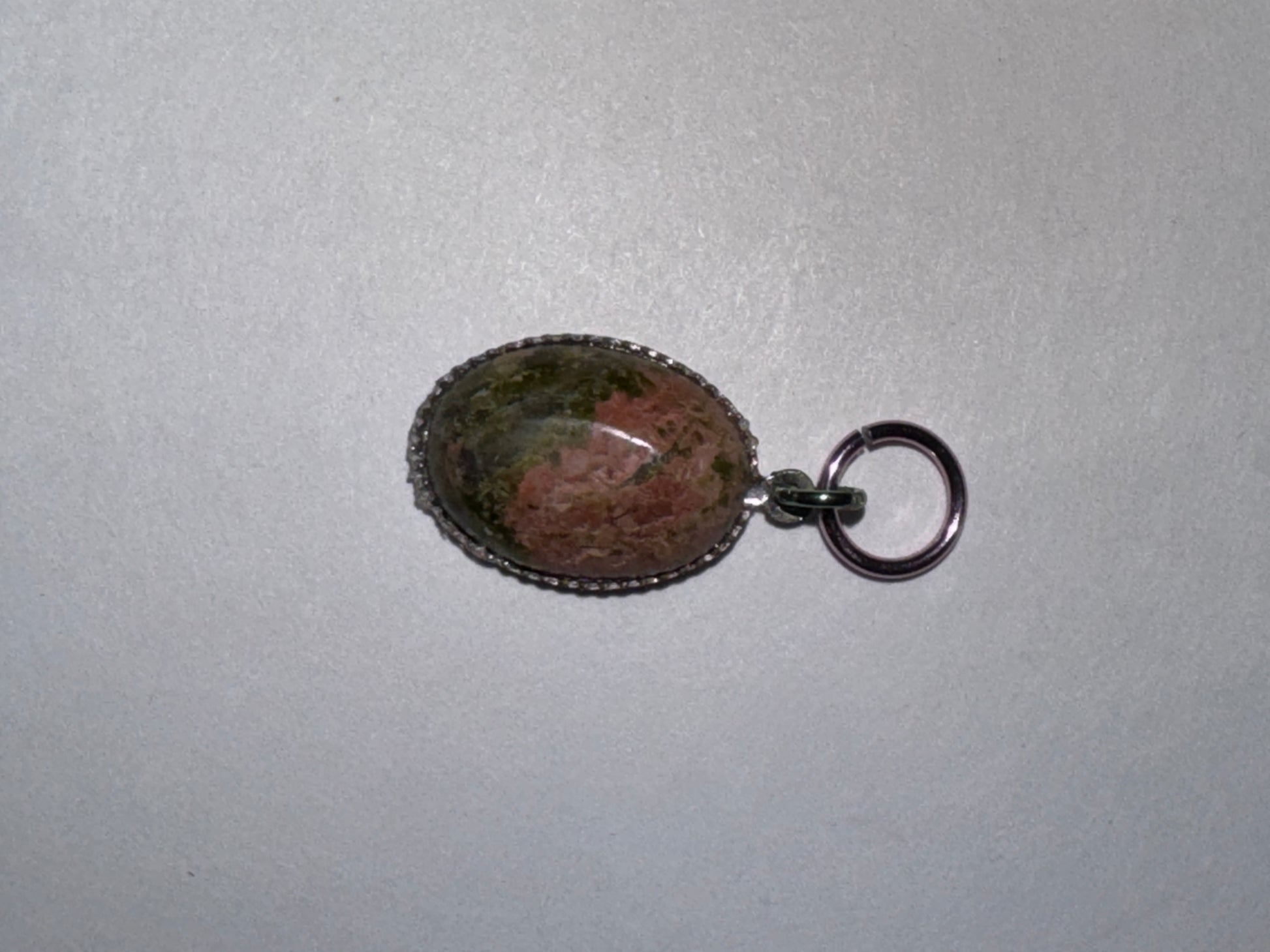 Oval Unakite Pendant. This is a handmade pendant. This pendant is set in a silver plated oval mounting and features 2 different sized anodized aluminum jump rings. One jump ring is pink the other is a light blue color.The stone measures 14.96mm tall, 11.14mm wide, and 5.20mm thick. This pendant weighs 1.51 grams.