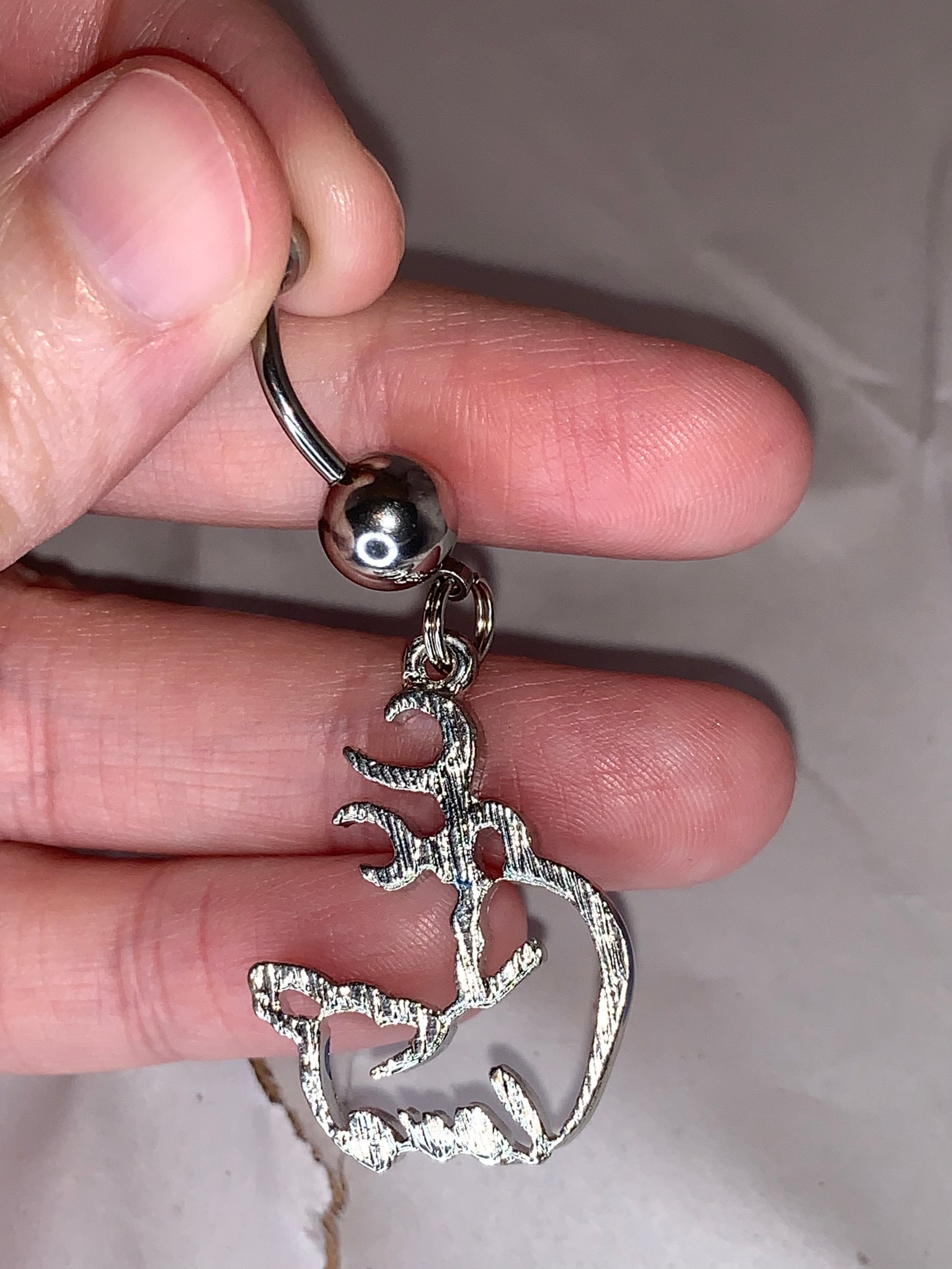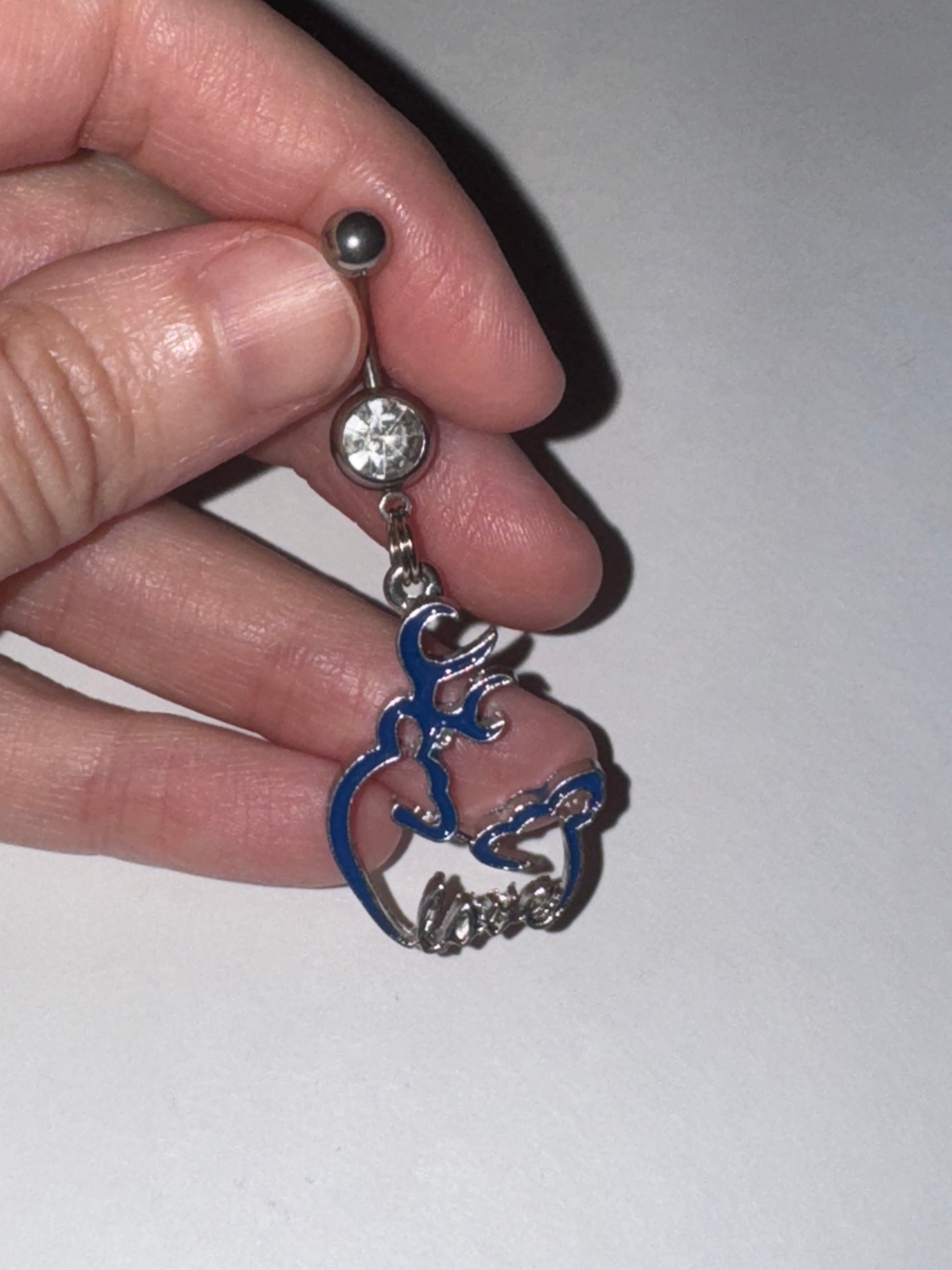 This belly ring is just straight steel with a Navy Blue Buck and Doe design at the bottom with the word Love.